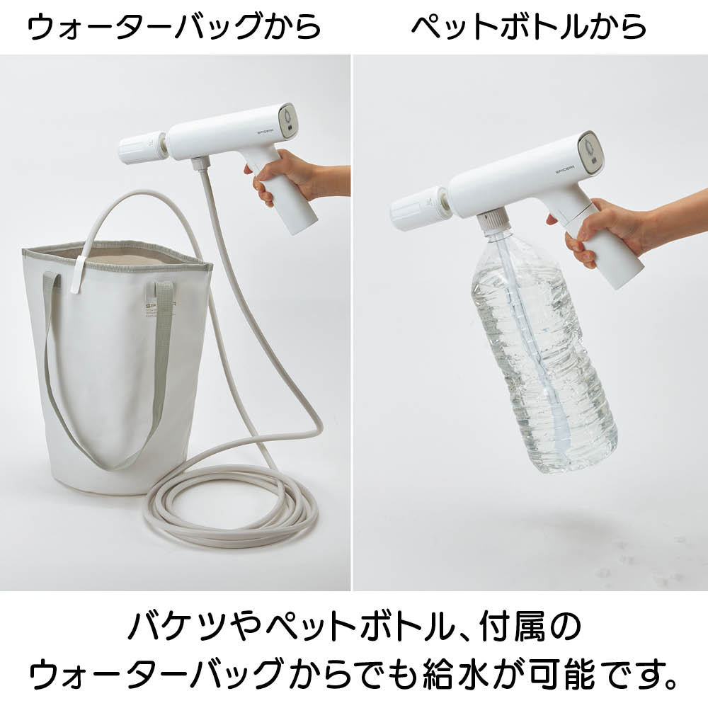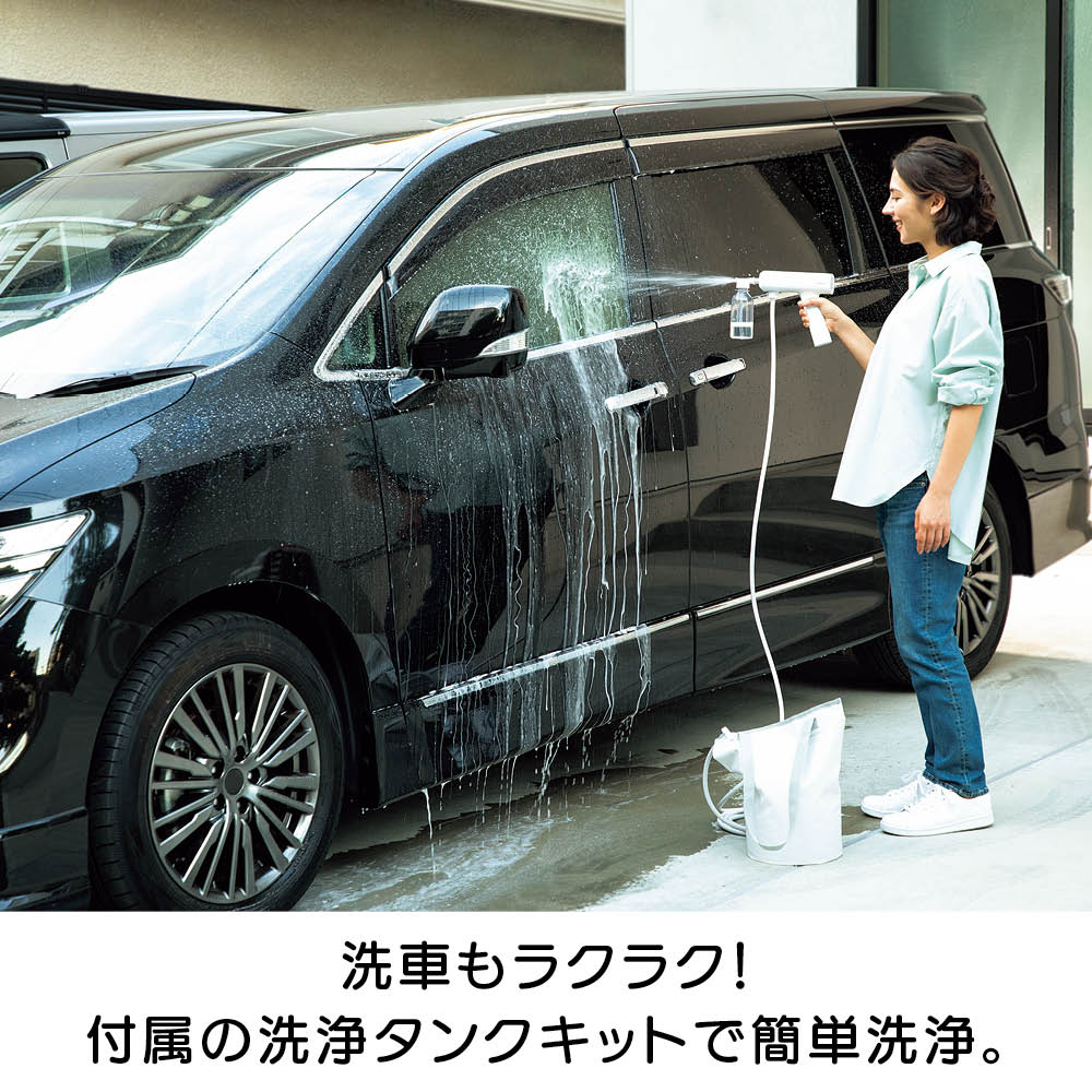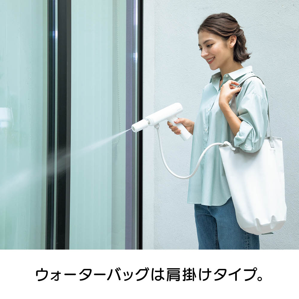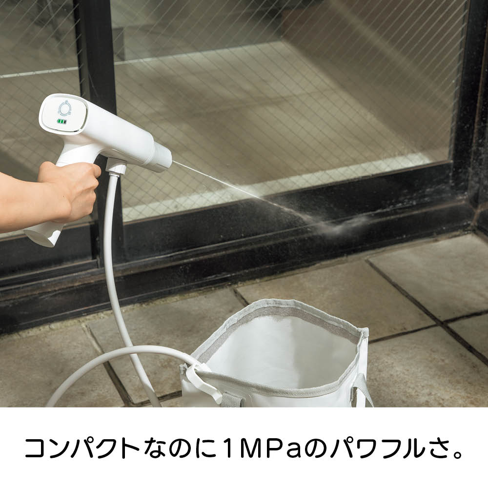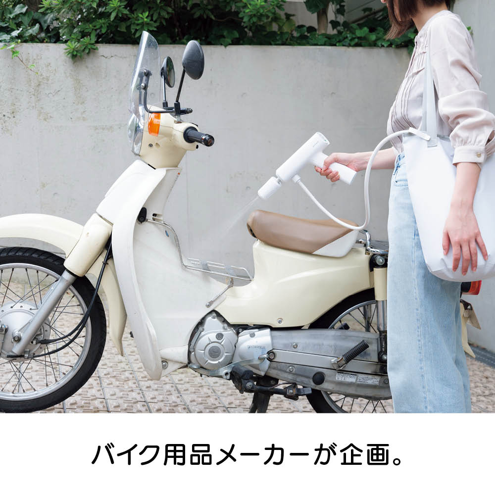 充電式なので、離れたコンセントから電源を確保する必要はありません。バケツやペットボトル、付属のウォーターバッグから給水できるので、水栓や長〜いホースも不要。ベランダや玄関、庭、お墓のお掃除、植物への水やり、キャンプの鉄板のお手入れなど、場所を選ばず手軽に使えます。軽量で扱いやすくベランダのお掃除もラクラク。本体重量800gと軽量。バケツやペットボトルから給水できるのでベランダでの使用にも便利。電源コードのために完全に閉めて掃除できなかった網戸やサッシもラクラクお掃除。バケツやペットボトル、付属のウォーターバッグからでも給水が可能です。コンセントも水栓も不要。バケツに貯めた水をホースで給水する方法のほかに、市販の2Lのミネラルウォーターのペットボトルを装着して給水することも可能。さまざまな場所で手軽に使用できます。バイク用品メーカーが企画。パワーの強い高圧洗浄機をバイクの洗浄に使用すると、露出している部品にダメージを与えることがありますが、本品は圧力が調整できますので、バイクの部品にダメージを与えずに洗車できます。ウォーターバッグは肩掛けタイプ。ウォーターバッグはショルダーストラップ付き。ウォーターバッグに水を入れて、上部を面テープで止めることで、肩にかけて使用する際に水がこぼれにくくなっています。※お使いいただく前に、付属のウォーターバッグ用のマニュアルをよくお読み下さい。