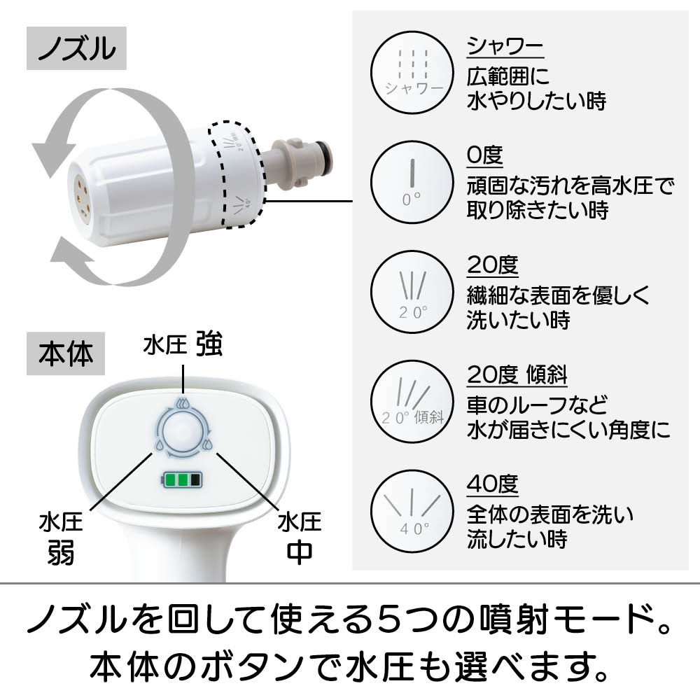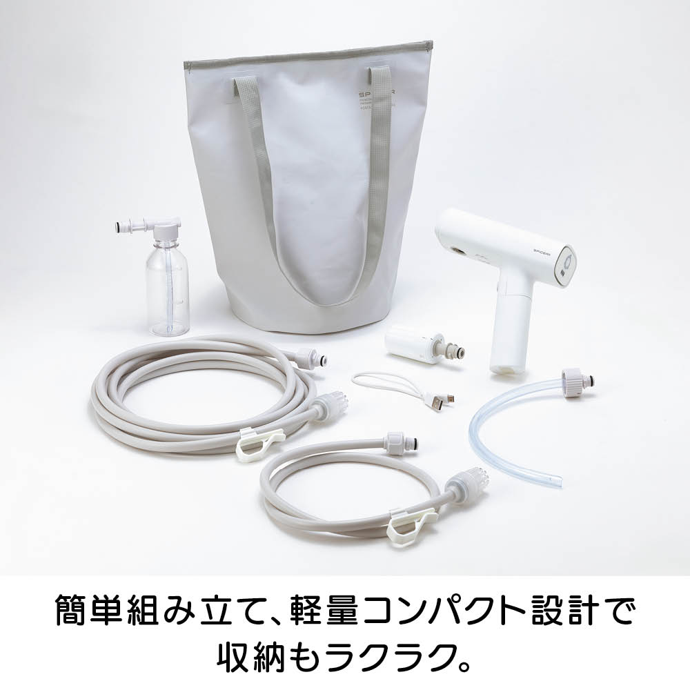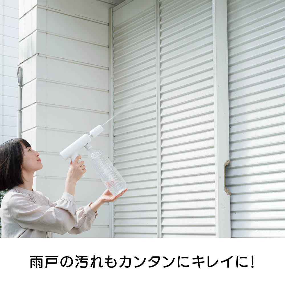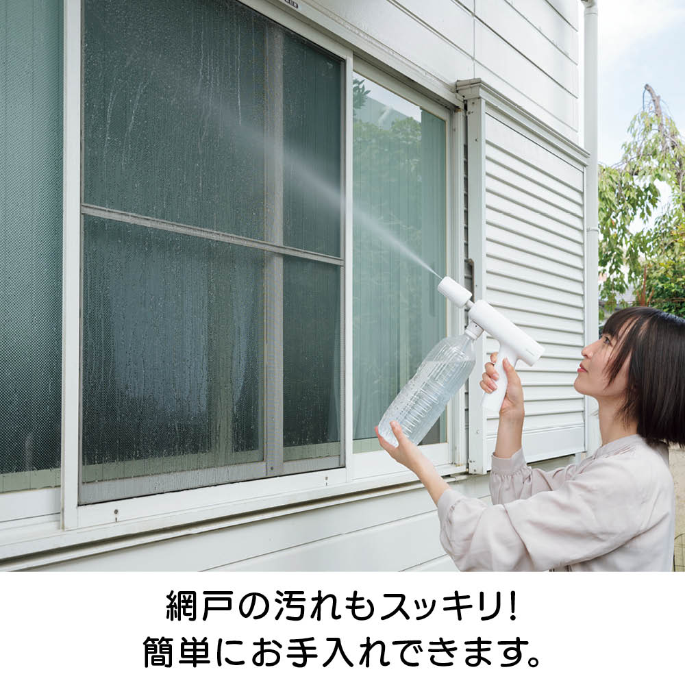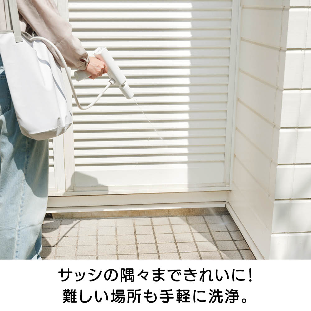 充電式なので、離れたコンセントから電源を確保する必要はありません。バケツやペットボトル、付属のウォーターバッグから給水できるので、水栓や長〜いホースも不要。ベランダや玄関、庭、お墓のお掃除、植物への水やり、キャンプの鉄板のお手入れなど、場所を選ばず手軽に使えます。軽量で扱いやすくベランダのお掃除もラクラク。本体重量800gと軽量。バケツやペットボトルから給水できるのでベランダでの使用にも便利。電源コードのために完全に閉めて掃除できなかった網戸やサッシもラクラクお掃除。バケツやペットボトル、付属のウォーターバッグからでも給水が可能です。コンセントも水栓も不要。バケツに貯めた水をホースで給水する方法のほかに、市販の2Lのミネラルウォーターのペットボトルを装着して給水することも可能。さまざまな場所で手軽に使用できます。バイク用品メーカーが企画。パワーの強い高圧洗浄機をバイクの洗浄に使用すると、露出している部品にダメージを与えることがありますが、本品は圧力が調整できますので、バイクの部品にダメージを与えずに洗車できます。ウォーターバッグは肩掛けタイプ。ウォーターバッグはショルダーストラップ付き。ウォーターバッグに水を入れて、上部を面テープで止めることで、肩にかけて使用する際に水がこぼれにくくなっています。※お使いいただく前に、付属のウォーターバッグ用のマニュアルをよくお読み下さい。
