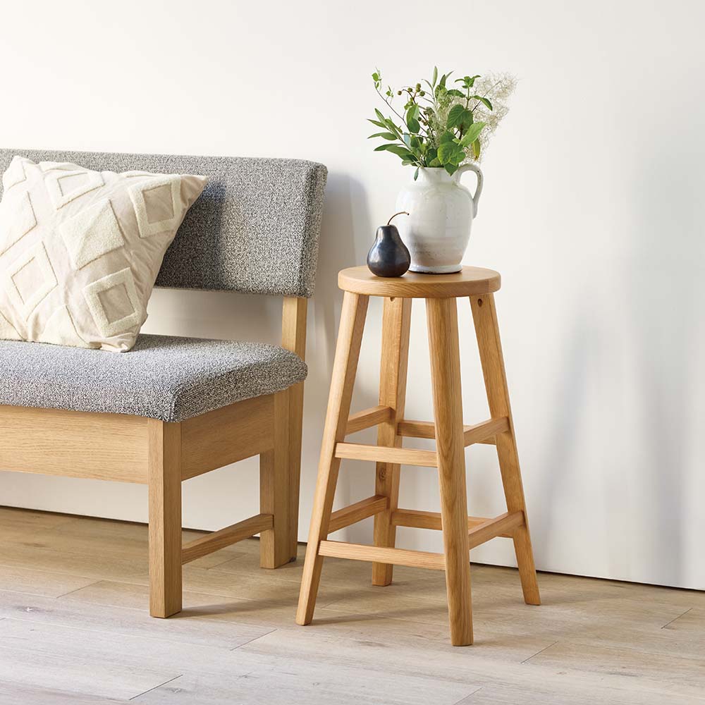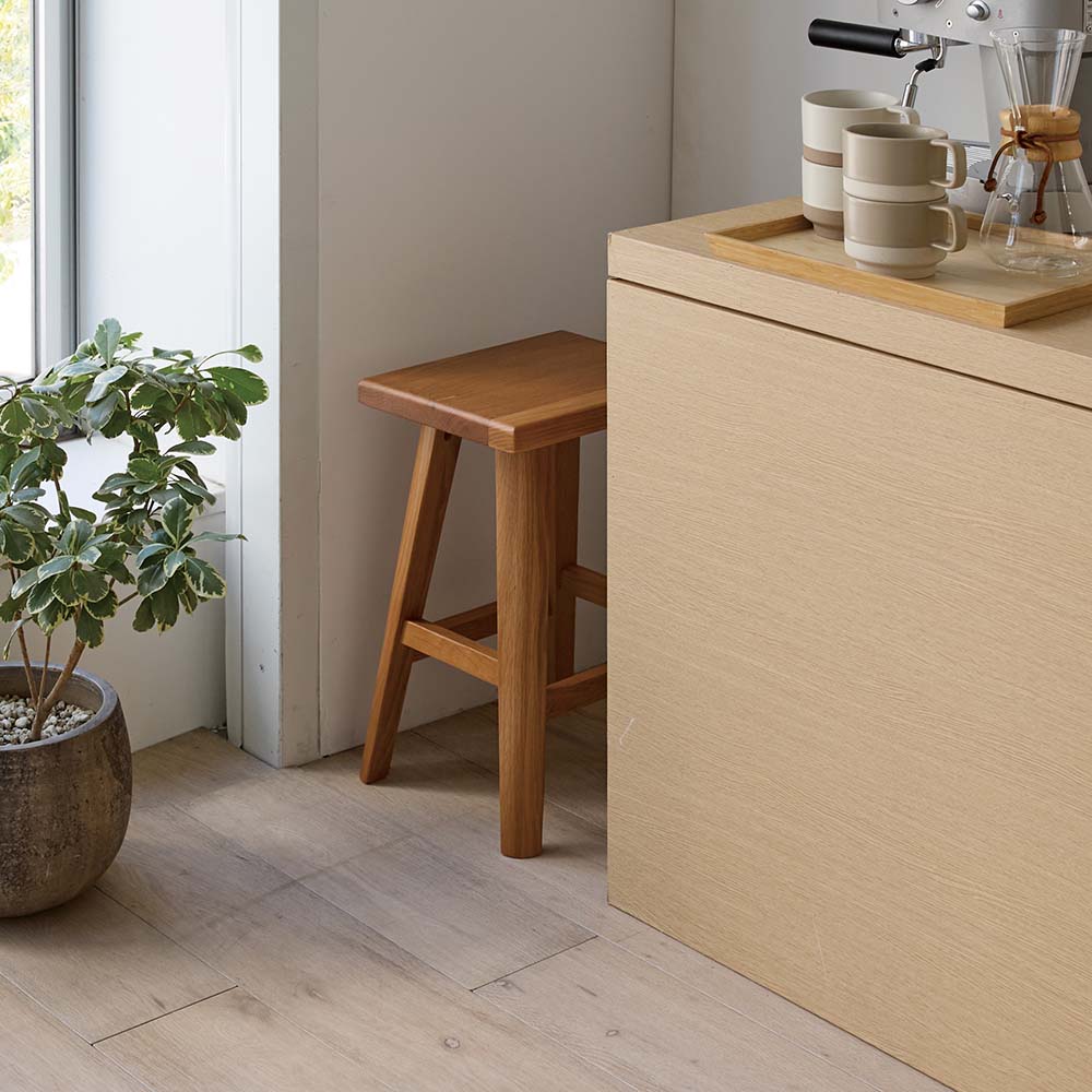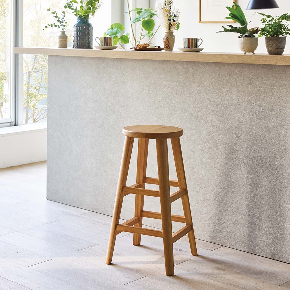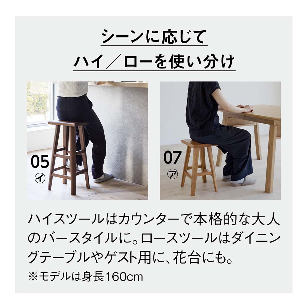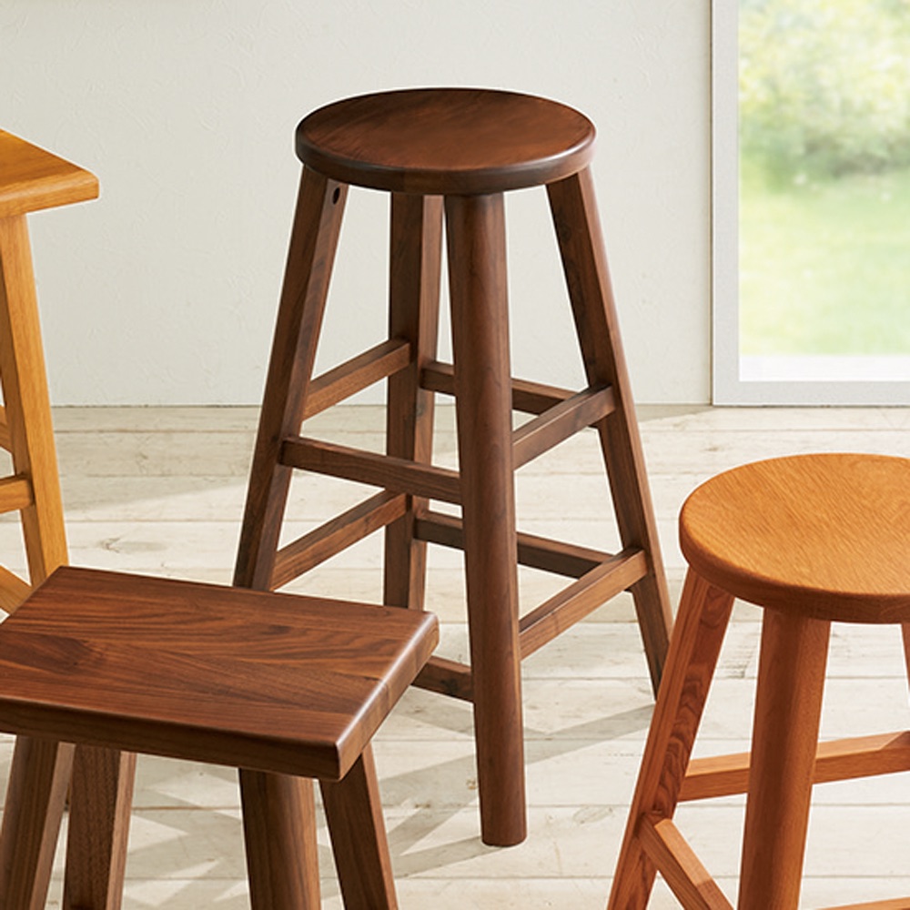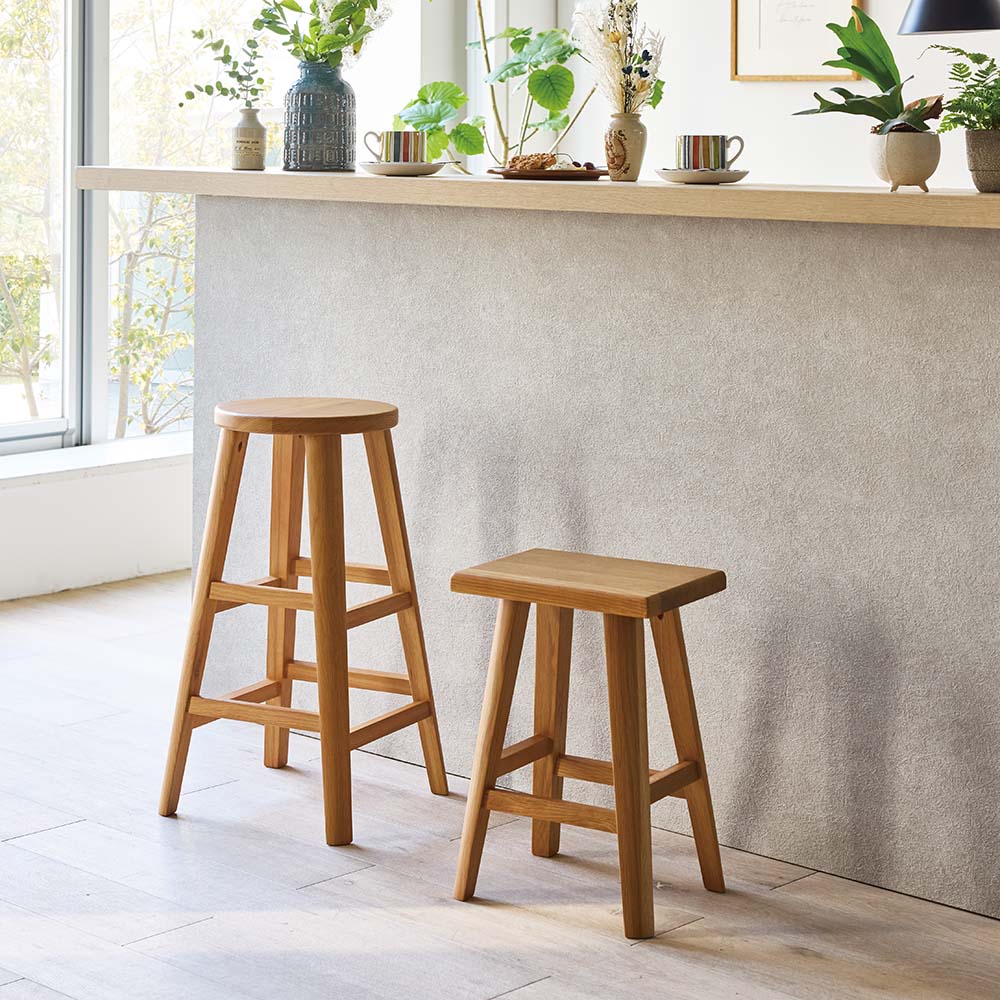 オーク/ウォルナット天然木の無垢材をふんだんに使った、リッチ仕立ての上級スツール。コンパクトでちょうどよいサイズなので、デスクやダイニングテーブルと合わせたり、コンソールや花台としてなど、さまざまなエリアで活躍します。オーク/ウォルナットの無垢材を贅沢に使用天然木の木目が高級感と上質さを感じさせます。置くだけでインテリアになる腰掛け椅子です。縁を丸くデザインしており、角がないので、脚当たりも快適です。置く場所を選ばない、ちょうどいいサイズの椅子ベットサイドやソファーサイド、洗面所、リビングやキッチン横、廊下やダイニング、玄関などの省スペースでも使いやすいサイズ感です。重量は4kgと軽量で軽く持ち上げやすいので、ちょっと邪魔になった時は簡単に場所を動かせる点も魅力です。棚のない玄関回りの荷物置きとしても便利なアイテムハイタイプは本体高さ60cmなので、キッチンカウンタ―と合わせるなど、ハイチェアとして使うのにちょうど良い高さです。ロータイプは本体高さ43cmでダイニングテーブルとぴったりの座面高。省スペースなサイズ感で、靴を脱ぐ際の腰掛としては勿論、座面がフラットなのでかばん置きやコンソールとしても活用できるスツールです。出かける際によく持ち出すバッグをひとまとめにして置いておけば、さっとお出かけができて時短に。水や汚れに強い塗装を施しました本体には、ウレタン塗装を施しました。水や汚れに強く、お手入れも簡単です。水に強い仕上げなので、洗面所、洗面台など水回りにも置けるのが嬉しいポイントです。面倒な組み立てのいらない完成品完成商品でのお届けになります。届いたその日からすぐにご使用いただけます。