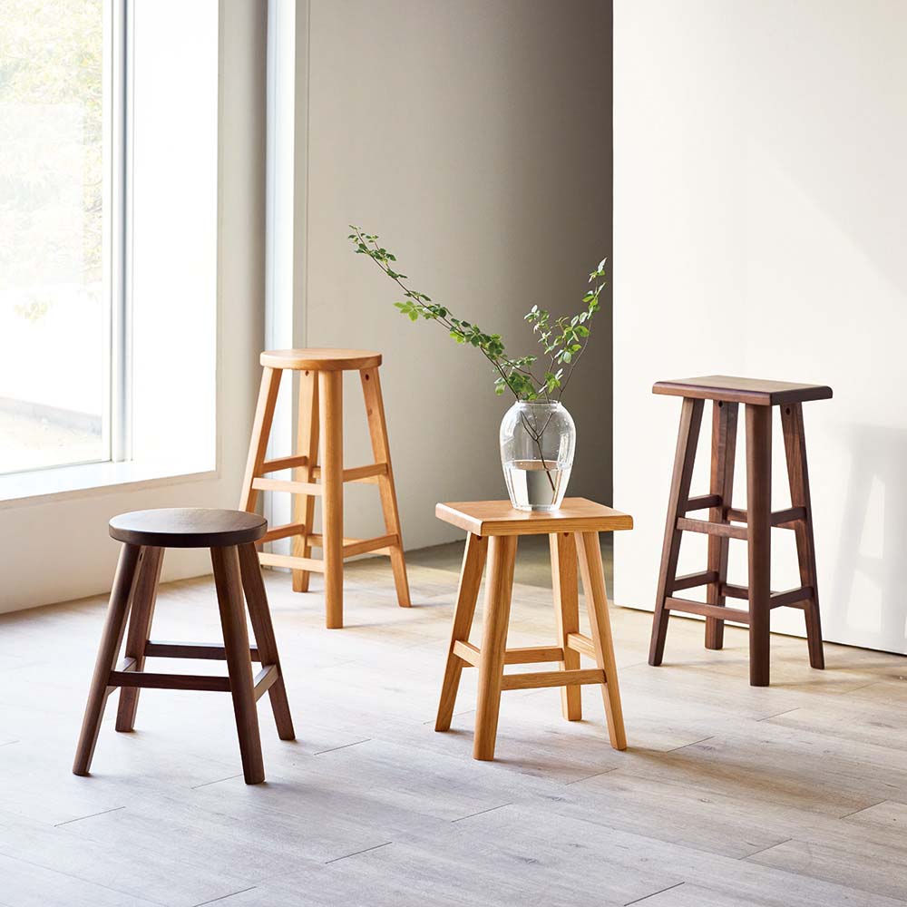 高さと形が選べる天然木スツール ※左から 丸型ロータイプ、丸型ハイタイプ、角型ロータイプ、角型ハイタイプ