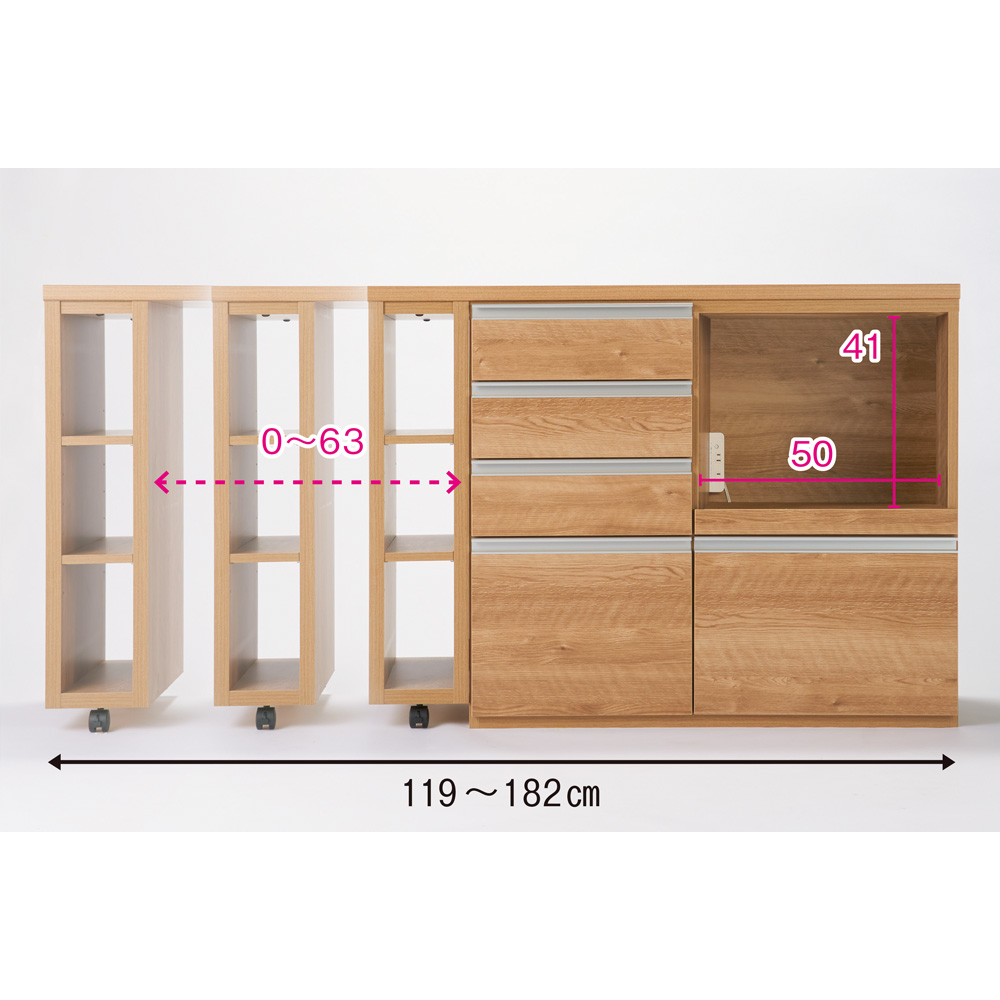 限られたスペースに合わせて伸長式して、気になるすき間にもフィットします。水・汚れに強いステンレス天板で作業台としても。下部オープンスペースにごみ箱が収まるのも魅力。バーカウンターにもなる裏面化粧仕上げ(一部タッカーが見えます)のキッチン収納。限られたスペースにぴったりフィット ステンレス天板スライド伸長式カウンター幅の調節が可能なキッチンカウンター。天板をスライド伸長すれば作業スペースが広がるだけでなく、気になるすき間にもフィットします。天板は水・汚れに強いステンレス製でお料理にもいいですよね。背面も化粧されている(一部タッカーが見えます)のでバーカウンターとしても使えるアイデアキッチン収納です。すき間収納いらずの幅119〜182cmで使える伸長式◆天板はキャスター付きで簡単にスライドして伸長させることができるので狭いキッチンにもぴったり。◆左右どちらにでもスライド移動が可能です。ご自宅のキッチン環境に合わせてご使用いただけます。◆天板を伸長すれば作業スペースが広がるだけでなく、気になるすき間も埋められます。◆キャスターのストッパーをロックすれば天板が固定するので安心。ごみ箱収納スペースも確保できる、下オープンのキッチン収納庫◆スライド天板下は床上収納が可能な下オープン設計。◆ゴミ箱や重たい段ボール、スツールなどの定位置にぴったり。ステンレス天板で清潔、明るいキッチンに◆キラリと光るステンレス天板は汚れやすい台所の味方。水汚れに強く、さっと拭いてお手入れ簡単。◆ステンレス天板部までの高さは90cmで、作業台としても使いやすい高さです。◆家電置きスペースとしてはもちろん、調理台としてお使いいただくにもピッタリです。大型スチームレンジ対応!奥行45cmのレンジラック◆置き場所に困ってしまう大型スチームレンジを乗せることのできる家電台として使用できる設計。◆大型スチームレンジは通常のレンジに比べ奥行が広く、普通のレンジ台には収まらないことも。◆このシリーズの家電ラックは天板部分の奥行が45cmと広々。◆諦めていた大型レンジも乗せられる心強い家電収納です。◆もちろんコンセント付きでレンジラックとしてはもちろん、コーヒーメーカーなども。◆レンジ、トースター、炊飯器、ホットプレートなどキッチン家電は全てまとめて収納できます。美しくある為に細部にまで配慮したおしゃれなキッチンカウンター◆(ア)ホワイトの前面には水ハネや油ハネにも強い素材を使用しています。◆(イ)ブラウンは今時の内装材に多い、リアルで大きな木目柄。すり傷などに強い強化紙を使用。◆背面も化粧されている(一部タッカーが見えます)ので間仕切りとしてもご使用いただけます。整頓しやすい引き出しの秘密で誰でも収納上手に。◆たくさん小分けされた小引き出しで、何かと大きさがバラバラなキッチン用品を整理整頓◆食品ストッカー・キッチンストッカーとしても優秀です。◆すべての引き出しにストッパー付きスライドレールを装備し、滑らかに開閉できるので安心です。ほこりの溜まりやすいもたつく配線はすっきりしまう クリーンなキッチンの味方◆家電を収納する以上、配線は重要な問題です。カウンター自体が美しくとも、コードがごちゃついているようでは台無し。◆配線コードを内部に通し、側面床付近に設置したコード穴から出すことで、コードを目立たせず床に這わせることが可能に。◆間仕切りとしてはもちろん、壁際に設置する際にも、壁面にぴったりくっつけることが出来て便利。◆レンジ、トースター、炊飯器などキッチン家電は全てこれ1台にまとめて収納できます。信頼と安心の国内工場での生産品(日本製)◆国内の職人がひとつずつ丁寧に仕上げた食器棚・カップボードです。◆細部の丁寧な仕上がりなど、国産品ならではの高品質なダイニングボード・キッチンボード・キッチンラックをお楽しみください。◆お届け後、箱から出してキャスターを付けるだけで使える完成商品です。