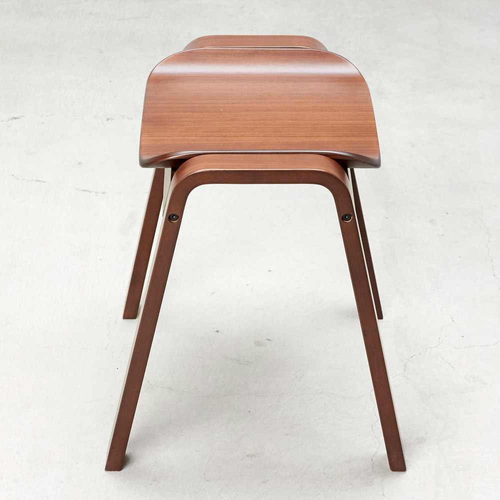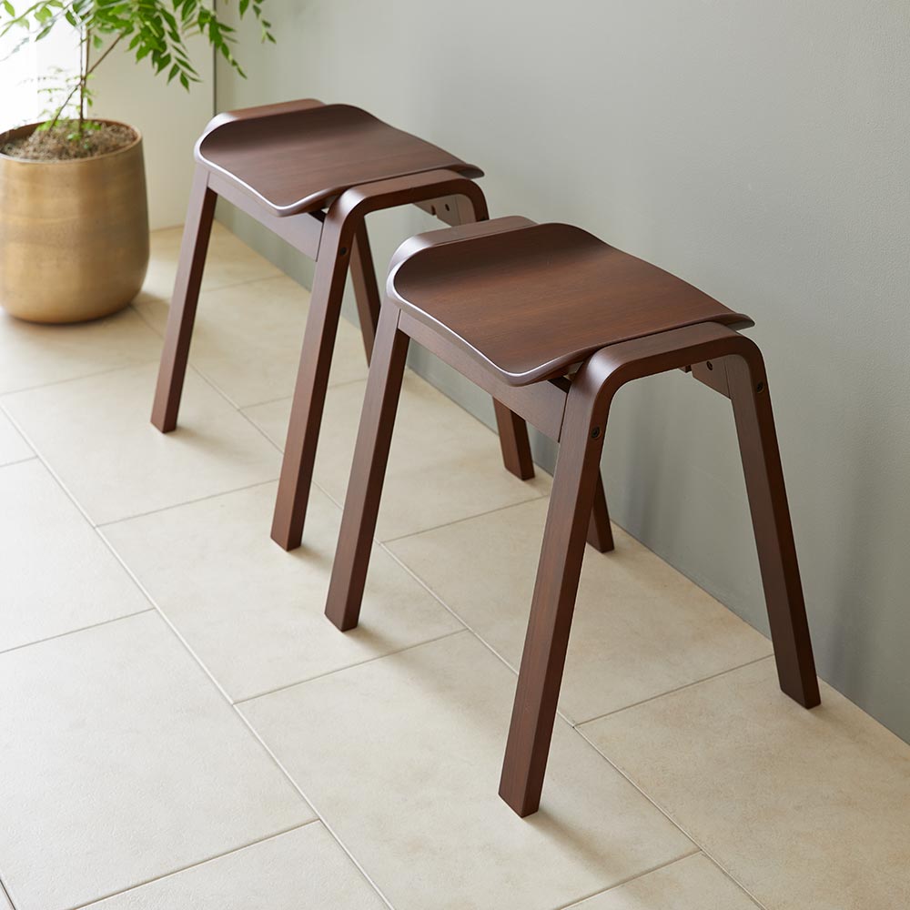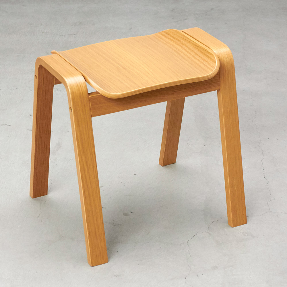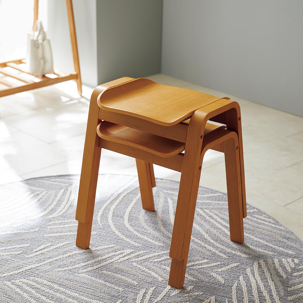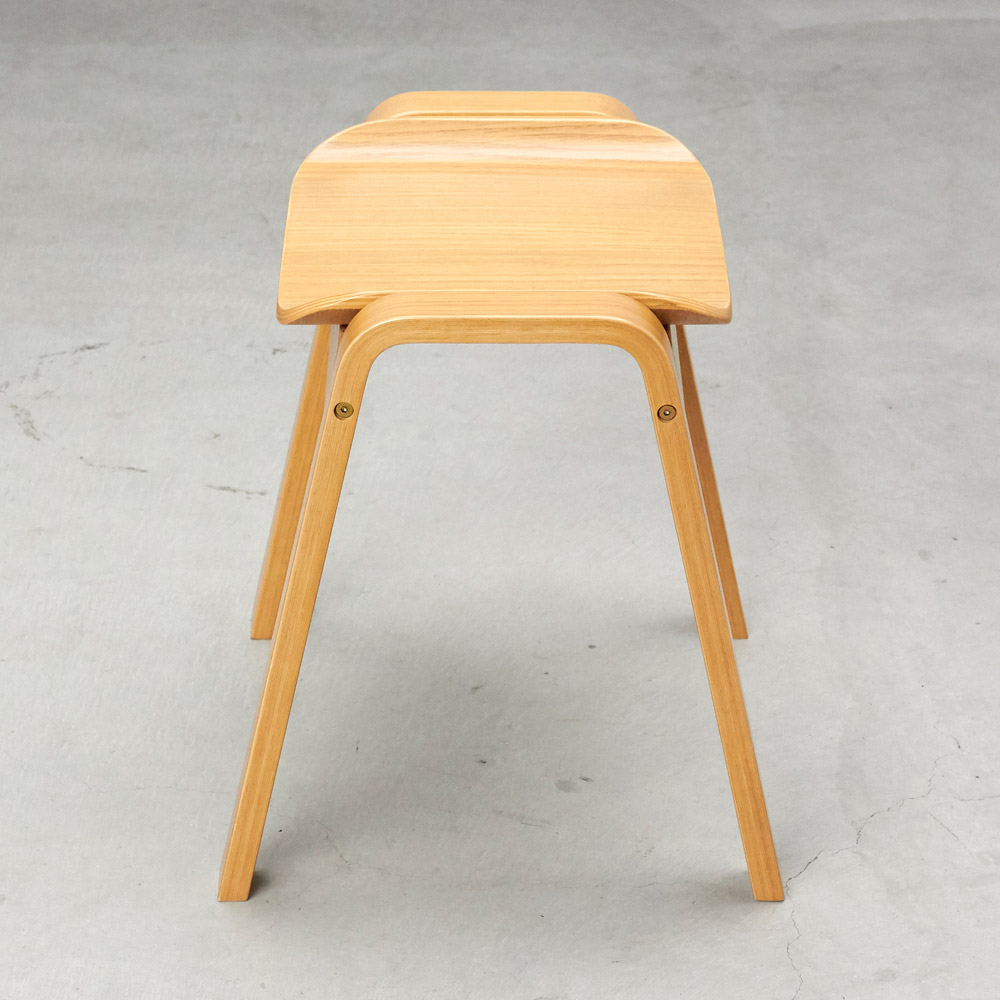 座面も天然木で仕立てたなめらかなフォルムが目をひく一脚。腰掛けはもちろん、ものを置くだけでも様になる佇まいが魅力的。材はオーク天然木(ナチュラル色)、ウォルナット天然木(ブラウン色)をご用意。スタッキングができる2脚組でのご提供です。座面も天然木で仕立てたなめらかなフォルムが目をひく一脚。 椅子の本質にこだわったシンプルなデザインのベンチ型のシンプルな木製スツール、フレームと座面の一体感や、脚部などの各部のスケール感などにこだわり、美しくなめらかに見えるシルエットにまとめあげたデザインです。座りやすく座面設けられたカーブと、スタッキング可能なデザインが特徴です。急な来客時に便利なダイニングの予備チェアとして、靴の脱ぎ履き用の玄関の腰掛けとして、パウダルームや寝室のドレッサー用など様々なシーンで活躍してくれます。■木種は2種類をご用意しております。どこにおいてもしっかり馴染む特徴のオーク(ナチュラル色)、シックな色目のウォールナット(ブラウン色)の2種。■スリムな上にスタッキングが可能です。脚数が必要な場合の予備椅子などでもコンパクトに収納可能です。収納した時の姿も美しく見るようにデザインをしました。■450mmと一般的な座面の高さですのでダイニングでもご利用頂けます。その他、玄関の腰掛けとして、パウダルームや寝室のドレッサー用など様々なシーンで活躍してくれます。■座面と脚部フレームの接合部のディテール、スタッキング時の姿など、椅子の本質にこだわりました。■スリムなので圧迫感がなく、座面のカーブが座りやすいデザインです。