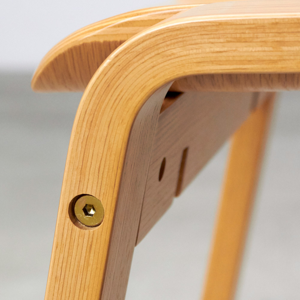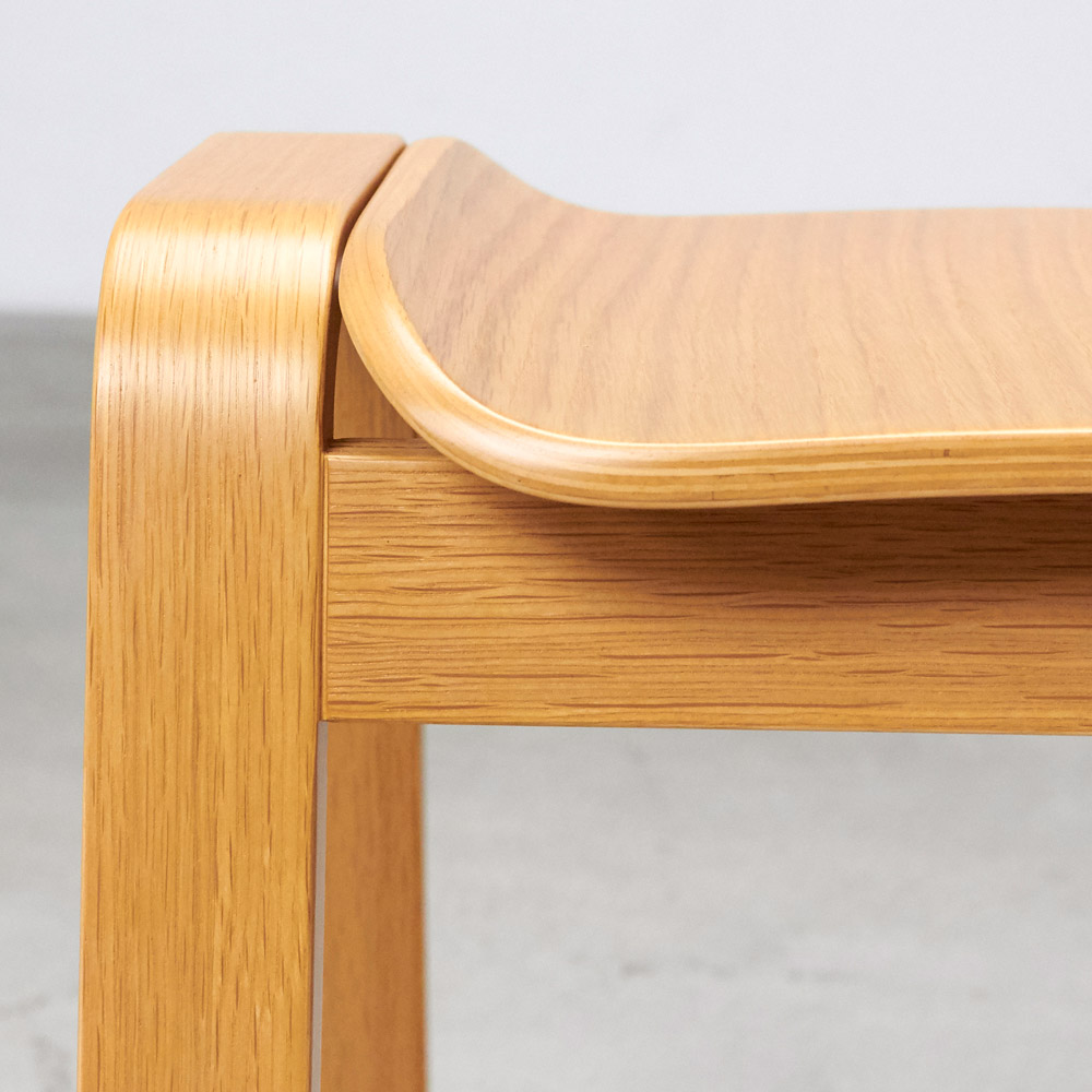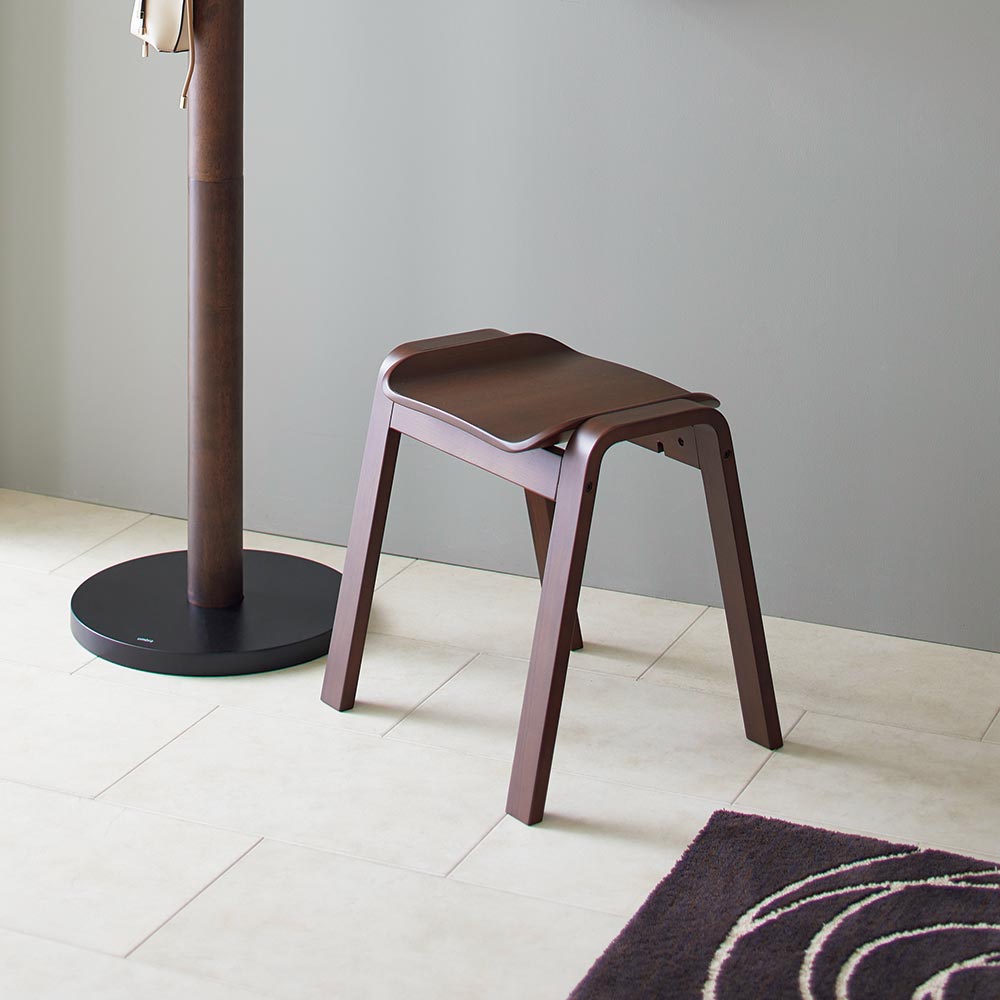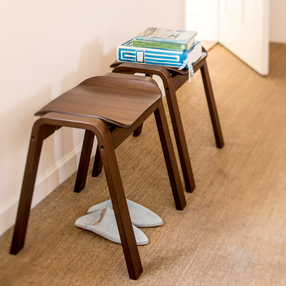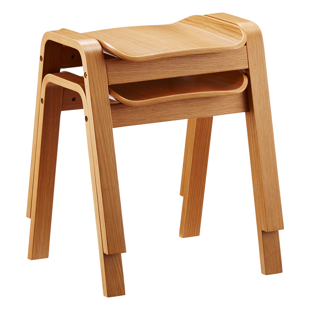 座面も天然木で仕立てたなめらかなフォルムが目をひく一脚。腰掛けはもちろん、ものを置くだけでも様になる佇まいが魅力的。材はオーク天然木(ナチュラル色)、ウォルナット天然木(ブラウン色)をご用意。スタッキングができる2脚組でのご提供です。座面も天然木で仕立てたなめらかなフォルムが目をひく一脚。 椅子の本質にこだわったシンプルなデザインのベンチ型のシンプルな木製スツール、フレームと座面の一体感や、脚部などの各部のスケール感などにこだわり、美しくなめらかに見えるシルエットにまとめあげたデザインです。座りやすく座面設けられたカーブと、スタッキング可能なデザインが特徴です。急な来客時に便利なダイニングの予備チェアとして、靴の脱ぎ履き用の玄関の腰掛けとして、パウダルームや寝室のドレッサー用など様々なシーンで活躍してくれます。■木種は2種類をご用意しております。どこにおいてもしっかり馴染む特徴のオーク(ナチュラル色)、シックな色目のウォールナット(ブラウン色)の2種。■スリムな上にスタッキングが可能です。脚数が必要な場合の予備椅子などでもコンパクトに収納可能です。収納した時の姿も美しく見るようにデザインをしました。■450mmと一般的な座面の高さですのでダイニングでもご利用頂けます。その他、玄関の腰掛けとして、パウダルームや寝室のドレッサー用など様々なシーンで活躍してくれます。■座面と脚部フレームの接合部のディテール、スタッキング時の姿など、椅子の本質にこだわりました。■スリムなので圧迫感がなく、座面のカーブが座りやすいデザインです。