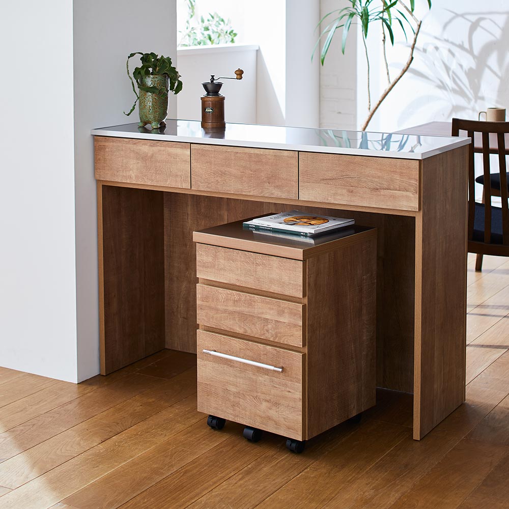 スペースを有効活用できる間仕切りカウンターとレンジ台。ステンレス天板だから、作業台としても活躍。窓下に置いたり、アイランドキッチンのように間仕切り使いにしたり、スペースに合わせて使い方は自在です。天然木調の風合い、シャープなステンレス天板●高級感ある佇まいが、落ち着いたキッチン収納を演出します。●おしゃれなシステムキッチンにぴったりのデザインです。●お部屋のインテリアをナチュラルモダンにされている方におすすめです。ポイント(1)空間を仕切れる、間仕切り仕上げのキッチンカウンター●本体の背面も前面と同じ木目調にすることで空間の中央にも置くことができます。●お手軽にアイランド型キッチンをが作れるのでお部屋のレイアウトの幅が広がります。●2台並べて設置すると、ダイニングとの空間を分けるのに便利です。ポイント(2)調理台に使える、使い勝手のよいステンレス素材●調理スペース、お皿を置くスペースが足りない方にはステンレス天板が便利。●引き出し付きのカウンタータイプはキッチンの収納も増えて1台2役です。