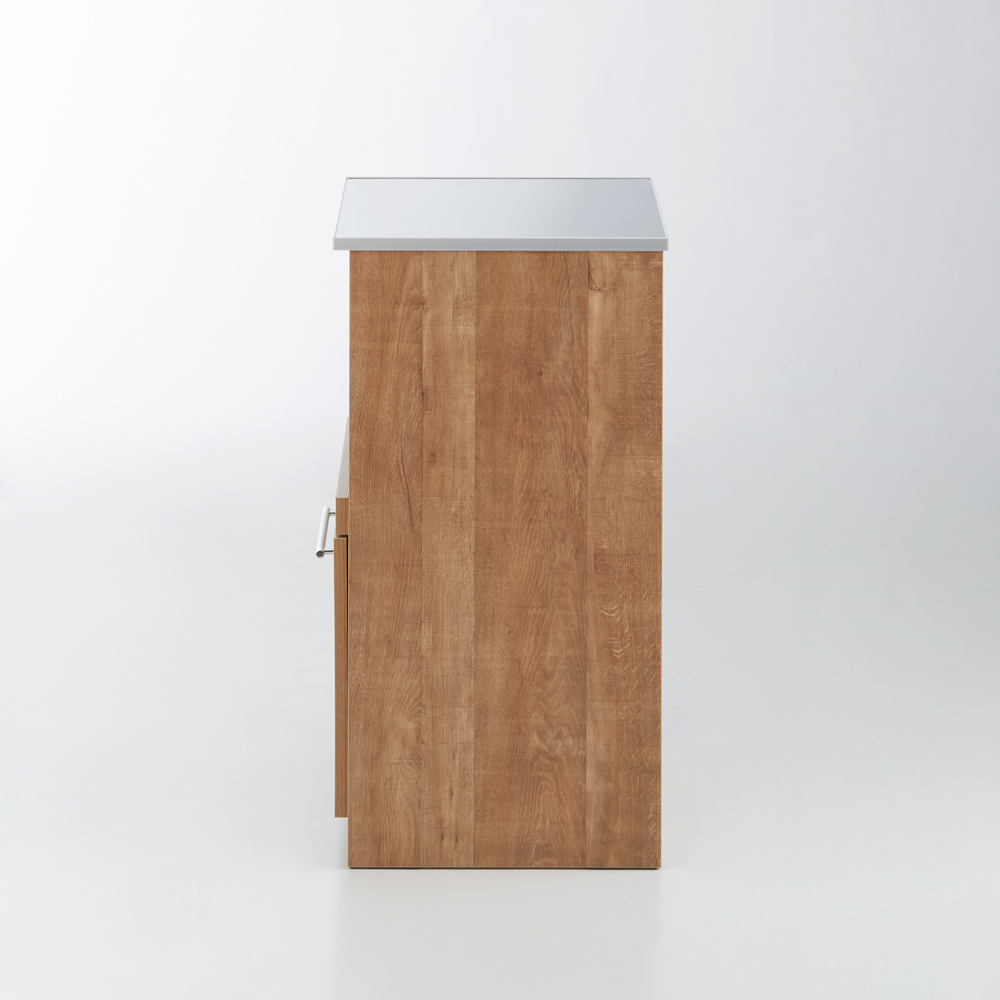 天然木調の風合いとステンレストップの組み合わせがモダンなデザイン。高級感ある佇まいが、落ち着いたキッチン空間を演出します。家電が使いやすいスライドテーブルなど高い機能性を備えたシリーズです。天然木調の風合いでキッチンをワンランクアップ●高級感ある佇まいが、落ち着いたキッチン収納を演出します。●おしゃれなシステムキッチンにぴったりのデザインです。●お部屋のインテリアをナチュラルモダンにされている方におすすめです。ポイント 調理台に使える、使い勝手のよいステンレス素材●調理スペース、お皿を置くスペースが足りない方にはステンレス天板が便利。●調理台としてだけでなく、大型レンジなども安心して設置できレンジ台にもおすすめです。●炊飯器やコーヒーメーカー置き場に便利なスライドテーブル付きタイプです。