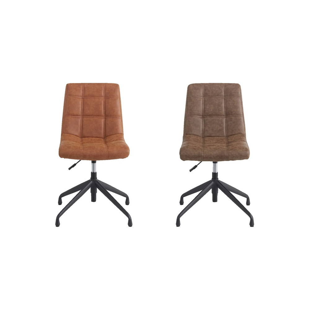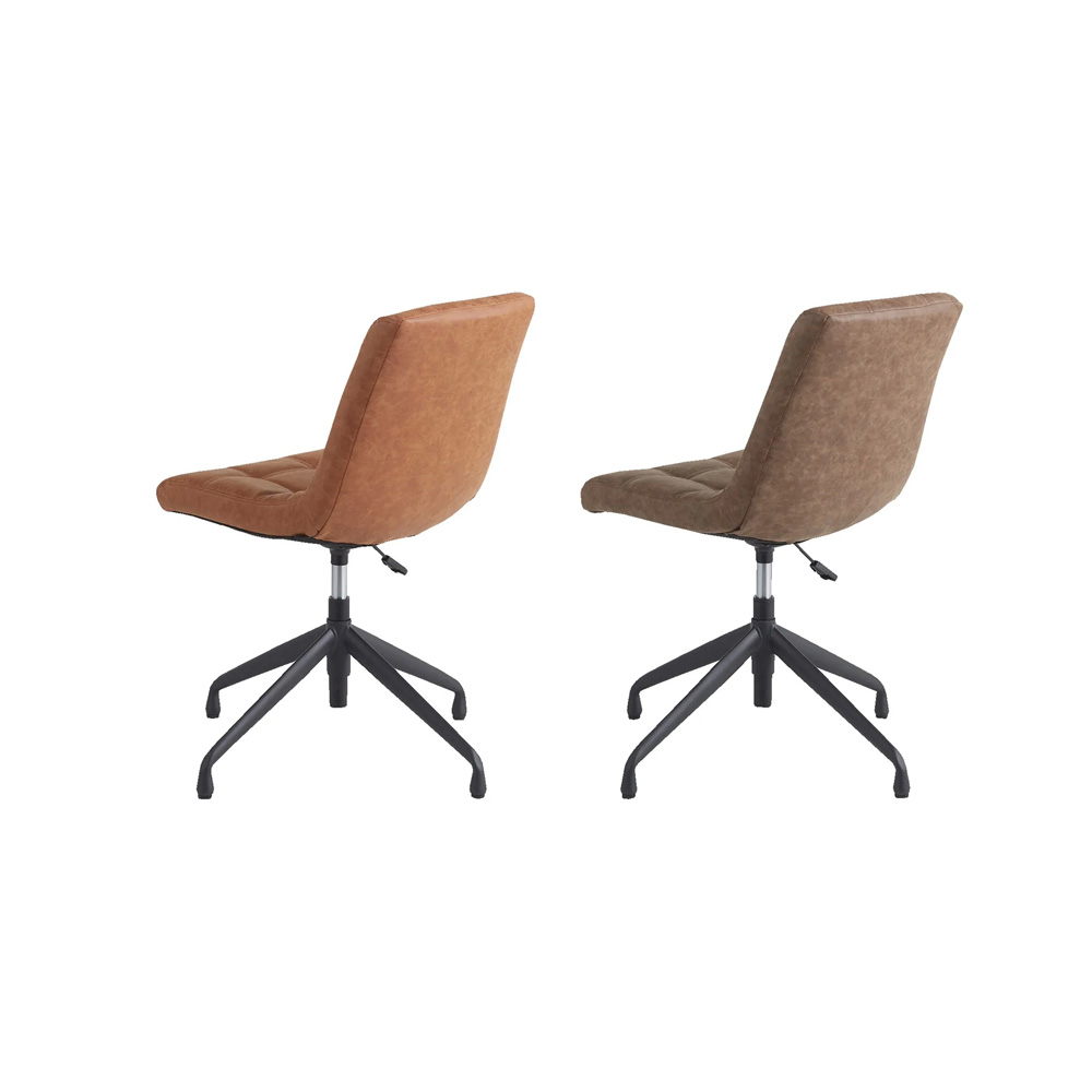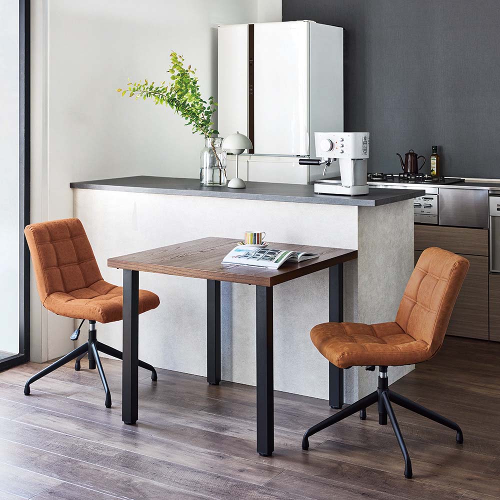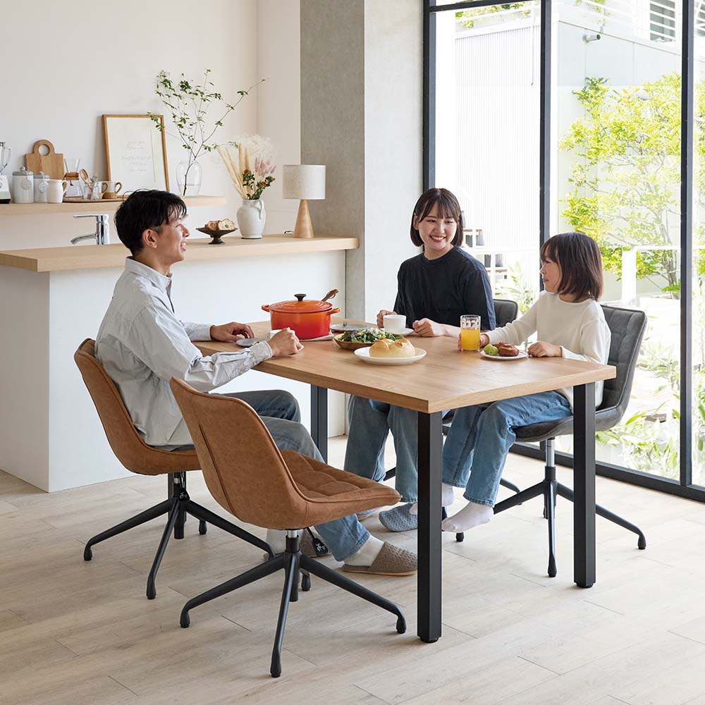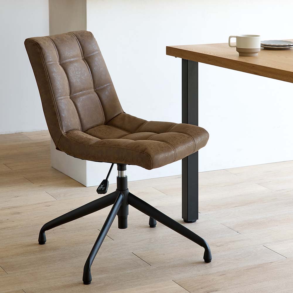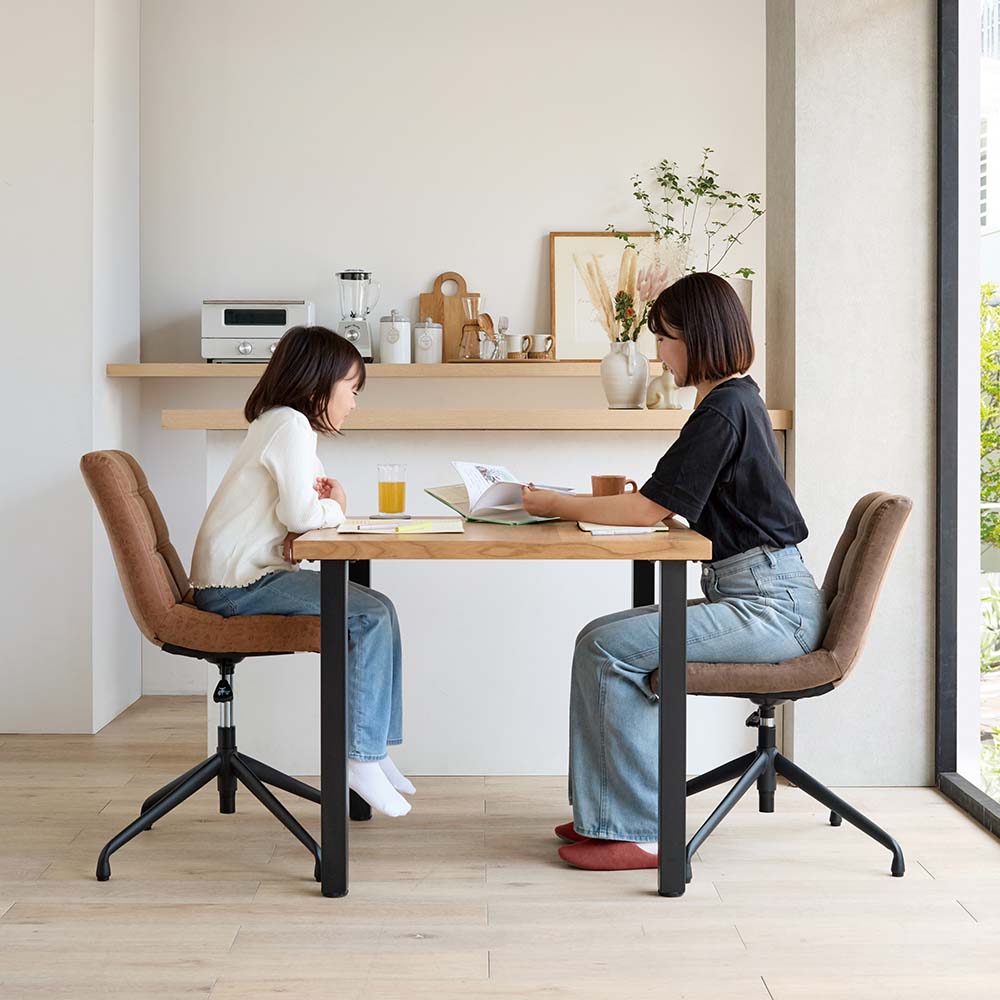 ビンテージ風の回転昇降ワークチェア。リビングでもダイニングでも合わせやすいデザイン。食事もテレワークもこの1脚でOK!使う人に合わせて、座面もベストな高さにテーブルの高さに合わせて、椅子の高さも調節したい――。そんなときに便利なのが昇降機能。座面を少し高くするだけで、子どもや小柄な方でも無理のない姿勢で食事ができます。食事だけでなく、勉強や在宅ワーク、アイロンがけなど…暮らしのさまざまなシーンに応じて、ちょうどいい高さで使えるのが魅力です。おしゃれなデスクチェアが欲しい方へ「本格的なオフィスチェアだとちょっと大げさ…」「でもダイニングチェアでは長時間はつらい」そんな声に応えるのが、こちらの昇降回転チェア。ダイニングやリビングにも自然になじむ、シンプルで上品なデザインです。機能性もしっかり張り地には、味わいのある合成皮革を使用。厚みのある座面で、ほどよいクッション性も◎。ダイニングチェアのようなコンパクトサイズながら、昇降機能付きでデスクや身体に合わせて高さを調整できます。360度回転式なので、狭いスペースでも立ち座りがスムーズ。キャスターはあえて付けず、フローリングを傷つけにくい仕様にしています。