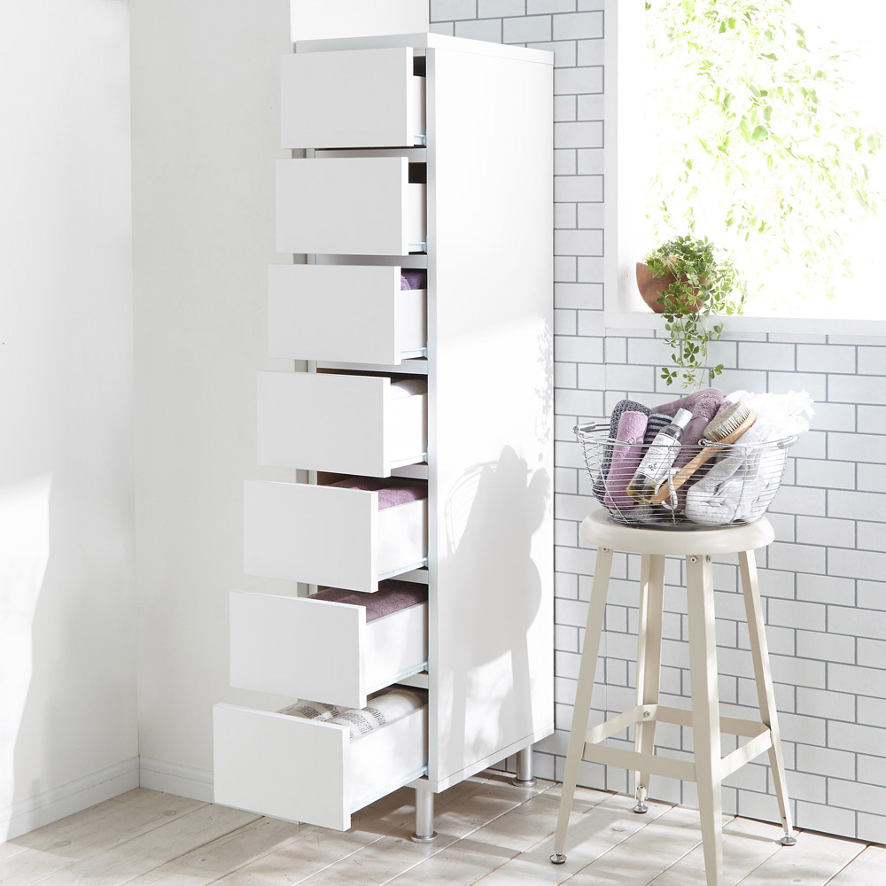 サイズと引き出しの杯数が8種類から選べるすき間チェスト。引き出し同士で入れ替えできる便利さとスタイリッシュな脚付きデザインが洗面所の収納を快適にします。微妙なスペースにもおさまるサイズがきっと見つかる!8種類から選べる湿気を気にしないすき間チェストサニタリールームでも洗面台の横や洗濯機の脇にある微妙なすき間…収納場所はほしいのになかなか希望のサイズが見つからない、収納家具を設置するスペースがなくお悩みの方へぜひともおすすめのチェストです。●幅はスリムな29.5cmとワイドな44.5cmの2種類です。●奥行は薄型の29.5cmと深型の44.5cmの2種類です。●高さは90cmと147.5cmの2タイプがあります。●幅29.5cmは脱衣所の端や狭い洗面所にぴったりです。ワイドタイプの幅44.5cmは洗濯機周り、脱衣所の下着収納やリビングのチェストとしてもご使用できます。●薄型の奥行29.5cmは手前に場所をとらず省スペースで置くことができるので、せまい脱衣所や廊下にも適しています。ちょっとした書類や小物入れとしてもOK●深型の奥行44.5cmは大判タオルやバスタオル、パジャマなどサブのリネン庫として活躍できます。●高さ90cmは洗面台と同じ高さなので、天板をつかって洗剤の入れ替えやドライヤーなどのちょい置きができます。●引き出し7杯が特徴の高さ147.5cmは家族の衣類や小物を小分けしながら細かく収納ができます。水周りでも清潔につかえるアイデアいっぱい「引き出し内部化粧」「水に強い素材」「アジャスター付き脚」●シンプルなデザインながらもサニタリーチェストとして必要な機能性をぎゅっと詰め込みました。●引き出しの中身は衣類やタオルをいつでも清潔に保てるよう、すべてに内部化粧が施してあります。●すべての天板・前面は水ハネにも耐える素材のポリエステル化粧合板を使用しました。洗濯機近くや洗面台の隣でも安心して使えます。●底はやわらかい床でもしっかり固定できるようアジャスター付きの脚が付いているので小さなお子様がいても安全に使用できます。●水周りで家具と床の設置面が気になる方も脚付きであればクリーンに設置ができます。●空間がある脚下は掃除も簡単で体重計置き場としてもお役立ちします。デザインもおしゃれです。引き出しは全段入れ替えられるので中身そのままでラクラク移動●引き出し同士の入れ替えができるので、いちいち中身を移動させなくても場所が簡単に変えられます。●引き出しは全段スライドレールがついているので開閉しやすく動作もスムーズです。●取っ手は前板の下に手掛けをするところがあるのでそちらで開閉できます。●引き出しを閉じれば取っ手のないフラットな印象なので、自然と空間になじむデザインです。●洗練された技術とアイデアが生きる日本製のランドリー収納をぜひともお楽しみください。