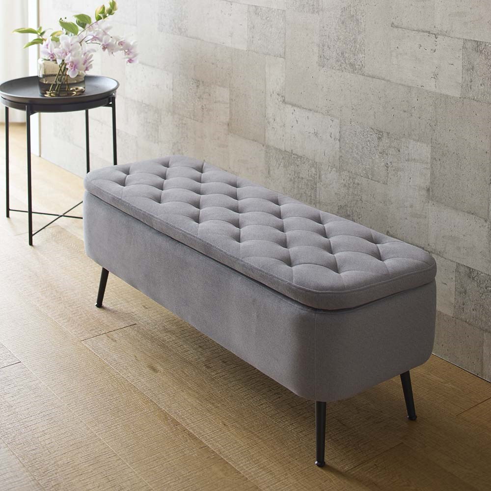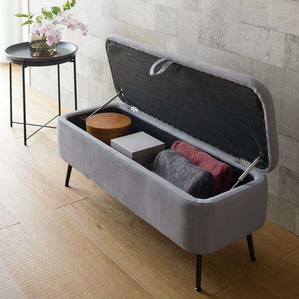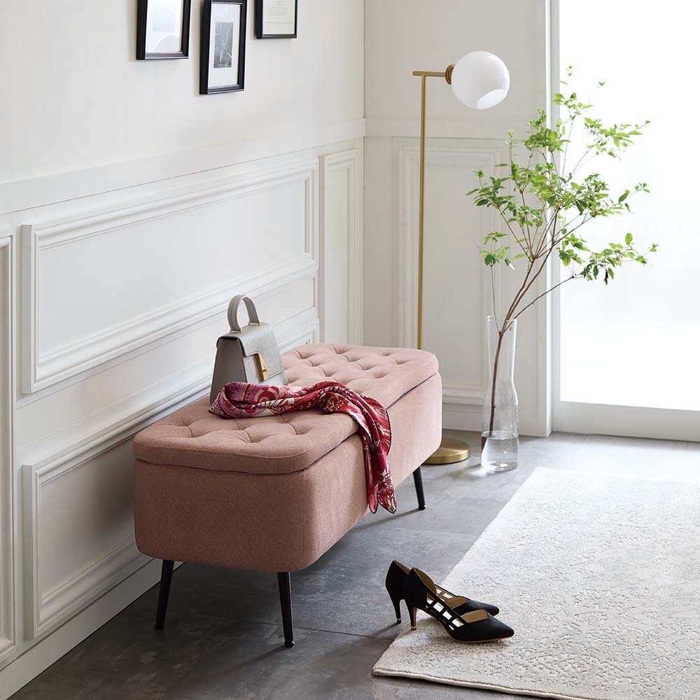 ロマンティックなデザインで優雅さ漂う玄関に。座るだけでなく収納力も兼ね備えたベンチ。フェミニンな印象のファブリックベンチにしっかり収納もつけちゃいました!玄関やウォークインクローゼット、リビングルームの壁付けでの使用など、「あったら便利」な場所におしゃれに設置できます。