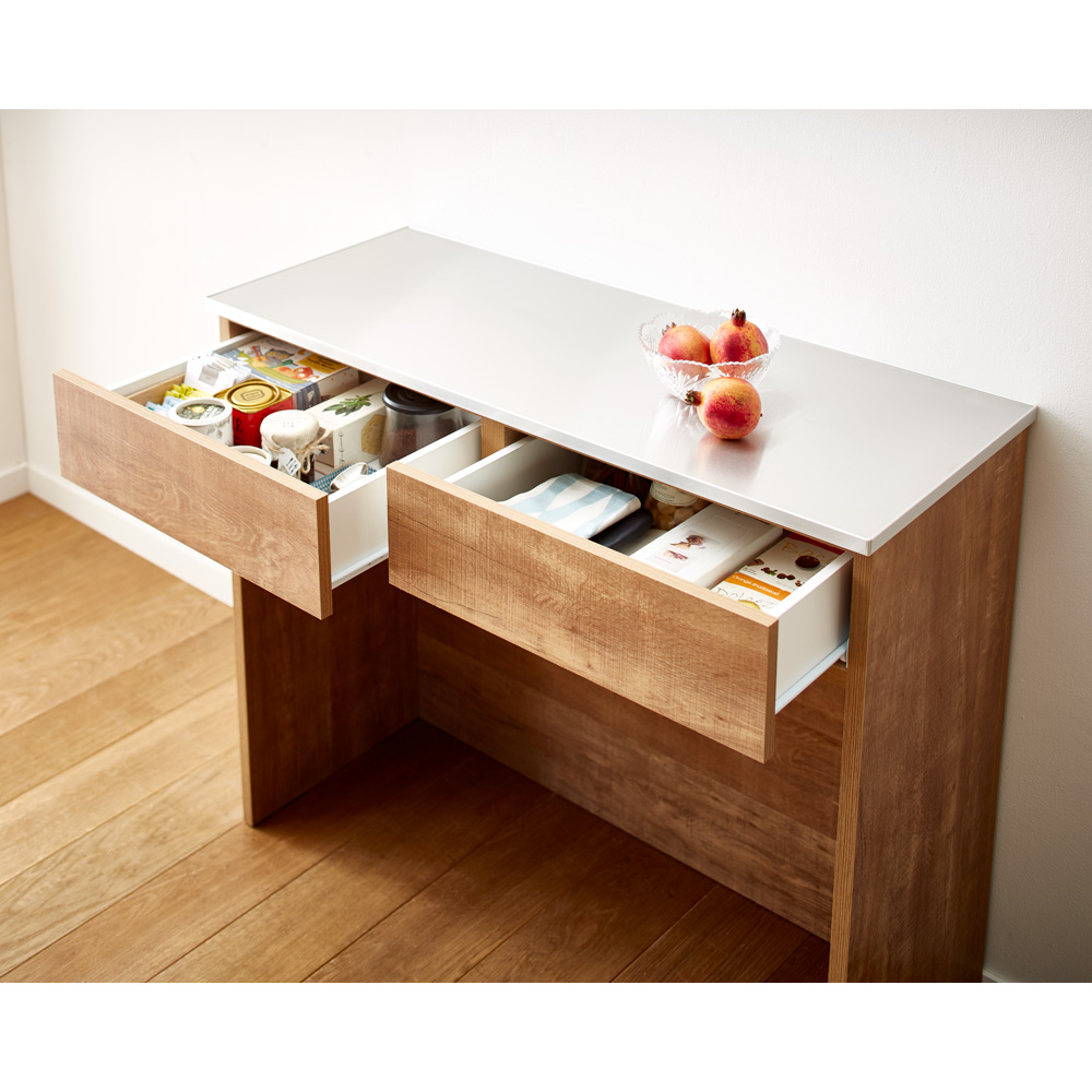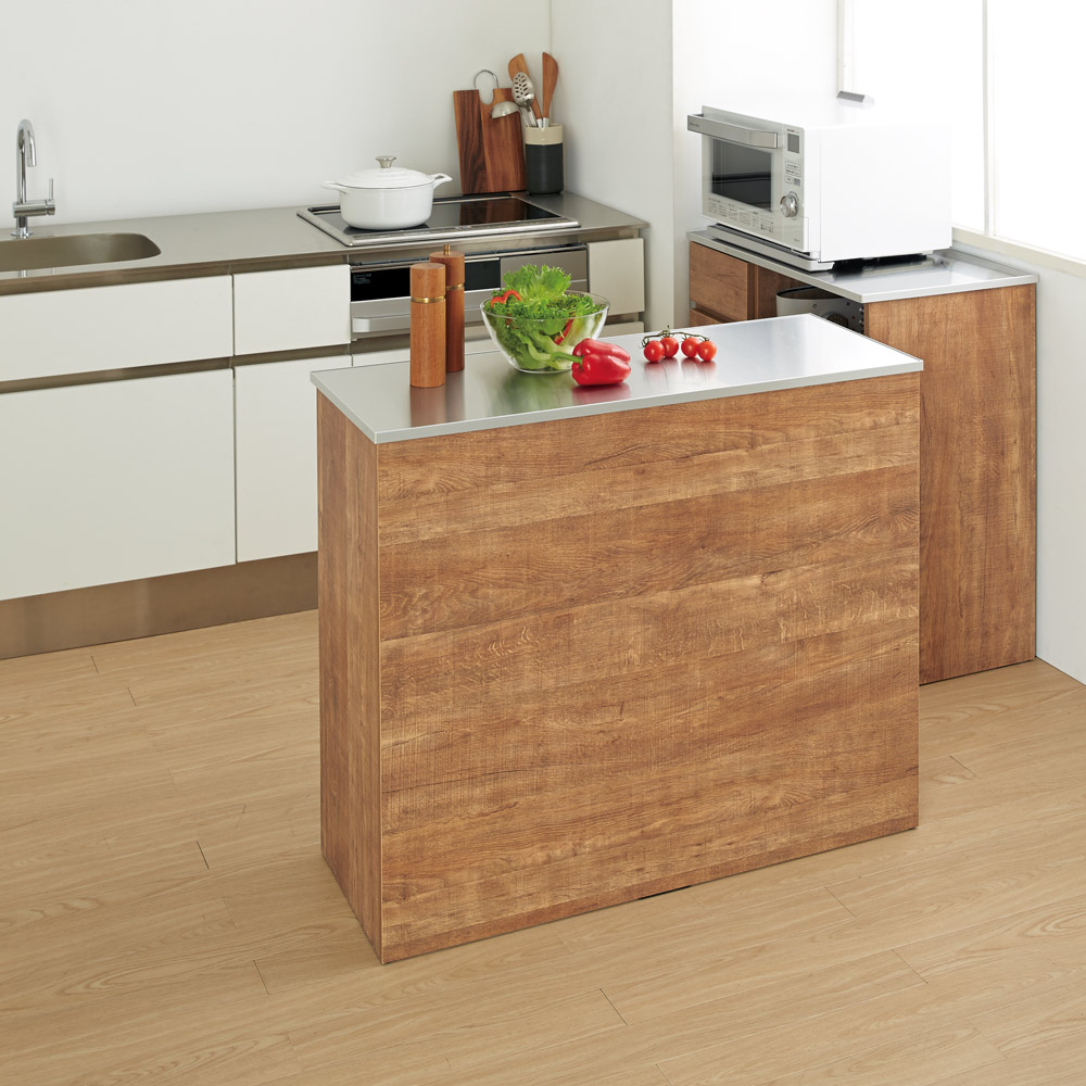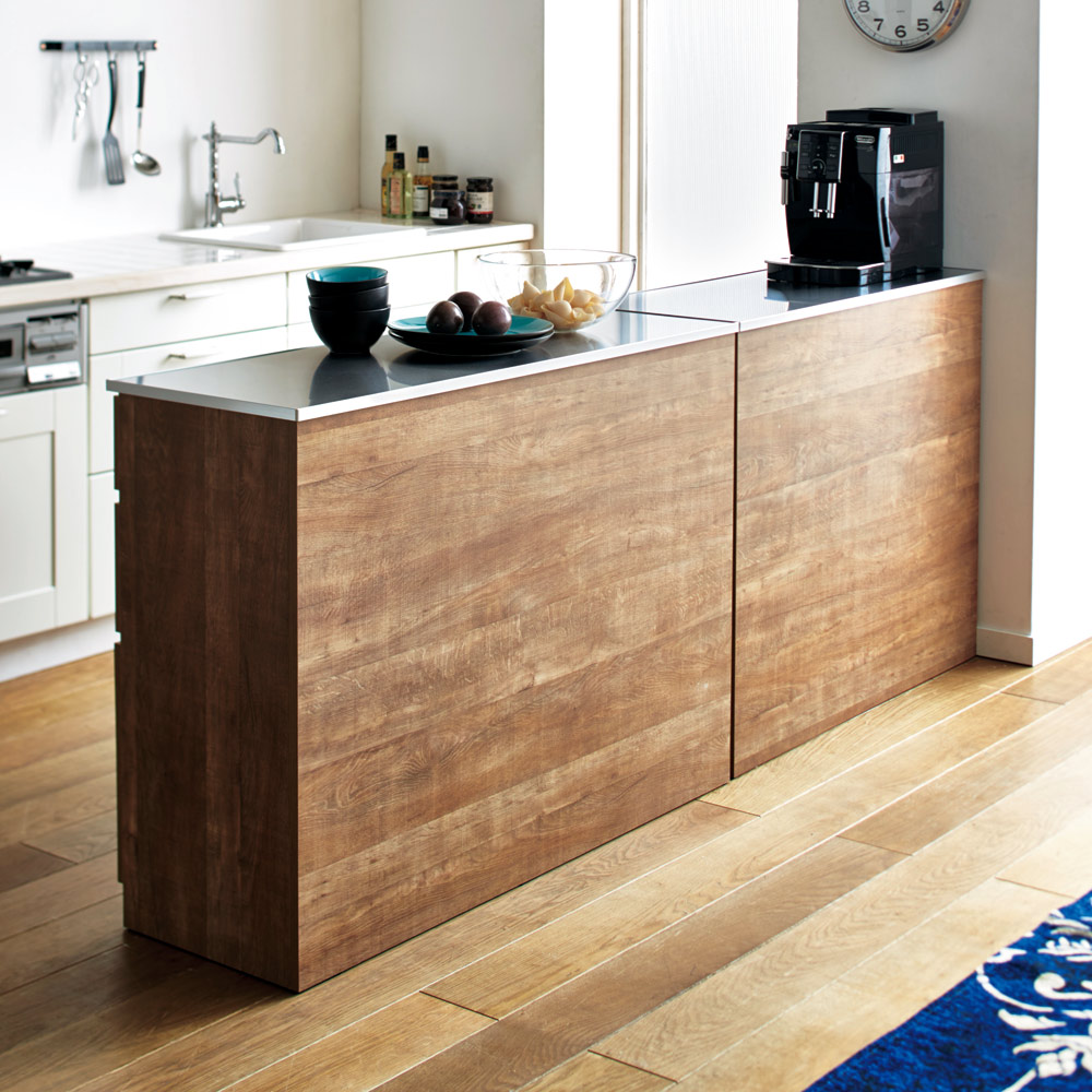 スペースを有効活用できる間仕切りカウンターとレンジ台。ステンレス天板だから、作業台としても活躍。窓下に置いたり、アイランドキッチンのように間仕切り使いにしたり、スペースに合わせて使い方は自在です。天然木調の風合い、シャープなステンレス天板●高級感ある佇まいが、落ち着いたキッチン収納を演出します。●おしゃれなシステムキッチンにぴったりのデザインです。●お部屋のインテリアをナチュラルモダンにされている方におすすめです。ポイント(1)空間を仕切れる、間仕切り仕上げのキッチンカウンター●本体の背面も前面と同じ木目調にすることで空間の中央にも置くことができます。●お手軽にアイランド型キッチンをが作れるのでお部屋のレイアウトの幅が広がります。●2台並べて設置すると、ダイニングとの空間を分けるのに便利です。ポイント(2)調理台に使える、使い勝手のよいステンレス素材●調理スペース、お皿を置くスペースが足りない方にはステンレス天板が便利。●引き出し付きのカウンタータイプはキッチンの収納も増えて1台2役です。
