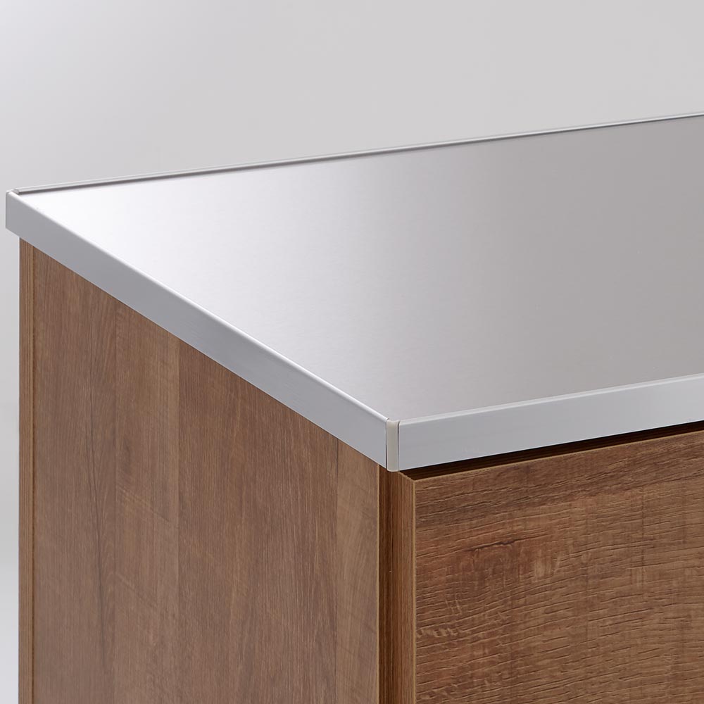 ステンレス天板で水や熱に強くお手入れも簡単。フチを樹脂製のパーツでカバーし、手当たりも優しく仕上げています。