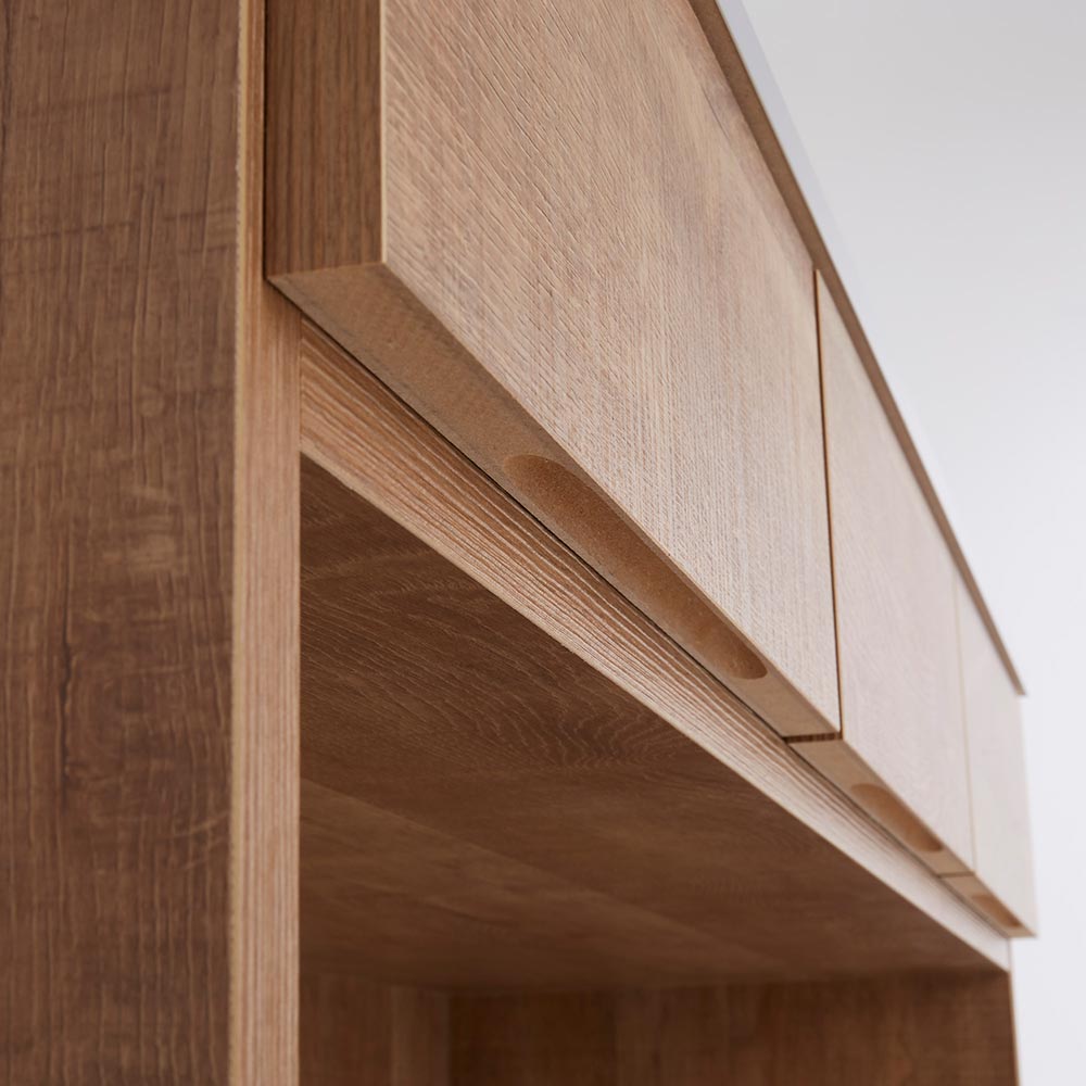 引き出しの下に手掛けを設けて、美観を損ねずすっきりとした仕上がりに。