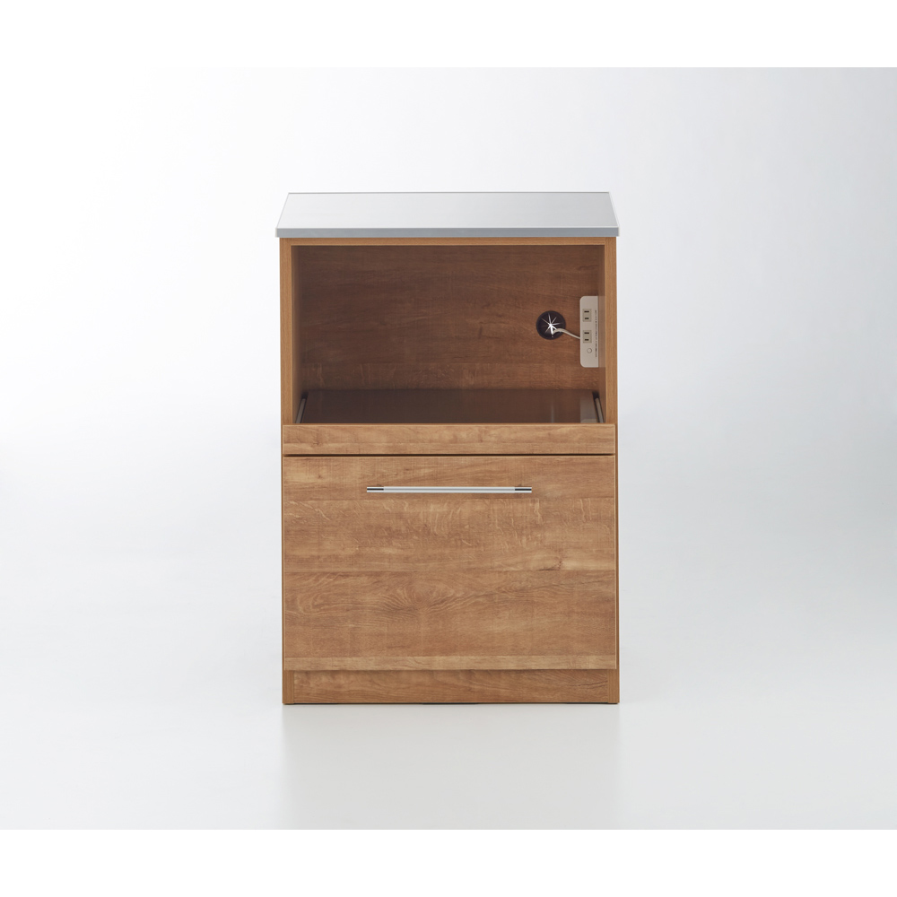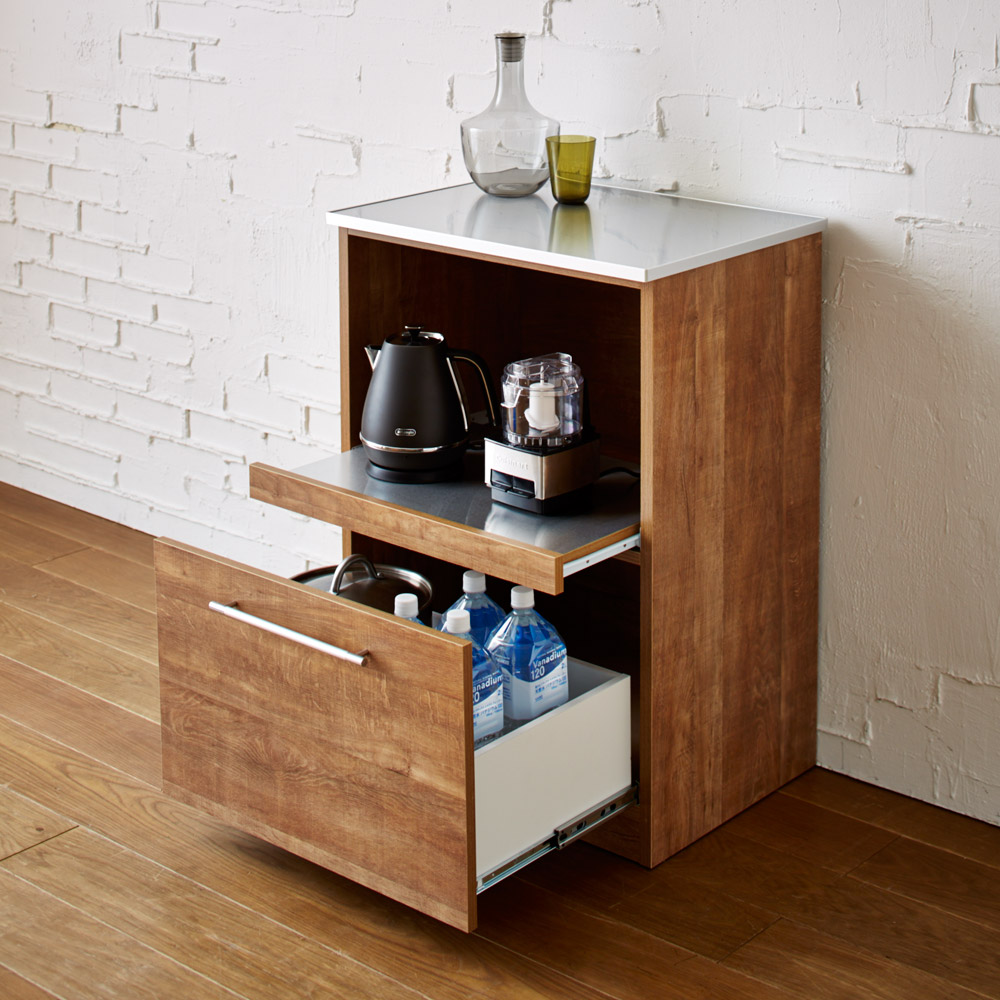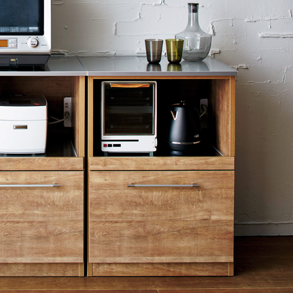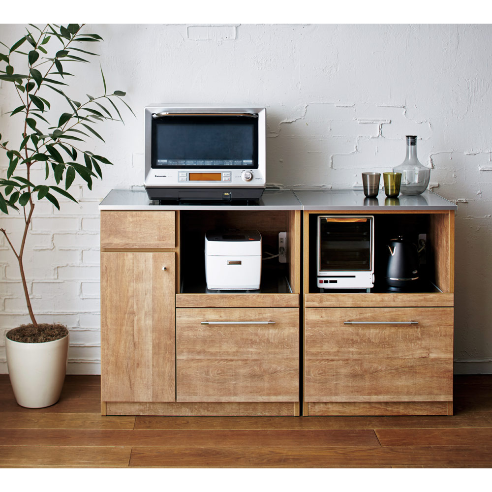 天然木調の風合いとステンレストップの組み合わせがモダンなデザイン。高級感ある佇まいが、落ち着いたキッチン空間を演出します。家電が使いやすいスライドテーブルなど高い機能性を備えたシリーズです。天然木調の風合いでキッチンをワンランクアップ●高級感ある佇まいが、落ち着いたキッチン収納を演出します。●おしゃれなシステムキッチンにぴったりのデザインです。●お部屋のインテリアをナチュラルモダンにされている方におすすめです。ポイント 調理台に使える、使い勝手のよいステンレス素材●調理スペース、お皿を置くスペースが足りない方にはステンレス天板が便利。●調理台としてだけでなく、大型レンジなども安心して設置できレンジ台にもおすすめです。●炊飯器やコーヒーメーカー置き場に便利なスライドテーブル付きタイプです。
