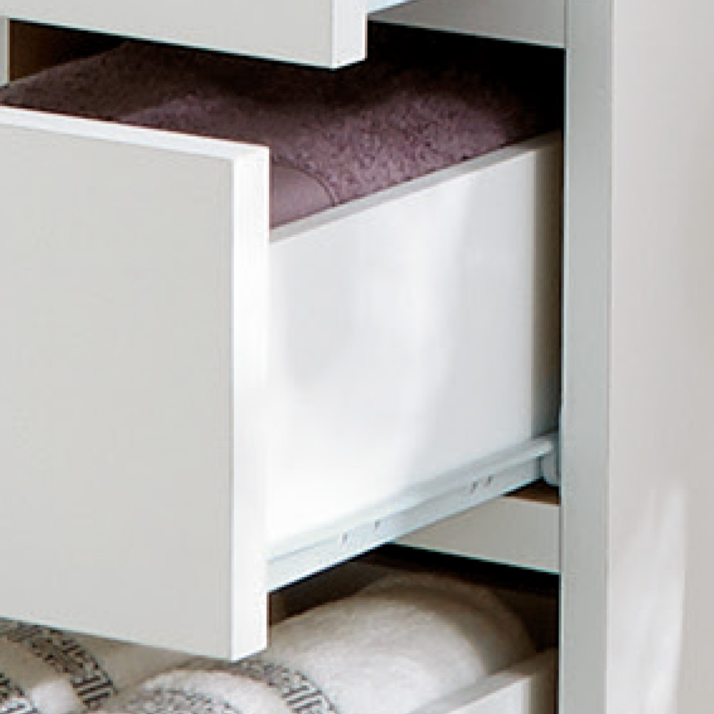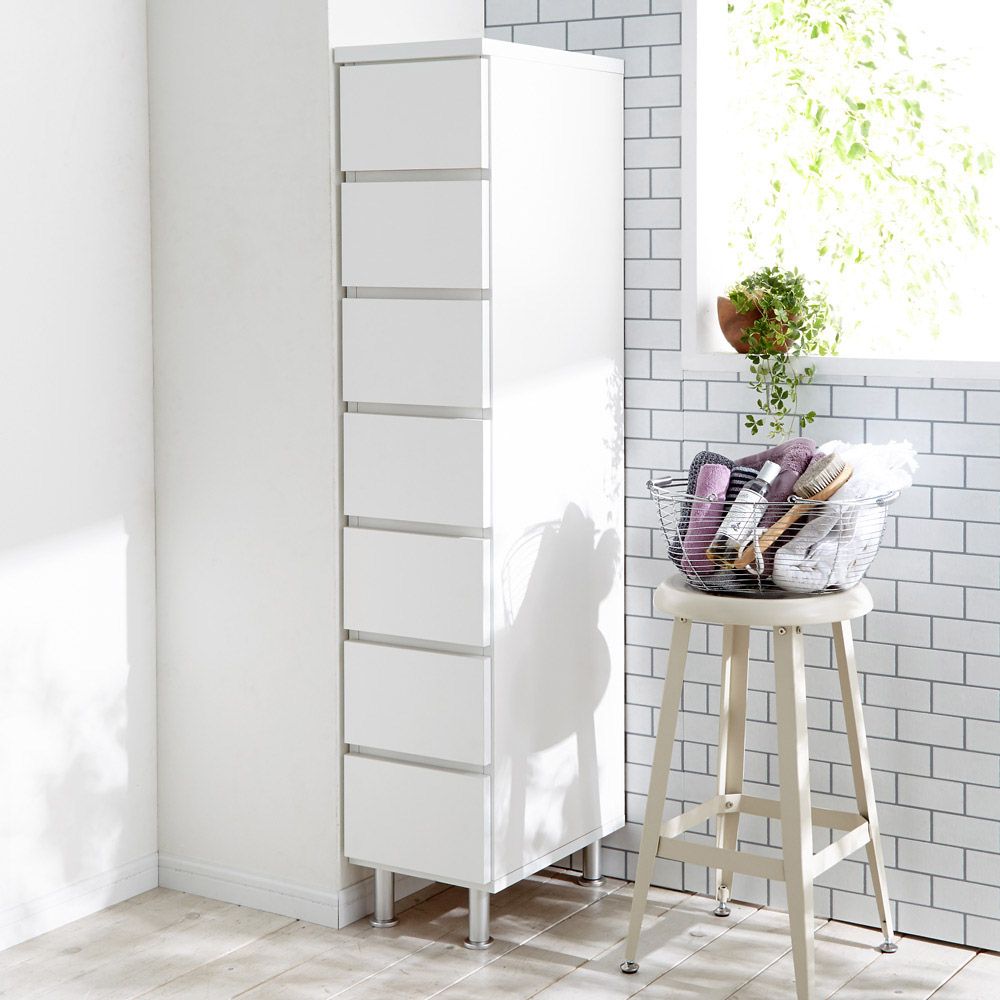 サイズと引き出しの杯数が8種類から選べるすき間チェスト。引き出し同士で入れ替えできる便利さとスタイリッシュな脚付きデザインが洗面所の収納を快適にします。微妙なスペースにもおさまるサイズがきっと見つかる!8種類から選べる湿気を気にしないすき間チェストサニタリールームでも洗面台の横や洗濯機の脇にある微妙なすき間…収納場所はほしいのになかなか希望のサイズが見つからない、収納家具を設置するスペースがなくお悩みの方へぜひともおすすめのチェストです。●幅はスリムな29.5cmとワイドな44.5cmの2種類です。●奥行は薄型の29.5cmと深型の44.5cmの2種類です。●高さは90cmと147.5cmの2タイプがあります。●幅29.5cmは脱衣所の端や狭い洗面所にぴったりです。ワイドタイプの幅44.5cmは洗濯機周り、脱衣所の下着収納やリビングのチェストとしてもご使用できます。●薄型の奥行29.5cmは手前に場所をとらず省スペースで置くことができるので、せまい脱衣所や廊下にも適しています。ちょっとした書類や小物入れとしてもOK●深型の奥行44.5cmは大判タオルやバスタオル、パジャマなどサブのリネン庫として活躍できます。●高さ90cmは洗面台と同じ高さなので、天板をつかって洗剤の入れ替えやドライヤーなどのちょい置きができます。●引き出し7杯が特徴の高さ147.5cmは家族の衣類や小物を小分けしながら細かく収納ができます。水周りでも清潔につかえるアイデアいっぱい「引き出し内部化粧」「水に強い素材」「アジャスター付き脚」●シンプルなデザインながらもサニタリーチェストとして必要な機能性をぎゅっと詰め込みました。●引き出しの中身は衣類やタオルをいつでも清潔に保てるよう、すべてに内部化粧が施してあります。●すべての天板・前面は水ハネにも耐える素材のポリエステル化粧合板を使用しました。洗濯機近くや洗面台の隣でも安心して使えます。●底はやわらかい床でもしっかり固定できるようアジャスター付きの脚が付いているので小さなお子様がいても安全に使用できます。●水周りで家具と床の設置面が気になる方も脚付きであればクリーンに設置ができます。●空間がある脚下は掃除も簡単で体重計置き場としてもお役立ちします。デザインもおしゃれです。引き出しは全段入れ替えられるので中身そのままでラクラク移動●引き出し同士の入れ替えができるので、いちいち中身を移動させなくても場所が簡単に変えられます。●引き出しは全段スライドレールがついているので開閉しやすく動作もスムーズです。●取っ手は前板の下に手掛けをするところがあるのでそちらで開閉できます。●引き出しを閉じれば取っ手のないフラットな印象なので、自然と空間になじむデザインです。●洗練された技術とアイデアが生きる日本製のランドリー収納をぜひともお楽しみください。