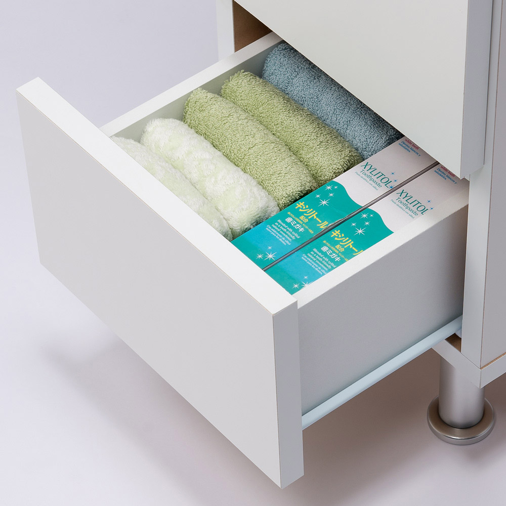 引き出しの収納例:奥行29.5cmはタオルや細かい衣類、コンタクトレンズ、雑貨類を収納するのにおすすめです。