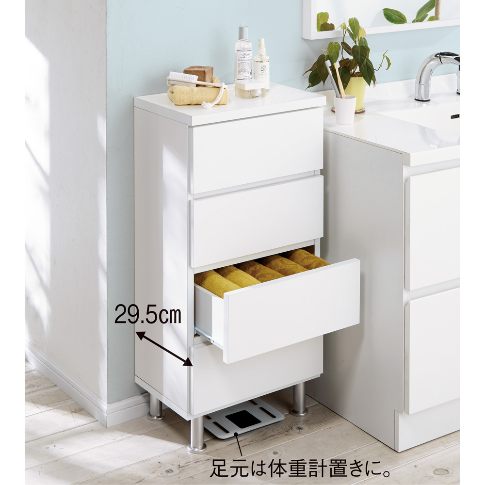 サイズと引き出しの杯数が8種類から選べるすき間チェスト。引き出し同士で入れ替えできる便利さとスタイリッシュな脚付きデザインが洗面所の収納を快適にします。微妙なスペースにもおさまるサイズがきっと見つかる!8種類から選べる湿気を気にしないすき間チェストサニタリールームでも洗面台の横や洗濯機の脇にある微妙なすき間…収納場所はほしいのになかなか希望のサイズが見つからない、収納家具を設置するスペースがなくお悩みの方へぜひともおすすめのチェストです。●幅はスリムな29.5cmとワイドな44.5cmの2種類です。●奥行は薄型の29.5cmと深型の44.5cmの2種類です。●高さは90cmと147.5cmの2タイプがあります。●幅29.5cmは脱衣所の端や狭い洗面所にぴったりです。ワイドタイプの幅44.5cmは洗濯機周り、脱衣所の下着収納やリビングのチェストとしてもご使用できます。●薄型の奥行29.5cmは手前に場所をとらず省スペースで置くことができるので、せまい脱衣所や廊下にも適しています。ちょっとした書類や小物入れとしてもOK●深型の奥行44.5cmは大判タオルやバスタオル、パジャマなどサブのリネン庫として活躍できます。●高さ90cmは洗面台と同じ高さなので、天板をつかって洗剤の入れ替えやドライヤーなどのちょい置きができます。●引き出し7杯が特徴の高さ147.5cmは家族の衣類や小物を小分けしながら細かく収納ができます。水周りでも清潔につかえるアイデアいっぱい「引き出し内部化粧」「水に強い素材」「アジャスター付き脚」●シンプルなデザインながらもサニタリーチェストとして必要な機能性をぎゅっと詰め込みました。●引き出しの中身は衣類やタオルをいつでも清潔に保てるよう、すべてに内部化粧が施してあります。●すべての天板・前面は水ハネにも耐える素材のポリエステル化粧合板を使用しました。洗濯機近くや洗面台の隣でも安心して使えます。●底はやわらかい床でもしっかり固定できるようアジャスター付きの脚が付いているので小さなお子様がいても安全に使用できます。●水周りで家具と床の設置面が気になる方も脚付きであればクリーンに設置ができます。●空間がある脚下は掃除も簡単で体重計置き場としてもお役立ちします。デザインもおしゃれです。引き出しは全段入れ替えられるので中身そのままでラクラク移動●引き出し同士の入れ替えができるので、いちいち中身を移動させなくても場所が簡単に変えられます。●引き出しは全段スライドレールがついているので開閉しやすく動作もスムーズです。●取っ手は前板の下に手掛けをするところがあるのでそちらで開閉できます。●引き出しを閉じれば取っ手のないフラットな印象なので、自然と空間になじむデザインです。●洗練された技術とアイデアが生きる日本製のランドリー収納をぜひともお楽しみください。