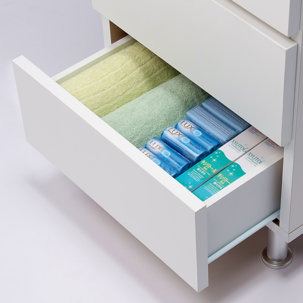引き出しの収納例:奥行29.5cmはタオルや細かい衣類、コンタクトレンズ、雑貨類を収納するのにおすすめです。