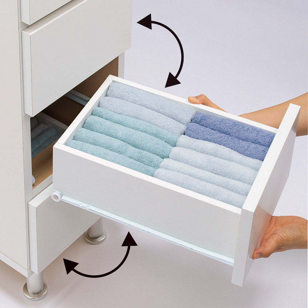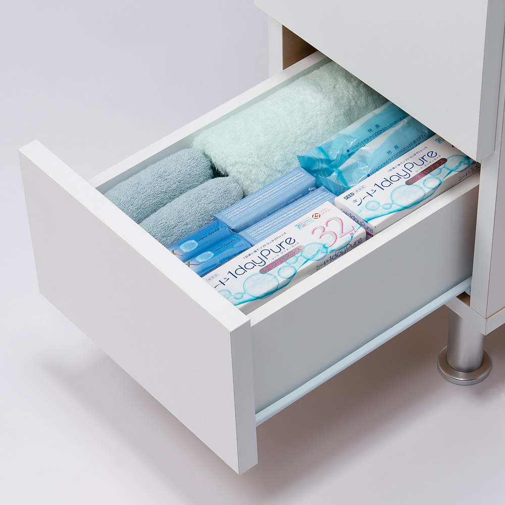 引き出しの収納例:奥行29.5cmはタオルや細かい衣類、コンタクトレンズ、雑貨類を収納するのにおすすめです。