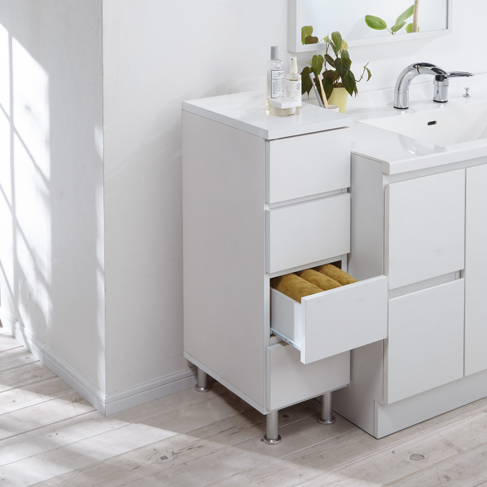サイズと引き出しの杯数が8種類から選べるすき間チェスト。引き出し同士で入れ替えできる便利さとスタイリッシュな脚付きデザインが洗面所の収納を快適にします。微妙なスペースにもおさまるサイズがきっと見つかる!8種類から選べる湿気を気にしないすき間チェストサニタリールームでも洗面台の横や洗濯機の脇にある微妙なすき間…収納場所はほしいのになかなか希望のサイズが見つからない、収納家具を設置するスペースがなくお悩みの方へぜひともおすすめのチェストです。●幅はスリムな29.5cmとワイドな44.5cmの2種類です。●奥行は薄型の29.5cmと深型の44.5cmの2種類です。●高さは90cmと147.5cmの2タイプがあります。●幅29.5cmは脱衣所の端や狭い洗面所にぴったりです。ワイドタイプの幅44.5cmは洗濯機周り、脱衣所の下着収納やリビングのチェストとしてもご使用できます。●薄型の奥行29.5cmは手前に場所をとらず省スペースで置くことができるので、せまい脱衣所や廊下にも適しています。ちょっとした書類や小物入れとしてもOK●深型の奥行44.5cmは大判タオルやバスタオル、パジャマなどサブのリネン庫として活躍できます。●高さ90cmは洗面台と同じ高さなので、天板をつかって洗剤の入れ替えやドライヤーなどのちょい置きができます。●引き出し7杯が特徴の高さ147.5cmは家族の衣類や小物を小分けしながら細かく収納ができます。水周りでも清潔につかえるアイデアいっぱい「引き出し内部化粧」「水に強い素材」「アジャスター付き脚」●シンプルなデザインながらもサニタリーチェストとして必要な機能性をぎゅっと詰め込みました。●引き出しの中身は衣類やタオルをいつでも清潔に保てるよう、すべてに内部化粧が施してあります。●すべての天板・前面は水ハネにも耐える素材のポリエステル化粧合板を使用しました。洗濯機近くや洗面台の隣でも安心して使えます。●底はやわらかい床でもしっかり固定できるようアジャスター付きの脚が付いているので小さなお子様がいても安全に使用できます。●水周りで家具と床の設置面が気になる方も脚付きであればクリーンに設置ができます。●空間がある脚下は掃除も簡単で体重計置き場としてもお役立ちします。デザインもおしゃれです。引き出しは全段入れ替えられるので中身そのままでラクラク移動●引き出し同士の入れ替えができるので、いちいち中身を移動させなくても場所が簡単に変えられます。●引き出しは全段スライドレールがついているので開閉しやすく動作もスムーズです。●取っ手は前板の下に手掛けをするところがあるのでそちらで開閉できます。●引き出しを閉じれば取っ手のないフラットな印象なので、自然と空間になじむデザインです。●洗練された技術とアイデアが生きる日本製のランドリー収納をぜひともお楽しみください。