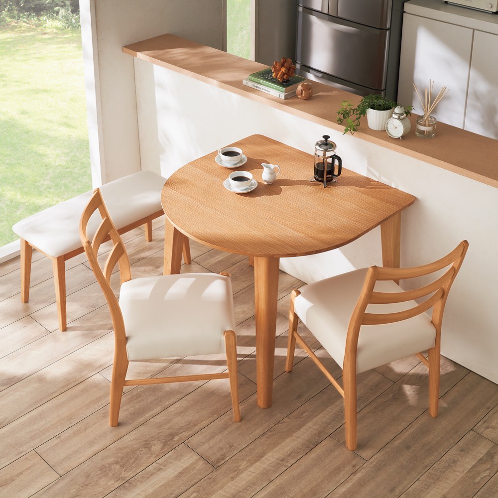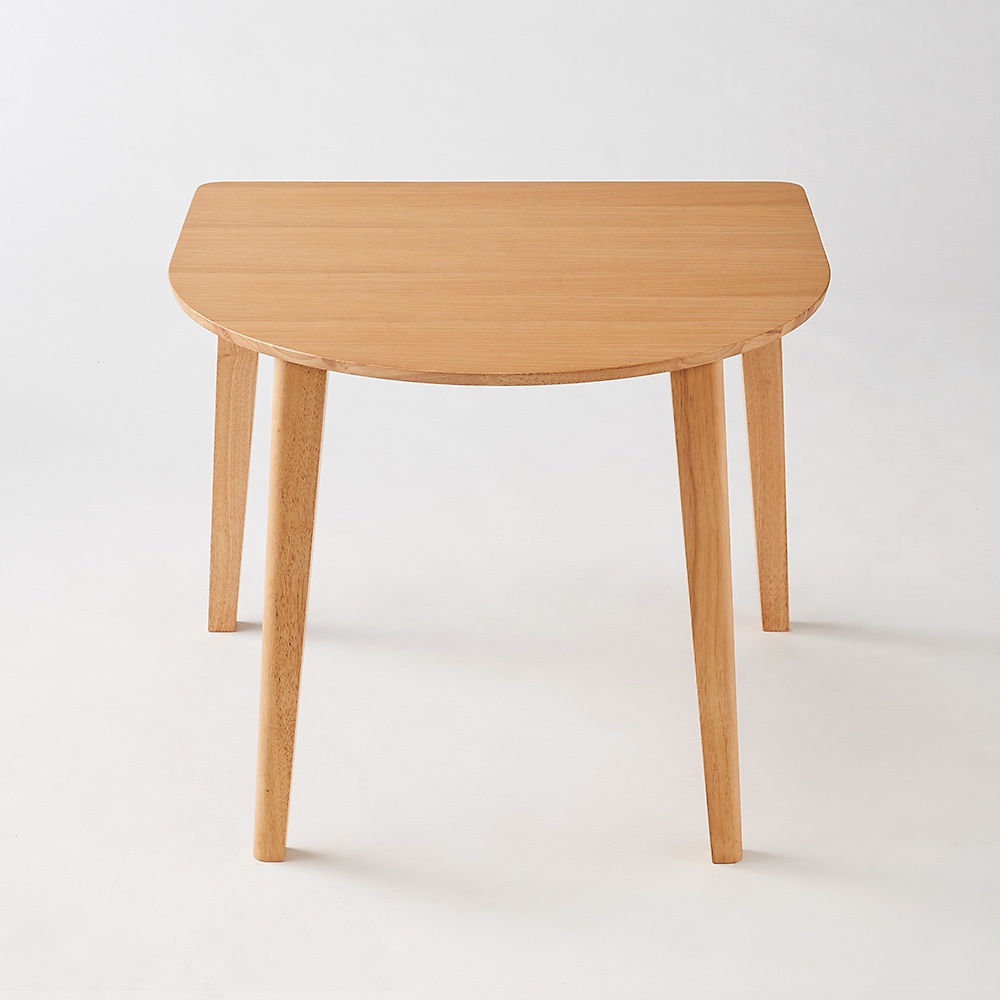 広々使える半円形で会話も弾みそう。壁に寄せて使える省スペース性と柔らかな印象を両立した半円デザイン。お部屋もテーブルも広々使えるサイズ・形状です。省スペースを最大限に活かす半円形デザイン狭い空間でも使いやすい半円形状が特徴のダイニングテーブル。壁に沿って設置することで、限られたスペースを有効活用できます。レイアウトの自由度が高く、リビングとダイニングを一体化したオープンな空間を実現します。おしゃれなデザインでインテリアに溶け込むモダンで洗練されたデザインは、どんなインテリアにもぴったりです。美しい木目が空間に温かみを与え、家族団らんの時間をより特別なものにします。シンプルながら存在感のあるフォルムで、スタイリッシュなダイニングを演出します。機能性と実用性を兼ね備えた設計テーブル自体は軽量で扱いやすく、簡単に動かせるので掃除も楽々です。汚れに強い素材を使用しているため、子どもがいる家庭でも安心して使えます。耐久性にも優れ、長く使えるのが嬉しいポイントです。小さな子どもにも安心な角のないフォルム半円形なので、立つ角がなく小さな子どもがいる家庭でも安心です。お子様がぶつかっても安心な丸みのあるデザインで、安全性を考慮した設計です。家族全員が安心して使えるダイニングテーブルは、生活の質を上げます。多様な使い方であらゆるシーンに対応食事だけでなく、作業スペースや趣味のスペースとしても活用できます。窓際に設置してカフェ風のスペースを作るのもおすすめです。ライフスタイルに合わせた使い方ができるのが魅力です。「限られたスペースでもおしゃれに過ごしたい」、「と感じている方にぴったりです。あなたの生活空間を一層豊かにし、家族全員が快適に過ごせるようになります。このテーブルで、日々の生活に新たな彩りを加えてください。これから始まる新しい生活に新生活や引越しを計画中の方にも最適です。限られたスペースを最大限に活用できる実用的なデザインは、どんな部屋にもフィットします。使いやすさとデザイン性を兼ね備えた半円形ダイニングテーブルで、新たな生活をスタートさせませんか。