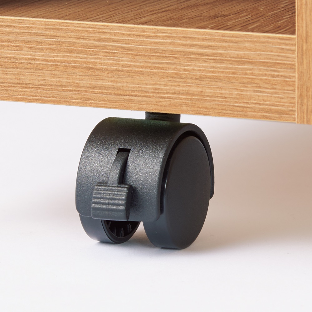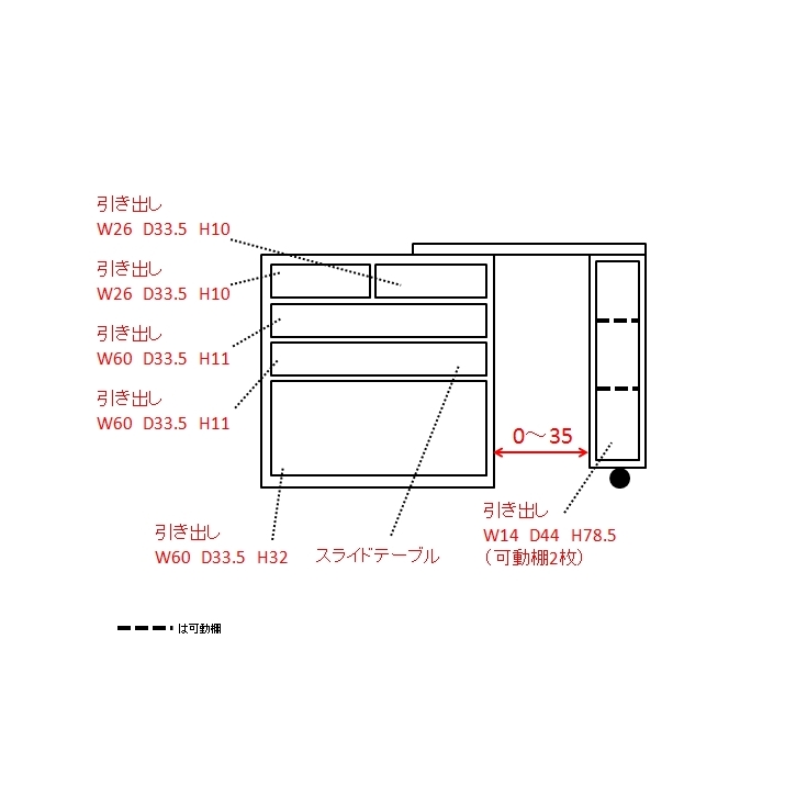 天板の脚部はキャスター付きで左右どちらにでもスライド移動が可能です。キャスターは2つともストッパー付きで、天板が動きにくく安心です。※天板は本体に35cm以上重ねてお使いください。 ※赤文字は内寸(単位:cm)家電収納部奥行=39