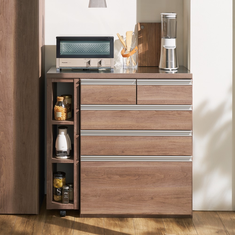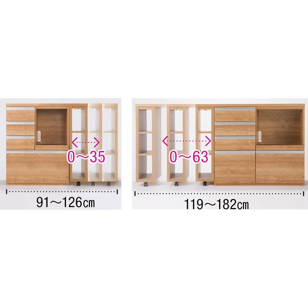 限られたスペースに合わせて伸長式して、気になるすき間にもフィットします。水・汚れに強いステンレス天板で作業台としても。下部オープンスペースにごみ箱が収まるのも魅力。バーカウンターにもなる裏面化粧仕上げ(一部タッカーが見えます)のキッチン収納。限られたスペースにぴったりフィット ステンレス天板スライド伸長式カウンター幅の調節が可能なキッチンカウンター。天板をスライド伸長すれば作業スペースが広がるだけでなく、気になるすき間にもフィットします。天板は水・汚れに強いステンレス製でお料理にもいいですよね。背面も化粧されている(一部タッカーが見えます)のでバーカウンターとしても使えるアイデアキッチン収納です。すき間収納いらずの幅91〜126cmで使える伸長式◆天板はキャスター付きで簡単にスライドして伸長させることができるので狭いキッチンにもぴったり。◆左右どちらにでもスライド移動が可能です。ご自宅のキッチン環境に合わせてご使用いただけます。◆天板を伸長すれば作業スペースが広がるだけでなく、気になるすき間も埋められます。◆キャスターのストッパーをロックすれば天板が固定するので安心。ごみ箱収納スペースも確保できる、下オープンのキッチン収納庫◆スライド天板下は床上収納が可能な下オープン設計。◆ゴミ箱や重たい段ボール、スツールなどの定位置にぴったり。ステンレス天板で清潔、明るいキッチンに◆キラリと光るステンレス天板は汚れやすい台所の味方。水汚れに強く、さっと拭いてお手入れ簡単。◆ステンレス天板部までの高さは90cmで、作業台としても使いやすい高さです。◆家電置きスペースとしてはもちろん、調理台としてお使いいただくにもピッタリです。大型スチームレンジ対応!奥行45cmのレンジラック◆置き場所に困ってしまう大型スチームレンジを乗せることのできる家電台として使用できる設計。◆大型スチームレンジは通常のレンジに比べ奥行が広く、普通のレンジ台には収まらないことも。◆このシリーズの家電ラックは天板部分の奥行が45cmと広々。◆諦めていた大型レンジも乗せられる心強い家電収納です。美しくある為に細部にまで配慮したおしゃれなキッチンカウンター◆(ア)ホワイトの前面には水ハネや油ハネにも強い素材を使用しています。◆(イ)ブラウンは今時の内装材に多い、リアルで大きな木目柄。すり傷などに強い強化紙を使用。◆背面も化粧されている(一部タッカーが見えます)ので間仕切りとしてもご使用いただけます。整頓しやすい引き出しの秘密で誰でも収納上手に。◆たくさん小分けされた小引き出しで、何かと大きさがバラバラなキッチン用品を整理整頓◆食品ストッカー・キッチンストッカーとしても優秀です。◆すべての引き出しにストッパー付きスライドレールを装備し、滑らかに開閉できるので安心です。信頼と安心の国内工場での生産品(日本製)◆国内の職人がひとつずつ丁寧に仕上げた食器棚・カップボードです。◆細部の丁寧な仕上がりなど、国産品ならではの高品質なダイニングボード・キッチンボード・キッチンラックをお楽しみください。◆お届け後、箱から出してキャスターを付けるだけで使える完成商品です。