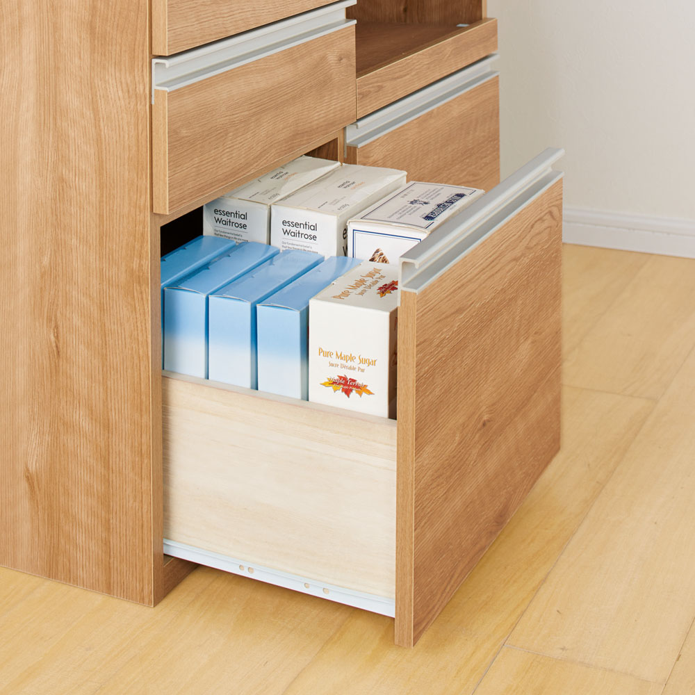 (ウ)ウォルナット 大きさの異なるキッチン小物も多段引き出しでキレイに整頓。
