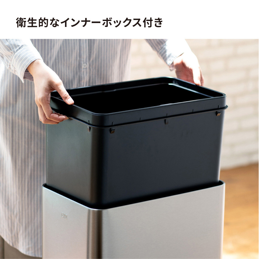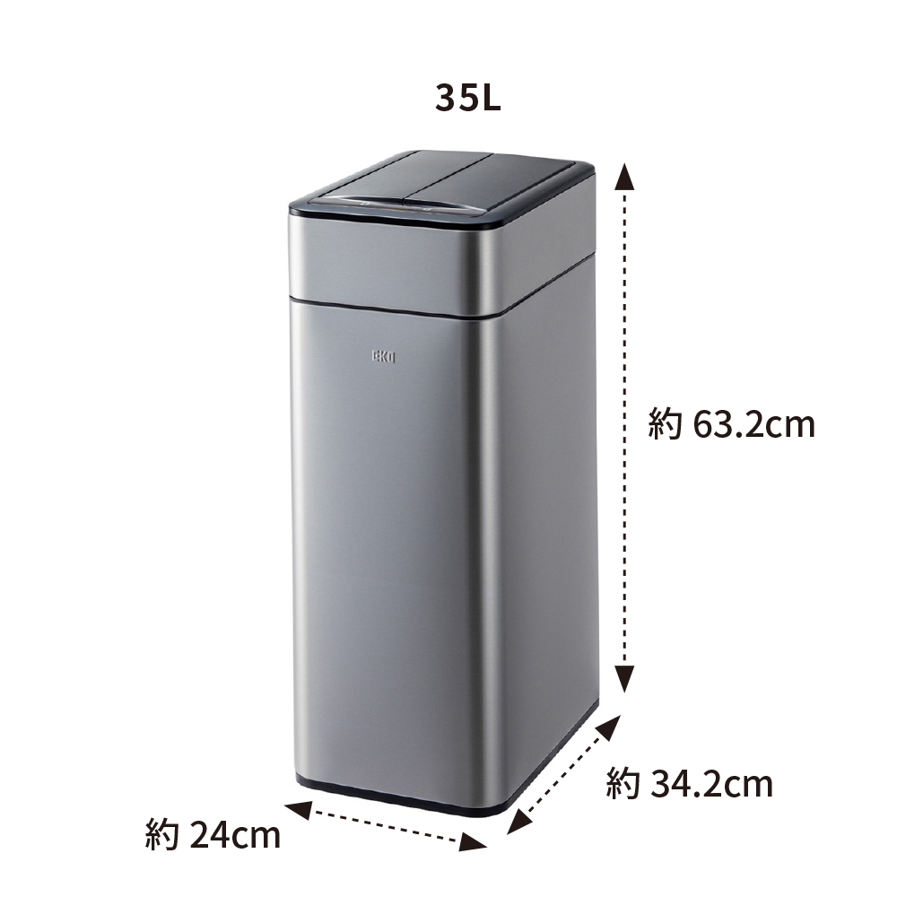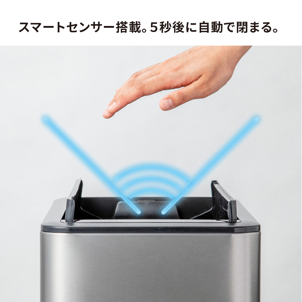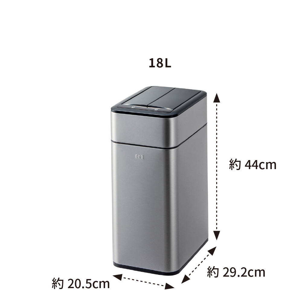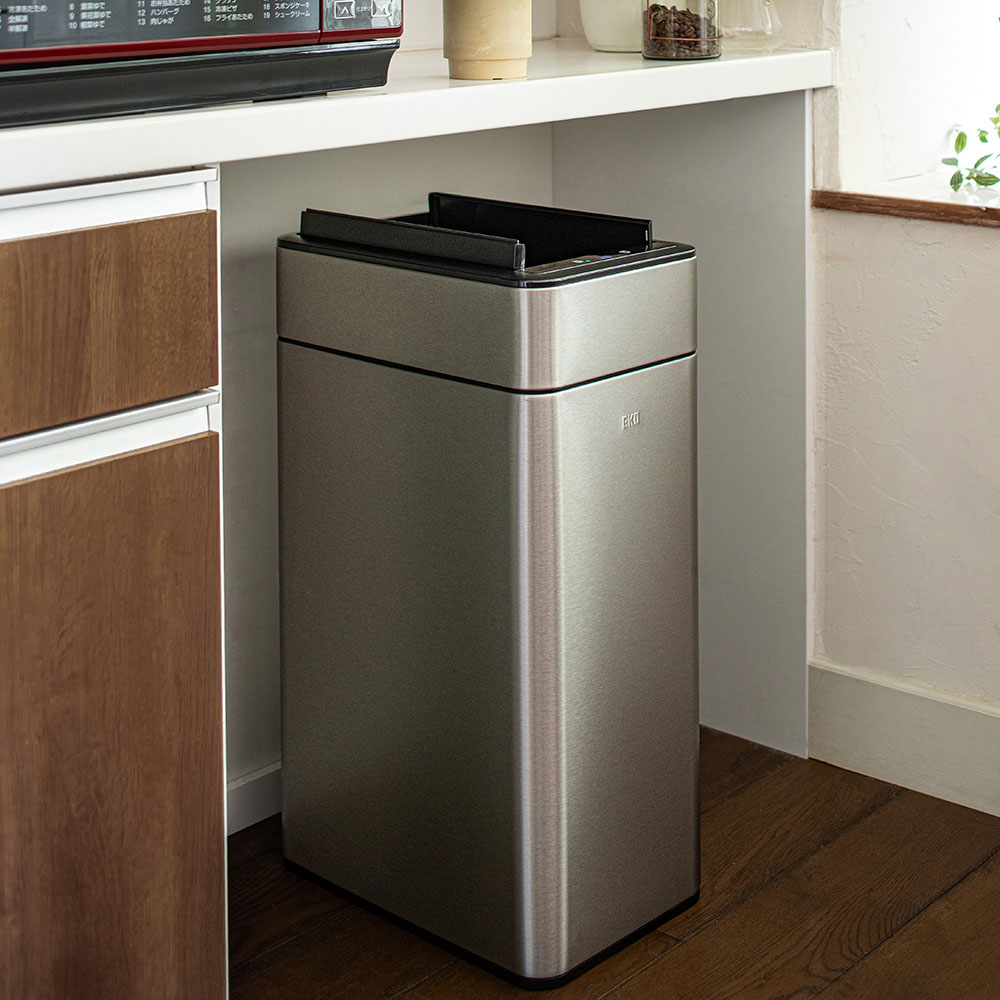 扉の開閉音が最も静かなスーパーサイレント仕様の最新モデル。真上のみを感知するスマートセンサー搭載で不要な開閉を防ぎ、快適に使えます。さらに、観音開きの扉は高さ制限のある場所に設置しやすい省スペース設計で、カウンター下などにも対応。ニオイが広がりにくい構造や洗いやすいインナーボックスなどスタイリッシュなボディに使いやすい工夫が満載です。効率的で衛生的でおしゃれ!手をかざすだけで自動で開閉するセンサー式ゴミ箱。両手がふさがっていてもゴミが捨てられて効率的。高機能センサーは真上のみ感知するので、前を通っただけではフタは開きません。両開きのフタは高さを抑えて開閉できるので、棚やカウンター下にも置けます。18L、35L、50Lの3サイズがあり、生活環境に合わせて選べます。本体は清潔感と高級感のあるステンレス製。凹凸のないシームレスな形状で、見た目もスマートです。カラーはベーシックな3色から、お部屋の雰囲気に合わせて選べます。EKOブランドの中で最も開閉音が小さい最新モデル(2025年8月時点)。寝室でも使用できるほどの静音設計です。スマートセンサーは真上のみ感知するので、近くを通たるびに不必要に扉が開いてしまうストレスがありません。コントロールパネルを押して、手動でフタを開閉することもできます。フタが中に入ることで空気の流れを抑え、ゴミ箱の中のニオイが外に広がりにくくなっています。センサーで開閉する扉は内開きの観音開きタイプ。高さ制限のある場所にも置きやすい設計です。※センサーは上部約25cmまで感知します。棚下25cm確保できない場合は、センサー部分だけ前に出す等ご調整ください。インナーボックスは取り外して水洗いが可能。万が一ゴミ袋が破れても本体に汚れが付かず、清潔に使い続けられます。ゴミ袋は本体付属のリング(取っ手)に引っ掛けてセットします。フタをかぶせれば外からゴミ袋が見えない仕様なので、お部屋がすっきり見えます。電池は単3電池2本でOK。4本必要だった従来品と比べて半分になり、経済的になりました。電池の残量が少なくなると、インジケーターが赤く点灯してお知らせしてくれます。