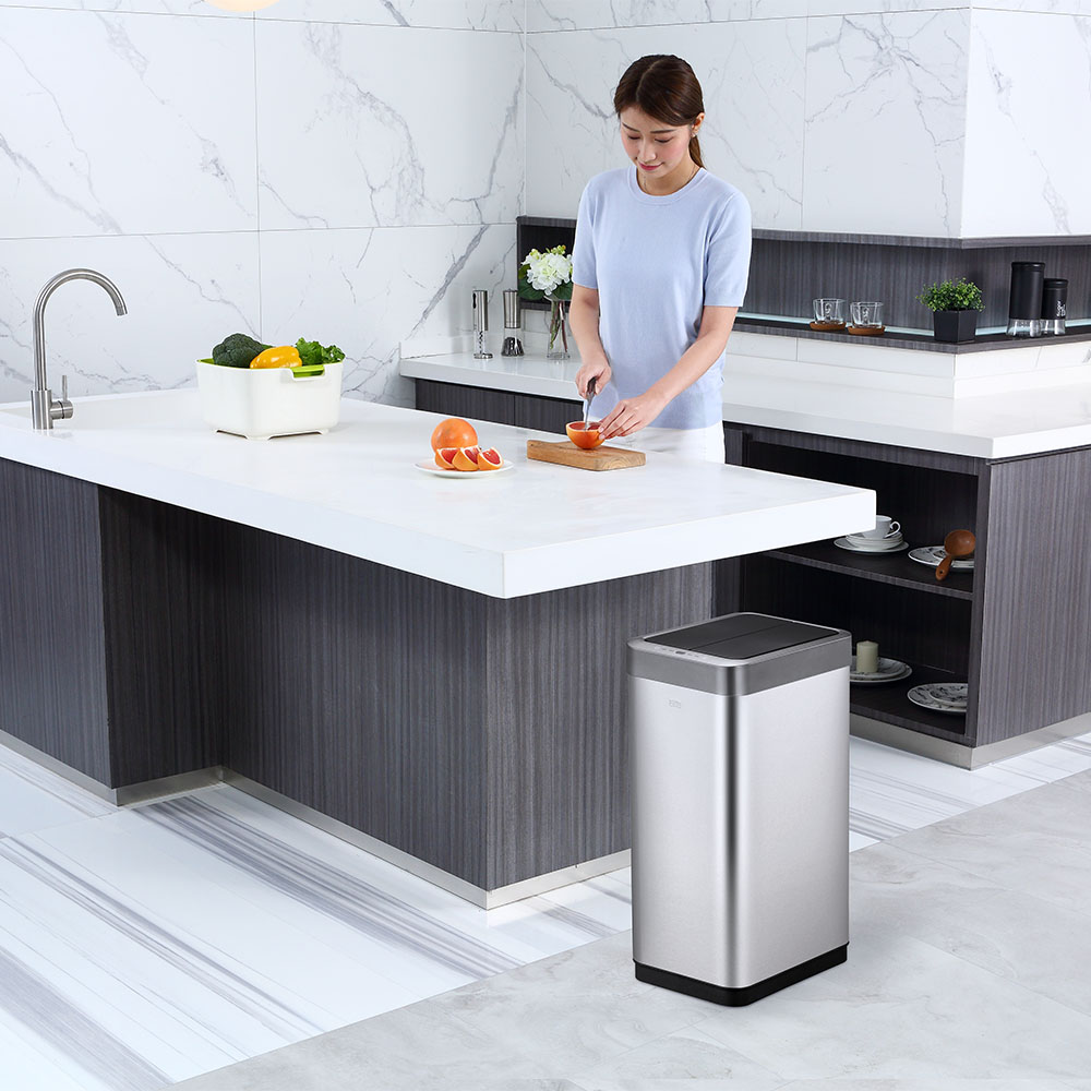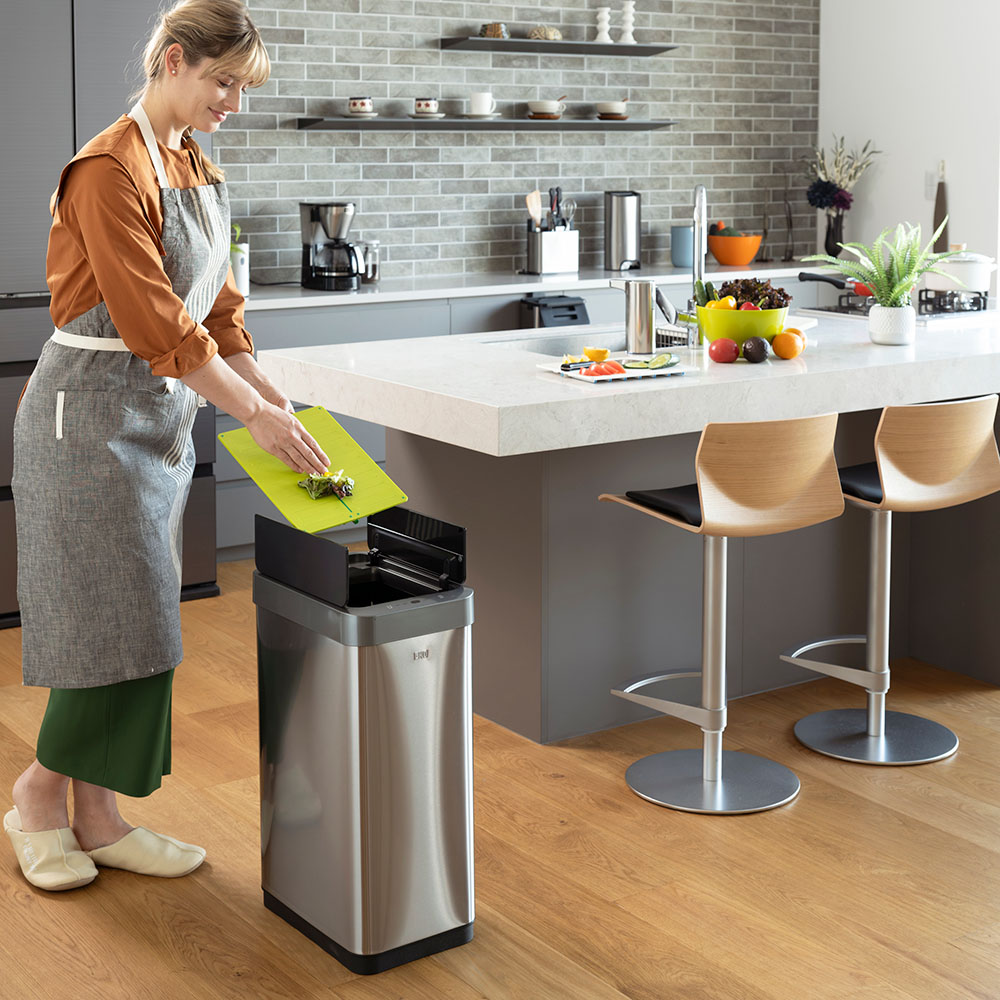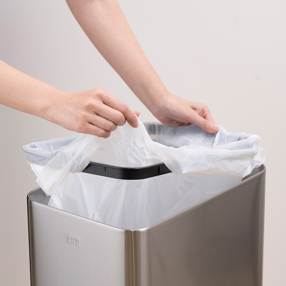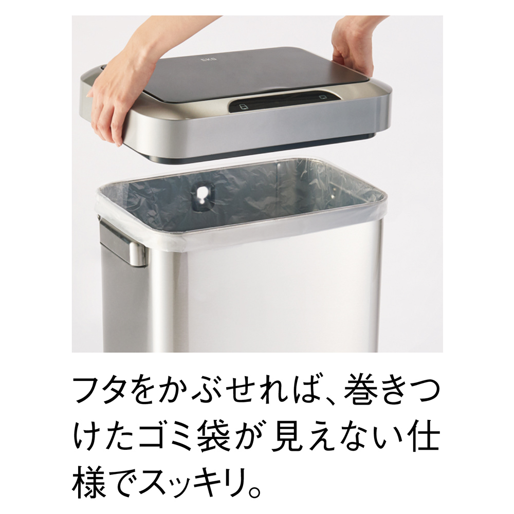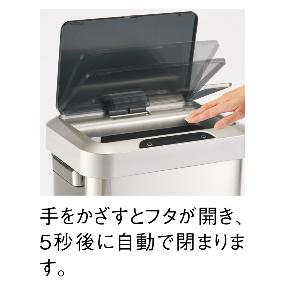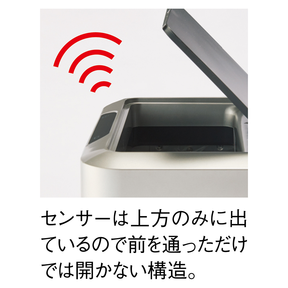 センサー式でこのお値段。狭い場所にも置けるたて型タイプの登場!手をかざすだけでフタがオープン、5秒後に自動的に閉まりますふた部分に手をかざすだけでフタが開くのは本当に便利で一度使うと普通のごみ箱には戻れないほど。調理中に手が汚れている時や両手がふさがっている時に本当に重宝します。また足元のペダルがないのですっきり&お掃除もラクラクです。開けたままにもできますふた部分の開けるボタンを手で押すと、ずっと開けっ放しにすることもできます。賢いセンサー機能EKOのセンサーは上方のみに出ているので、横切ったりするだけですぐに開いてしまう・・ことがない構造です。ゴミ袋が見えない構造のフタふたに厚みがあるので、中のゴミ袋を隠すことができます。美しいホワイトはディノス企画カラー汚れが取れやすく清潔感のあるホワイトはディノス企画カラーです。気になるランニングコスト(電池代)は・・・驚きの高性能で電池交換なしで15000回の連続開閉が可能です!これはかなり高ポイントです。それでいてこのプライス!センサー付きだと2万円を超えるものが多い中、こちらのお求めやすいプライスにもご注目です!