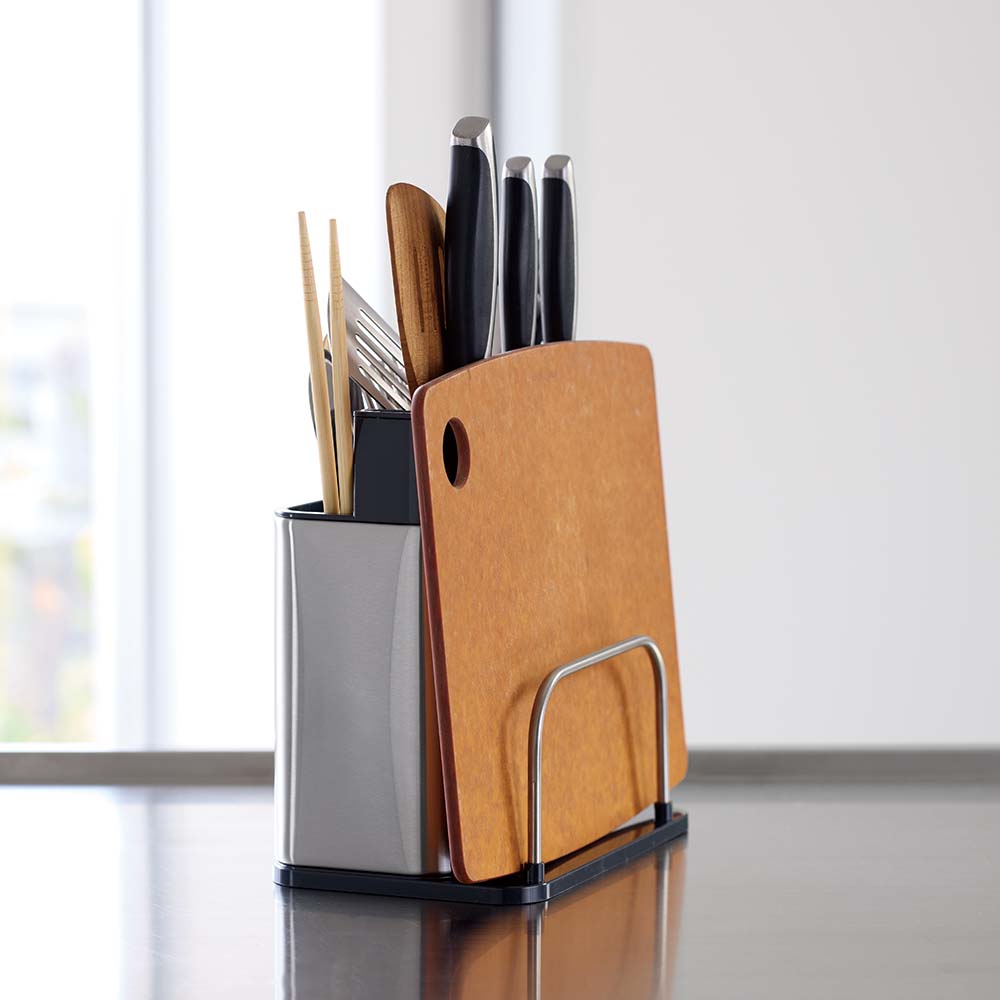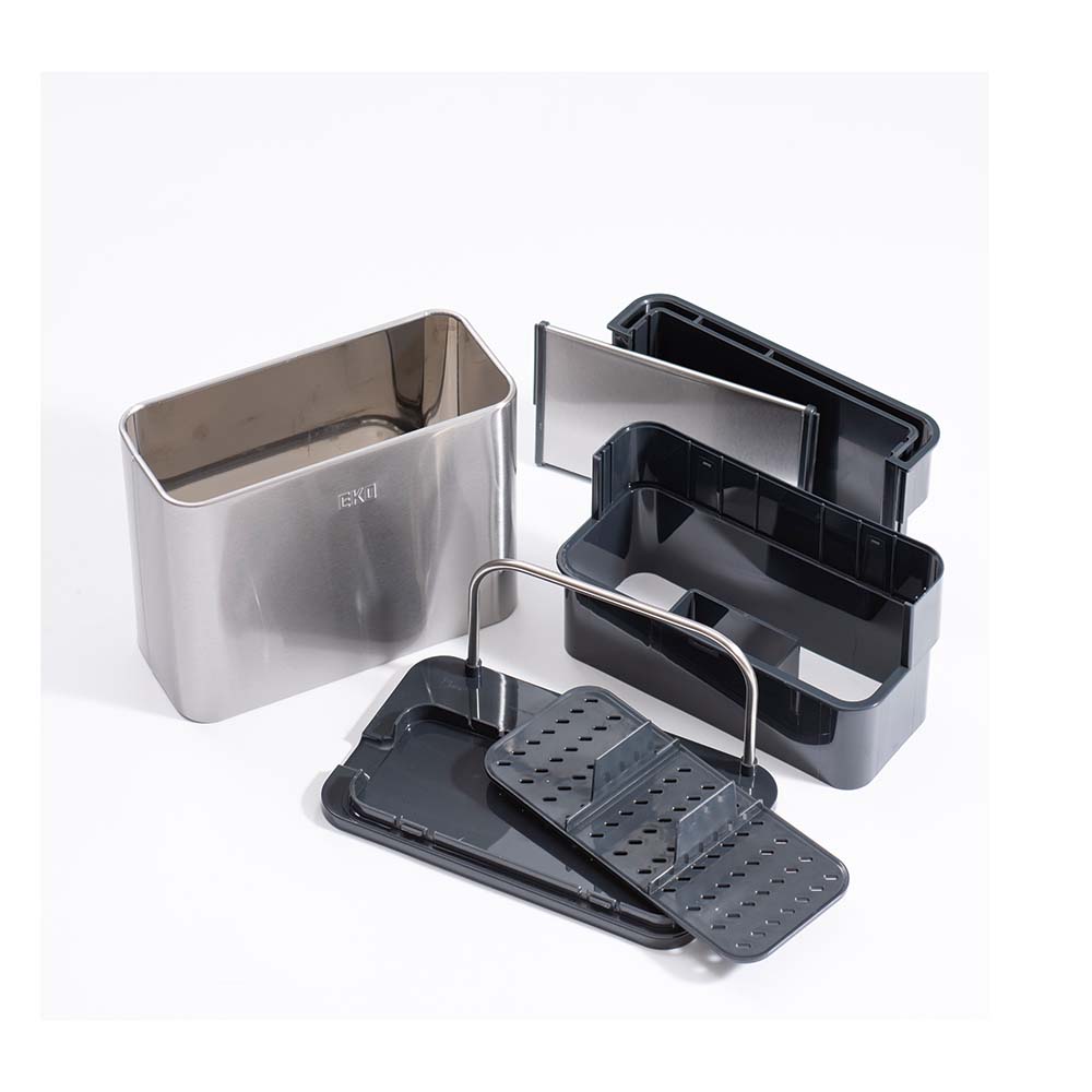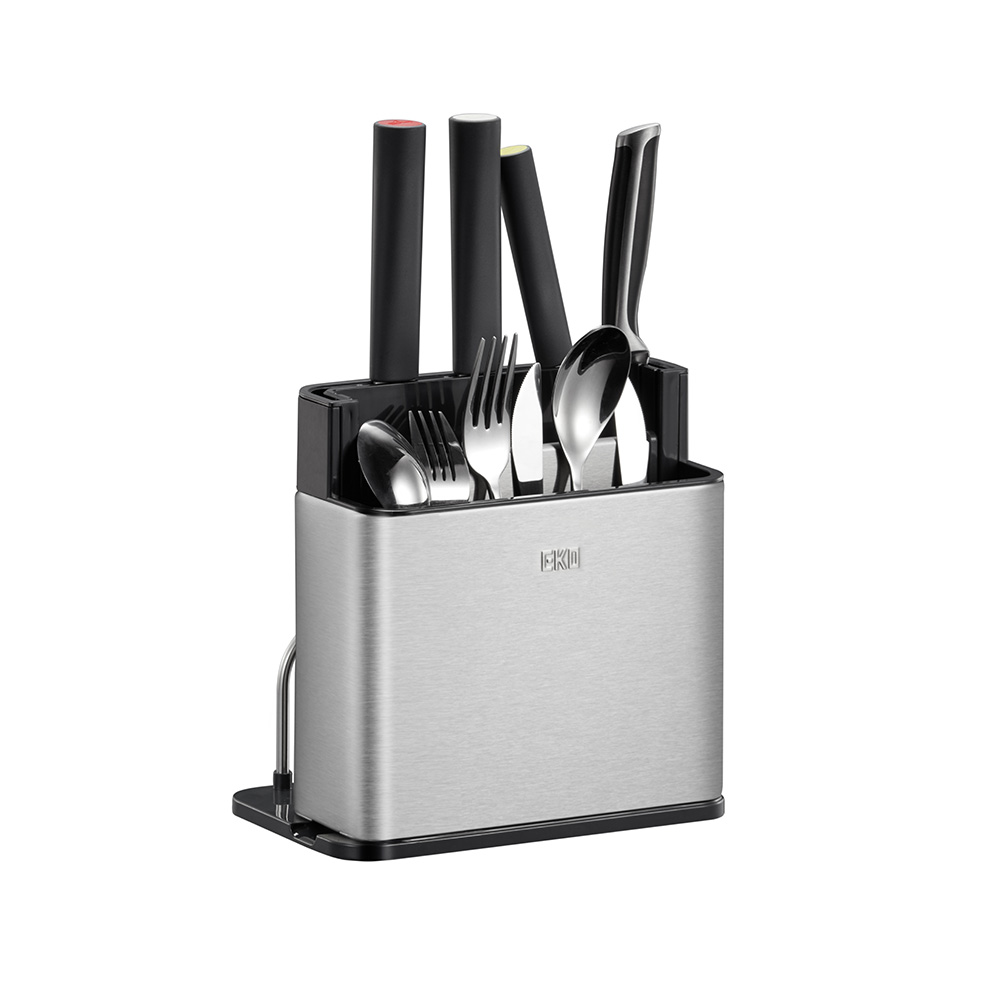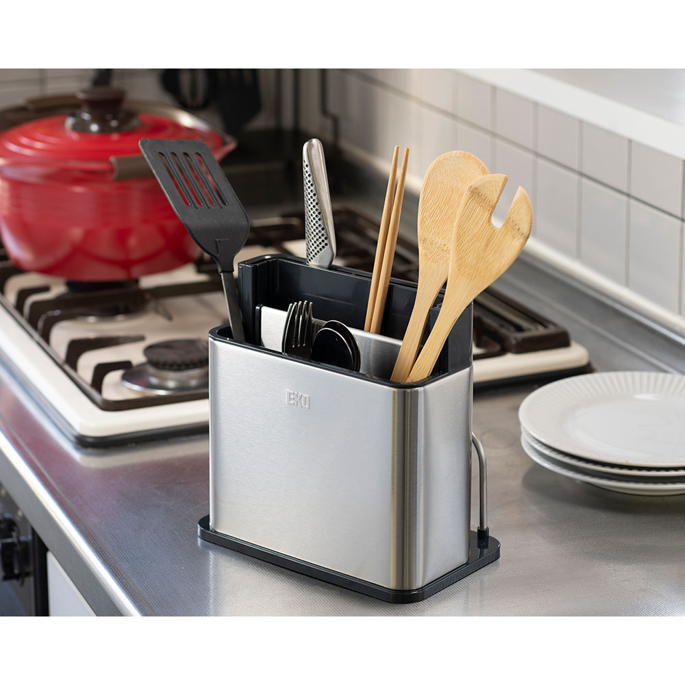 包丁もカトラリーもまな板も、すべてをスマートに一括収納。分解洗浄できるステンレス製オーガナイザープラスで、キッチンワークが変わる。調理の時間を、もっと創造的に。4in1マルチ収納システムで調理がもっと快適にEKOキッチンオーガナイザーは3分割収納に加え、まな板収納スペースを追加した驚きのキッチン収納です。手前エリアには背の低いカトラリー類を整理整頓、中央の自由スペースにはお玉やトングなどの長さのあるツール、奥には包丁を最大3〜4本収納。さらに側面にはまな板をスッキリ立てて保管できるスペースを確保。調理に必要な道具をオールインワンで管理できる画期的なデザインです。スタイリッシュなステンレスデザインがキッチンを引き立てる高品質ステンレス素材を採用したコンパクトでモダンなフォルムは、どんなキッチンインテリアにも調和します。まな板収納機能を追加しながらも洗練されたデザインを維持し、限られたカウンタースペースを有効活用。美しさと機能性を両立したキッチン収納の新基準です。徹底的な清潔さを実現する分解可能構造食材に直接触れるまな板とキッチンツールを収納するからこそ、衛生面は最重要。EKOキッチンオーガナイザープラスは完全分解できる設計で、普段は手の届かない内部まですみずみまで洗浄可能。まな板を立てて収納することで通気性も確保し、カビや雑菌の繁殖を防ぎます。食の安全にこだわる方に理想的な機能性です。調理ワークフローを最適化する統合収納包丁、まな板、調理器具をひとつの場所にまとめることで、調理の準備から実行、片付けまでのプロセスが驚くほどスムーズになります。必要なツールがすべて手の届く範囲に整理されているため、無駄な動きが減り、効率的な調理が可能に。特に限られたスペースのキッチンでその真価を発揮します。多様なキッチンツールとまな板に対応する優れた収納力さまざまな形状や大きさのキッチンツールはもちろん、プラスチック製の薄いまな板から厚手の木製まな板まで、幅広いタイプに対応。一般的なサイズのまな板であれば複数枚を立てて収納することも可能です。料理好きの方が持つ多彩なキッチンアイテムを美しく整理できます。使い手を考え抜いた実用的な設計日々のキッチンワークを徹底分析して生まれた、使い勝手を最優先にした設計。まな板の出し入れがスムーズで、調理の準備から片付けまでの時間を短縮します。散らかりがちなキッチンカウンターを整然と保ち、調理スペースを最大化。キッチン環境の改善を本気で考えるなら、このオールインワンオーガナイザーがあなたの強い味方になります。