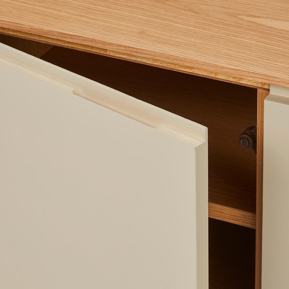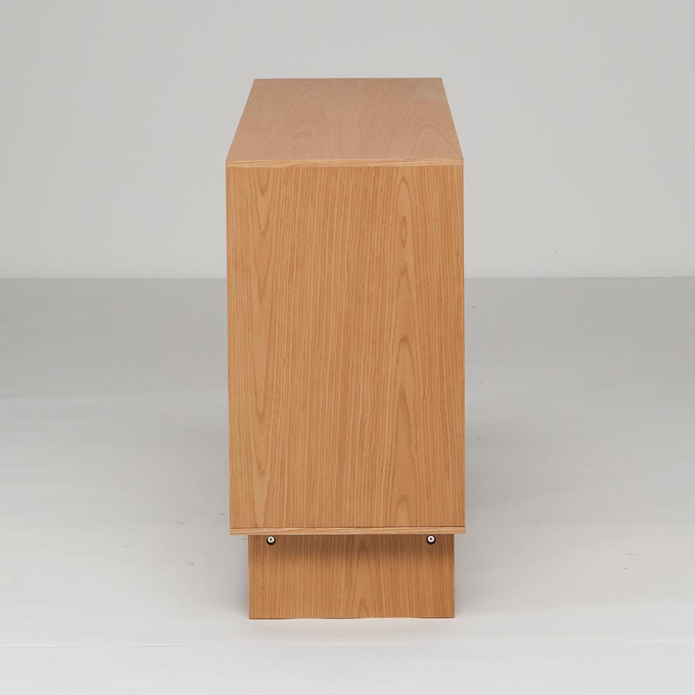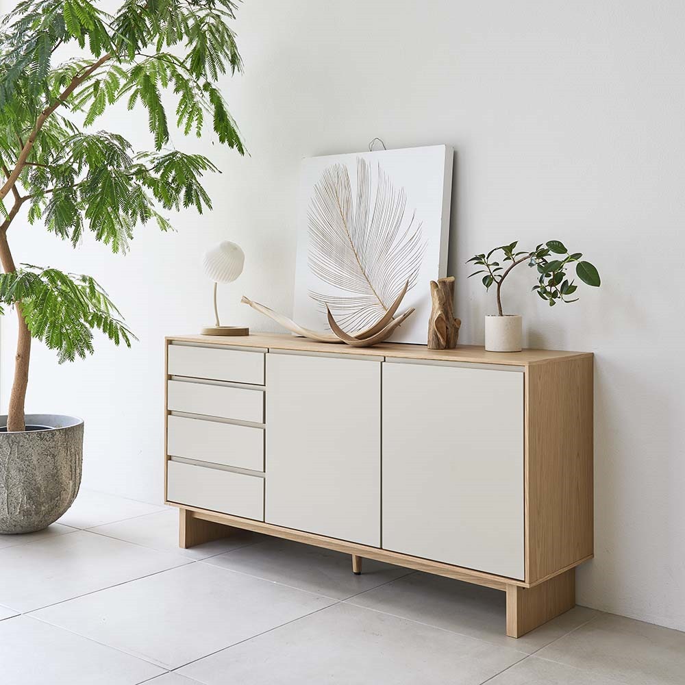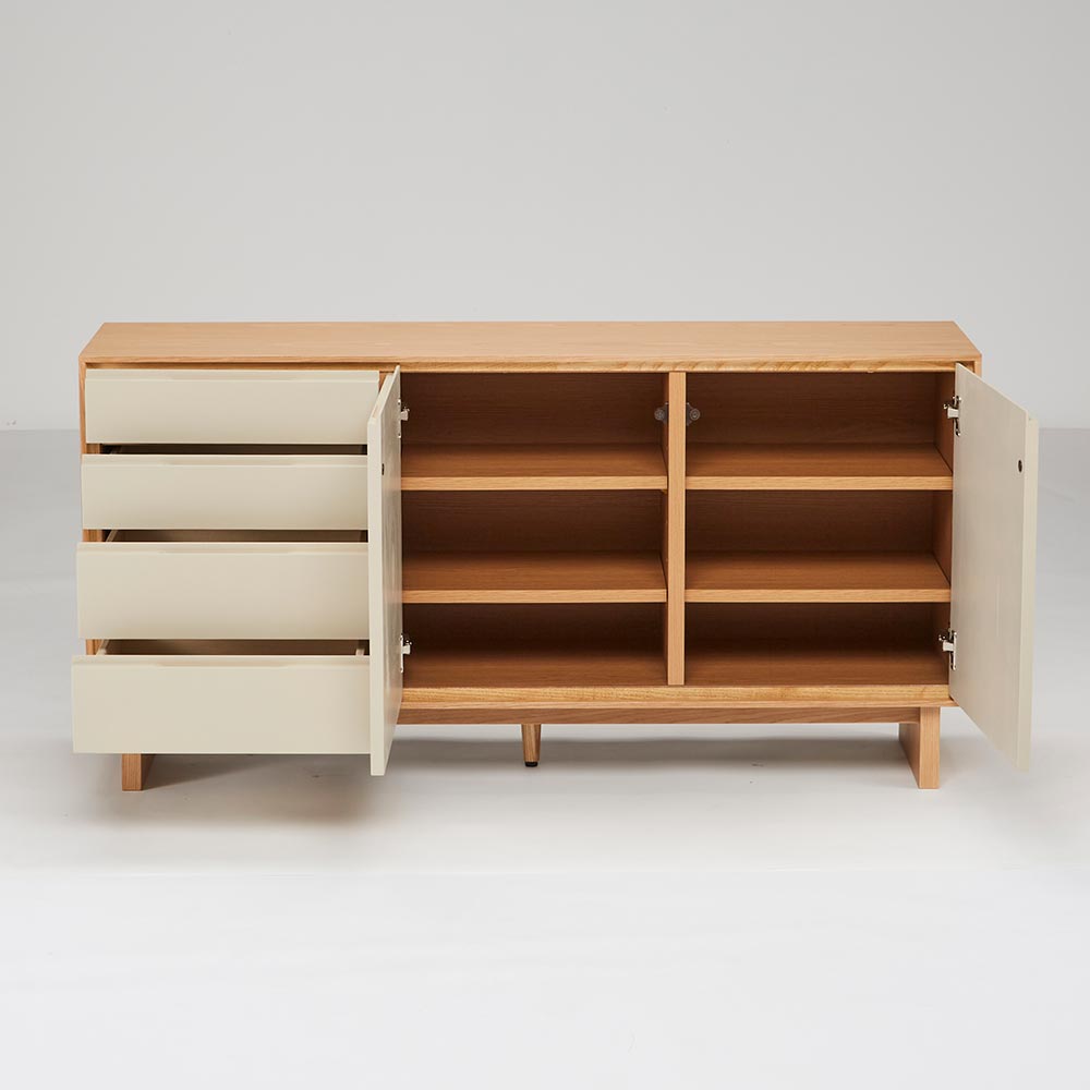 四方を囲った天然の木目とグレージュトーンの前板の組み合わせが魅力の上質なフォルム。北欧×和の美意識を纏った、暮らしを整えるサイドボードシリーズ。バイカラーが映えるジャパンディデザイン天然の木目がもたらす柔らかな風合いに、落ち着いたグレーの前板を組み合わせたバイカラーデザインが部屋のインテリアのアクセントに。北欧のナチュラルな心地よさと、日本のミニマルな美意識を融合させたジャパンディスタイルのシリーズです。使いやすさにこだわった収納設計・引き出しは高さ6cmと9cmの引出を組み合わせた4段収納で、雑誌や説明書、小物を効率よく整理可能。・フルスライドレール仕様なので奥までスムーズに引き出せ、出し入れのストレスを軽減します。長く使える安心の強度・引き出しは荷重や歪みに強いロッキング箱組を採用。底抜けや前板外れを防ぎ、長年の使用にも耐える安心の強度を実現しました。・脚部は圧迫感を与えない下駄脚デザインで、荷重に強く安定感も抜群。10cmの脚高は部屋に圧迫感を与えず、お掃除ロボットにも対応して部屋の美しさを保てるのも嬉しいポイントです。