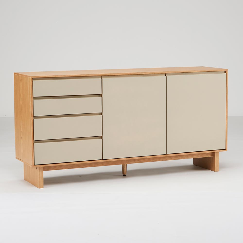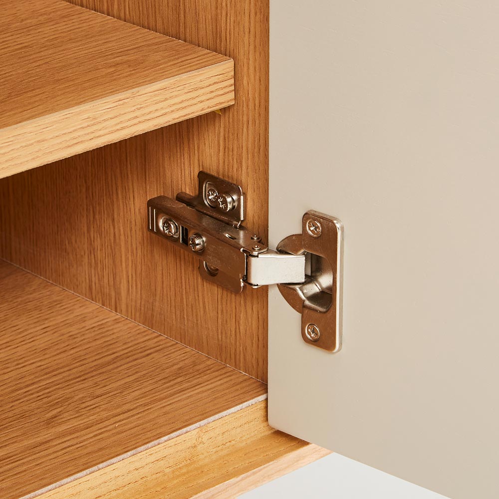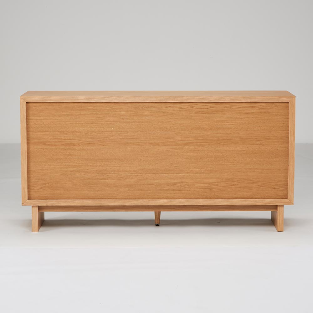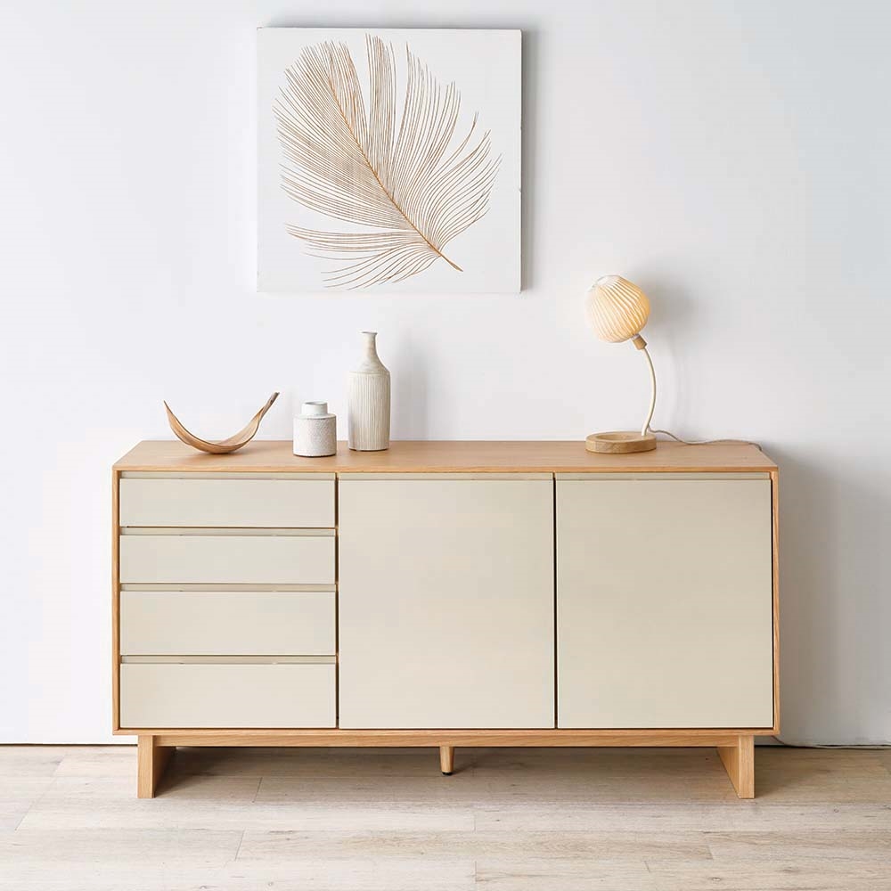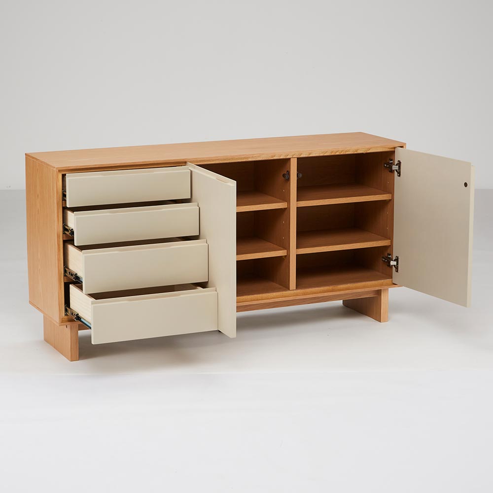 四方を囲った天然の木目とグレージュトーンの前板の組み合わせが魅力の上質なフォルム。北欧×和の美意識を纏った、暮らしを整えるサイドボードシリーズ。バイカラーが映えるジャパンディデザイン天然の木目がもたらす柔らかな風合いに、落ち着いたグレーの前板を組み合わせたバイカラーデザインが部屋のインテリアのアクセントに。北欧のナチュラルな心地よさと、日本のミニマルな美意識を融合させたジャパンディスタイルのシリーズです。使いやすさにこだわった収納設計・引き出しは高さ6cmと9cmの引出を組み合わせた4段収納で、雑誌や説明書、小物を効率よく整理可能。・フルスライドレール仕様なので奥までスムーズに引き出せ、出し入れのストレスを軽減します。長く使える安心の強度・引き出しは荷重や歪みに強いロッキング箱組を採用。底抜けや前板外れを防ぎ、長年の使用にも耐える安心の強度を実現しました。・脚部は圧迫感を与えない下駄脚デザインで、荷重に強く安定感も抜群。10cmの脚高は部屋に圧迫感を与えず、お掃除ロボットにも対応して部屋の美しさを保てるのも嬉しいポイントです。
