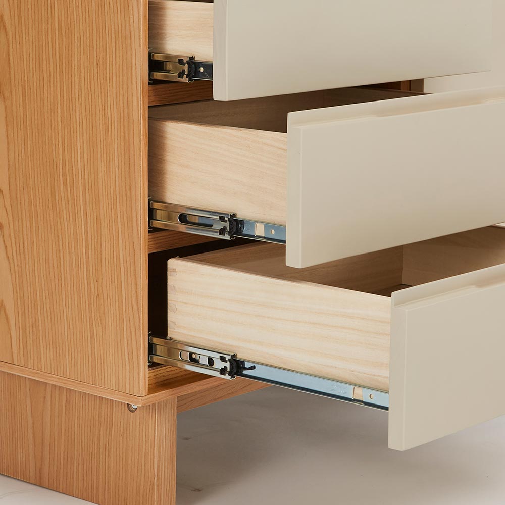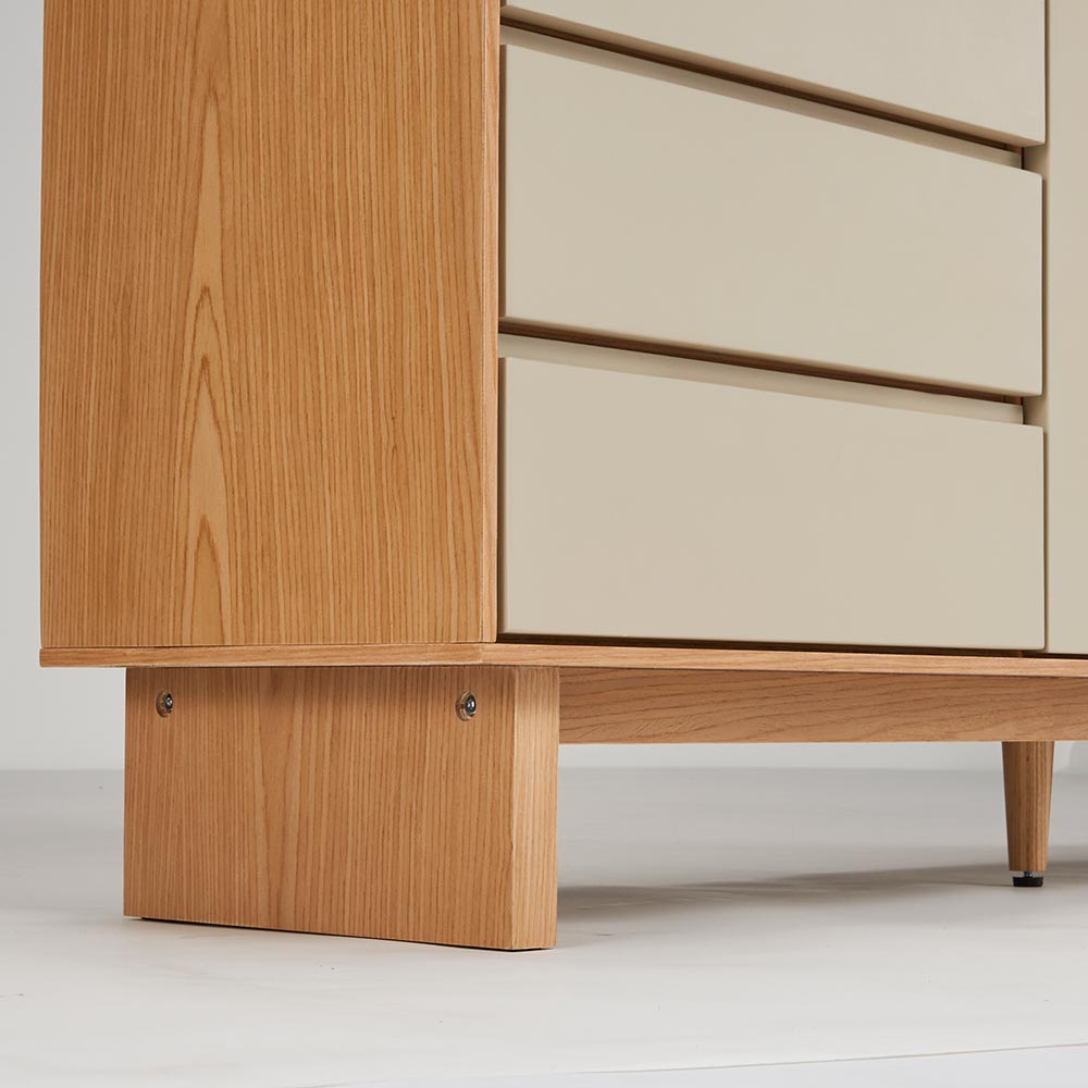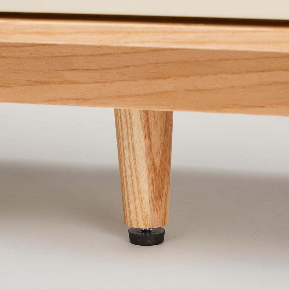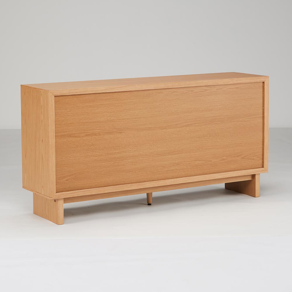 四方を囲った天然の木目とグレージュトーンの前板の組み合わせが魅力の上質なフォルム。北欧×和の美意識を纏った、暮らしを整えるサイドボードシリーズ。バイカラーが映えるジャパンディデザイン天然の木目がもたらす柔らかな風合いに、落ち着いたグレーの前板を組み合わせたバイカラーデザインが部屋のインテリアのアクセントに。北欧のナチュラルな心地よさと、日本のミニマルな美意識を融合させたジャパンディスタイルのシリーズです。使いやすさにこだわった収納設計・引き出しは高さ6cmと9cmの引出を組み合わせた4段収納で、雑誌や説明書、小物を効率よく整理可能。・フルスライドレール仕様なので奥までスムーズに引き出せ、出し入れのストレスを軽減します。長く使える安心の強度・引き出しは荷重や歪みに強いロッキング箱組を採用。底抜けや前板外れを防ぎ、長年の使用にも耐える安心の強度を実現しました。・脚部は圧迫感を与えない下駄脚デザインで、荷重に強く安定感も抜群。10cmの脚高は部屋に圧迫感を与えず、お掃除ロボットにも対応して部屋の美しさを保てるのも嬉しいポイントです。