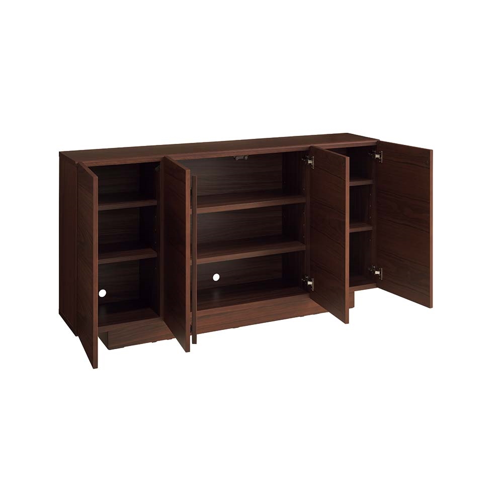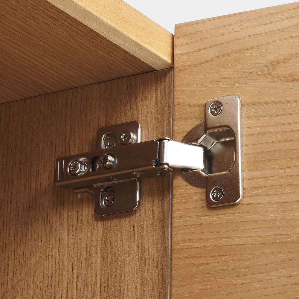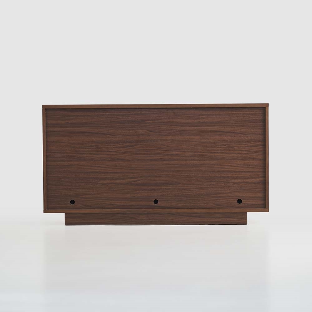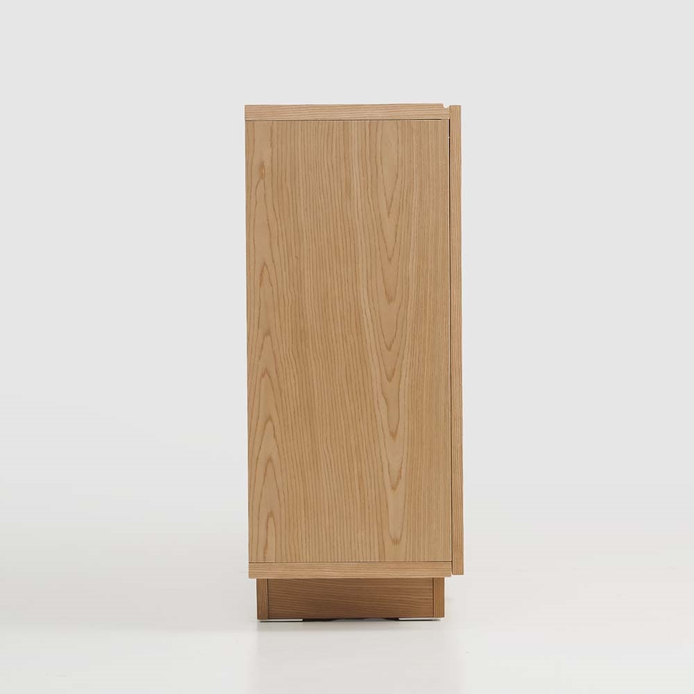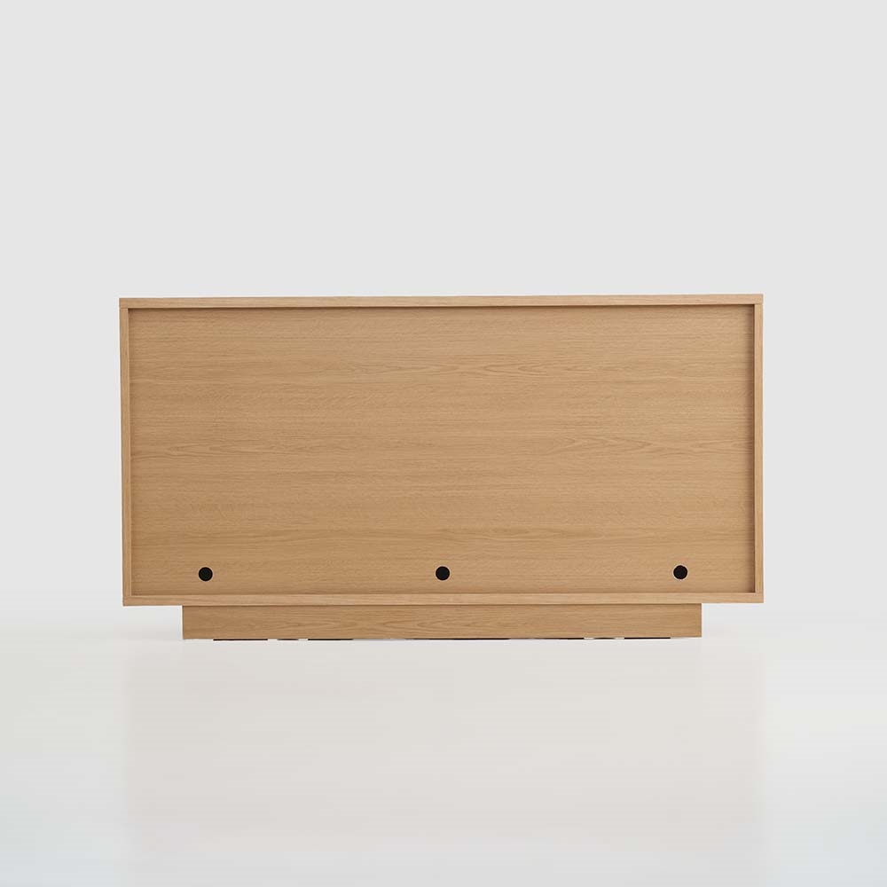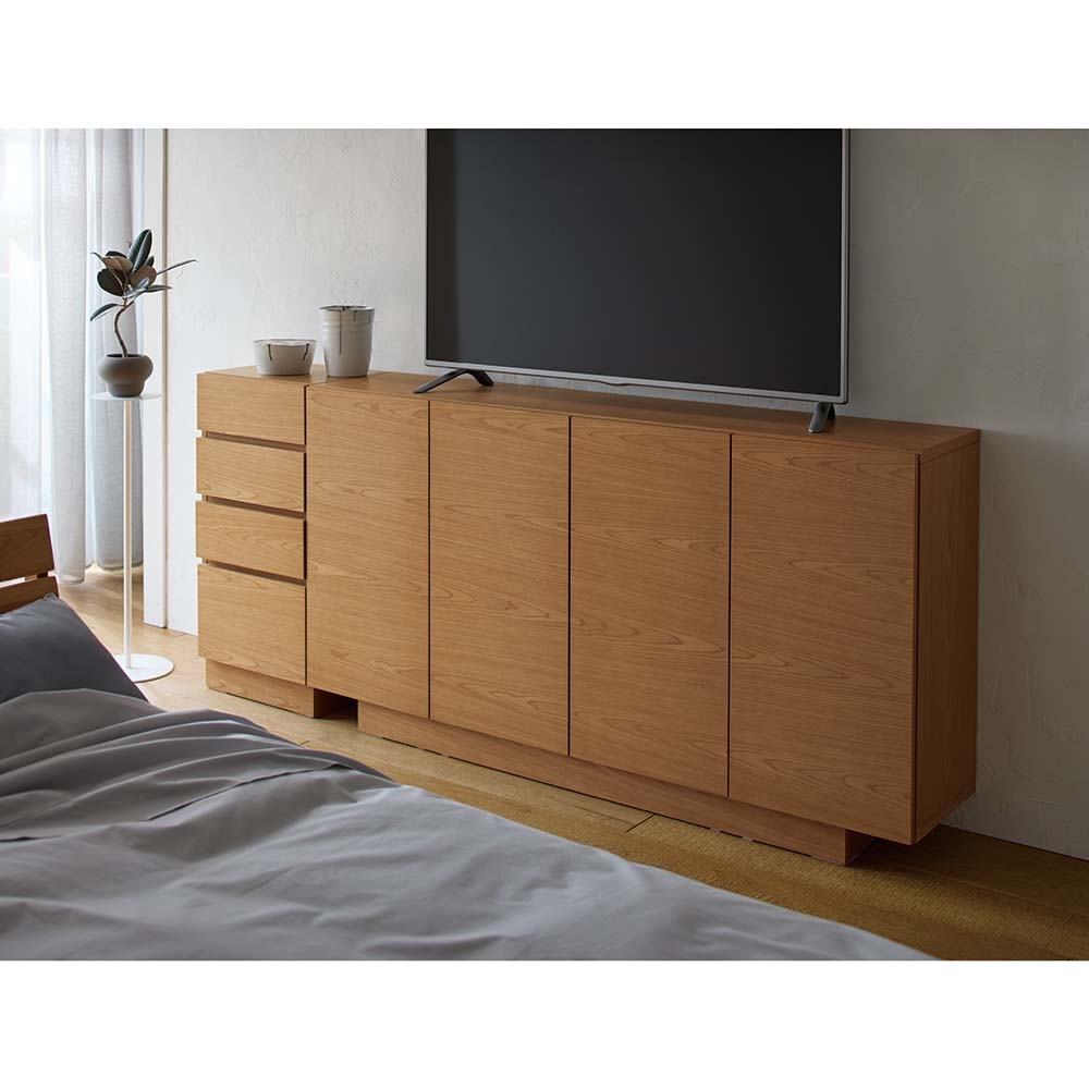 木目が横模様で揃っているので、まるで「一枚板」のような圧倒的な存在感。天然木工芸突板を使い、木目が横へひと続きに見えるデザインにこだわりました。内部中央は仕切りをなくして広々と。長さのあるものもすっきり収納できる仕様です。