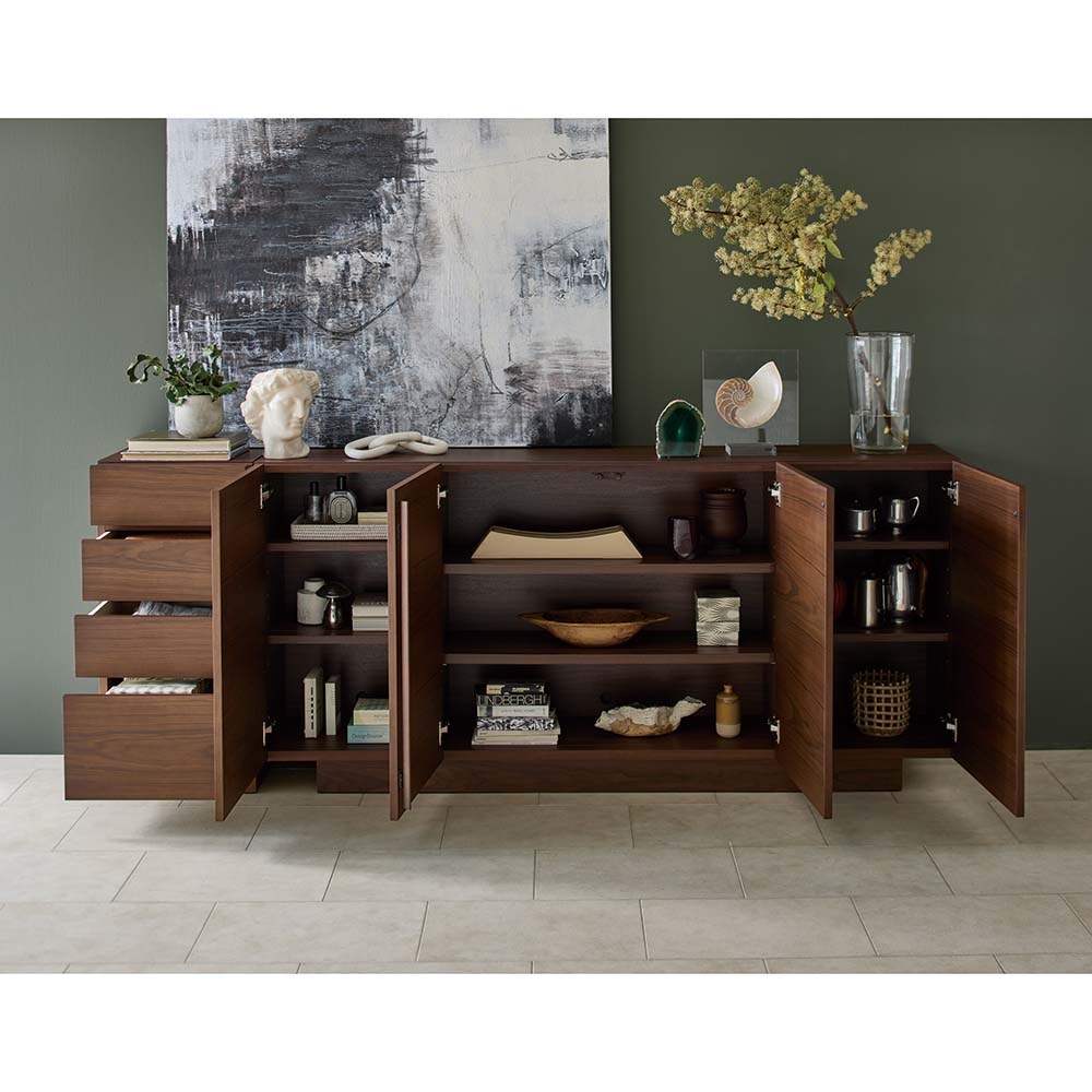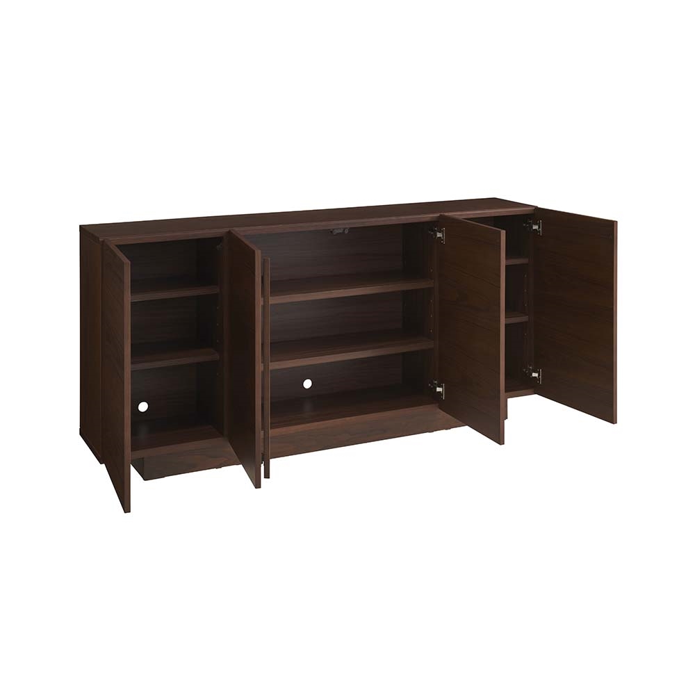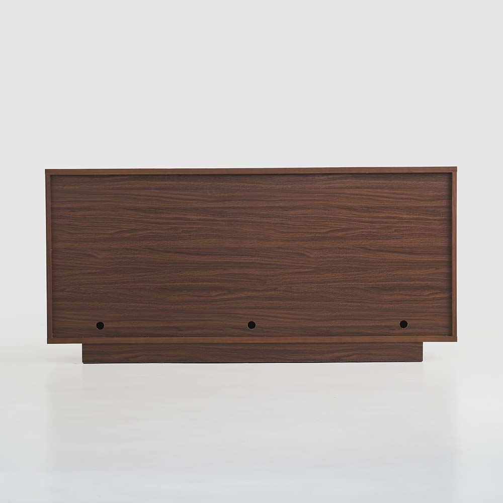 木目が横模様で揃っているので、まるで「一枚板」のような圧倒的な存在感。天然木工芸突板を使い、木目が横へひと続きに見えるデザインにこだわりました。内部中央は仕切りをなくして広々と。長さのあるものもすっきり収納できる仕様です。
