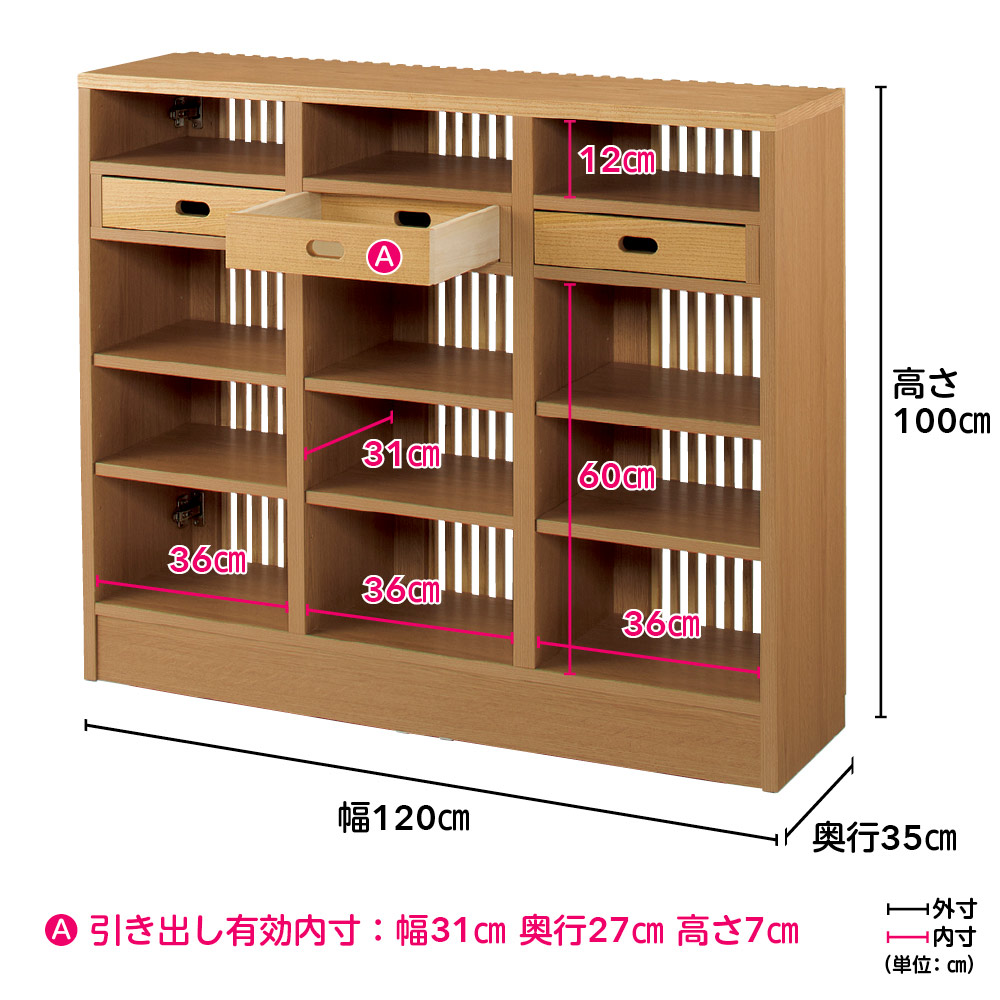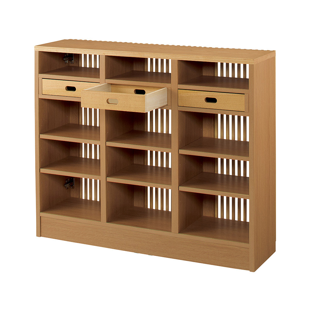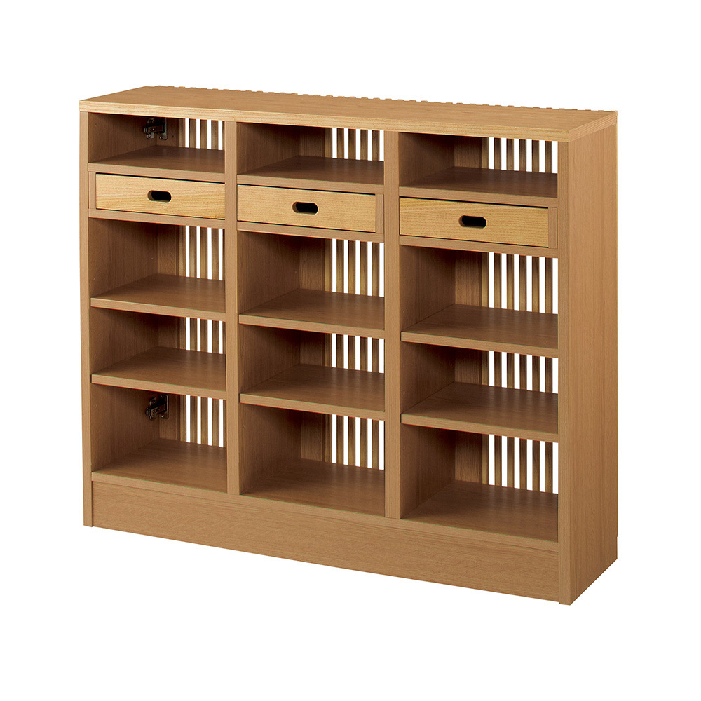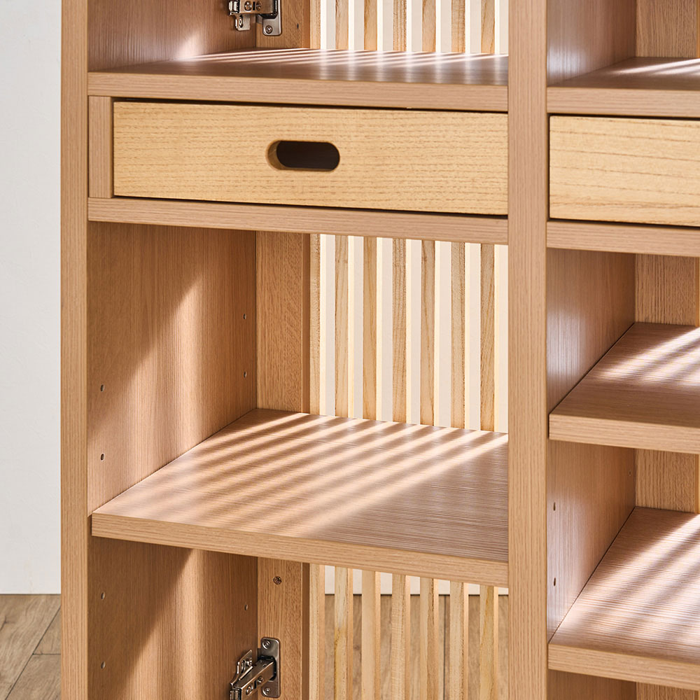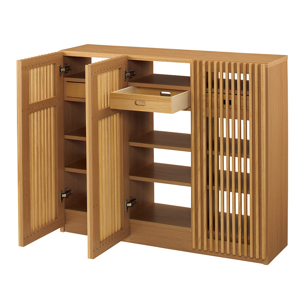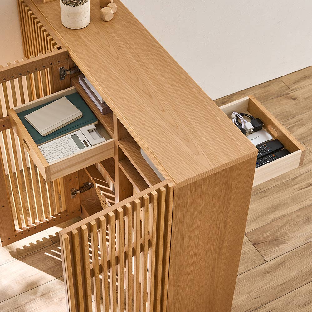 両面から使える引き出し、ほどよく隠せるルーバー扉、出し入れしやすいオープン収納を組み合わせたリビングキャビネット。隠す、収納する、仕切るをおしゃれに叶えます。収納する、隠す、仕切るをおしゃれに叶えます幅120cmタイプ 扉側片面にほどよい透け感のあるルーバー扉を採用したキャビネット。間仕切りとして使っても圧迫感がありません。見せる収納も隠す収納も楽しめます幅120cmタイプ オープン側両面から使える引き出し、ほどよく隠せるルーバー扉、出し入れしやすいオープン収納を組み合わせました。両側から収納が使えるスグレモノ幅120cmタイプ 左面:扉側 右面:オープン側間仕切り使いを想定して、どちら側からも収納を利用できる仕様に。お部屋に合わせて、オープン側とルーバー扉側を使い分けられます。お部屋に合わせてサイズ、置き方、見せ方が選べます写真左:扉側 写真右:オープン側 写真下:扉・引き出しを開けた状態両面から取り出せるリビングキャビネットシリーズは、幅は80cm、120cmの2タイプ。可動棚は6cm間隔で6段階の高さ調節が可能で、お部屋に合わせて扉側とオープン側を使い分けられます。国内メーカーが丁寧に仕上げて完成品でお届けしますので、届いたらすぐお使いいただけます。ソファの背面に置くのもオススメ写真左から幅80cmタイプ(別売り)、幅120cmタイプ。片面は圧迫感がなく通気性の良いルーバー扉仕様で、ソファバックシェルフとしてもオススメ。引き出しはソファ側からも使用可能写真はオープン側ソファの背面に置いた場合、背もたれの高さが73cm以下であれば、ソファ側からも引き出しが開けられます。ルーバー扉のリビングキャビネットとして幅120cmタイプ 壁際に置けば、ルーバー扉で背面オープンのキャビネットに。壁のスイッチやコンセントが使用でき、配線が必要なデジタル機器も収納できます。木漏れ日のような透け感がおしゃれ木漏れ日のような透け感が美しいルーバー扉を採用。収納を充実させながら、天然木の素材感を活かしたナチュラルテイストのインテリアが完成します。