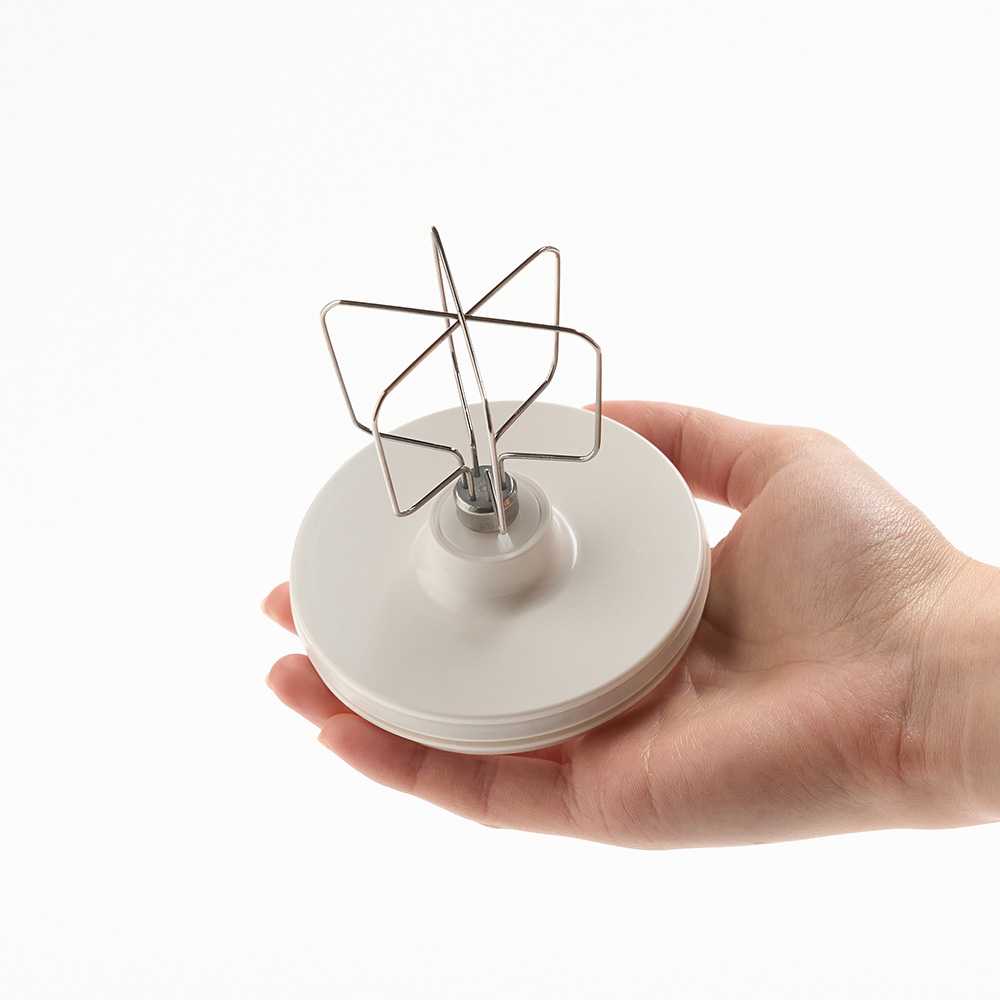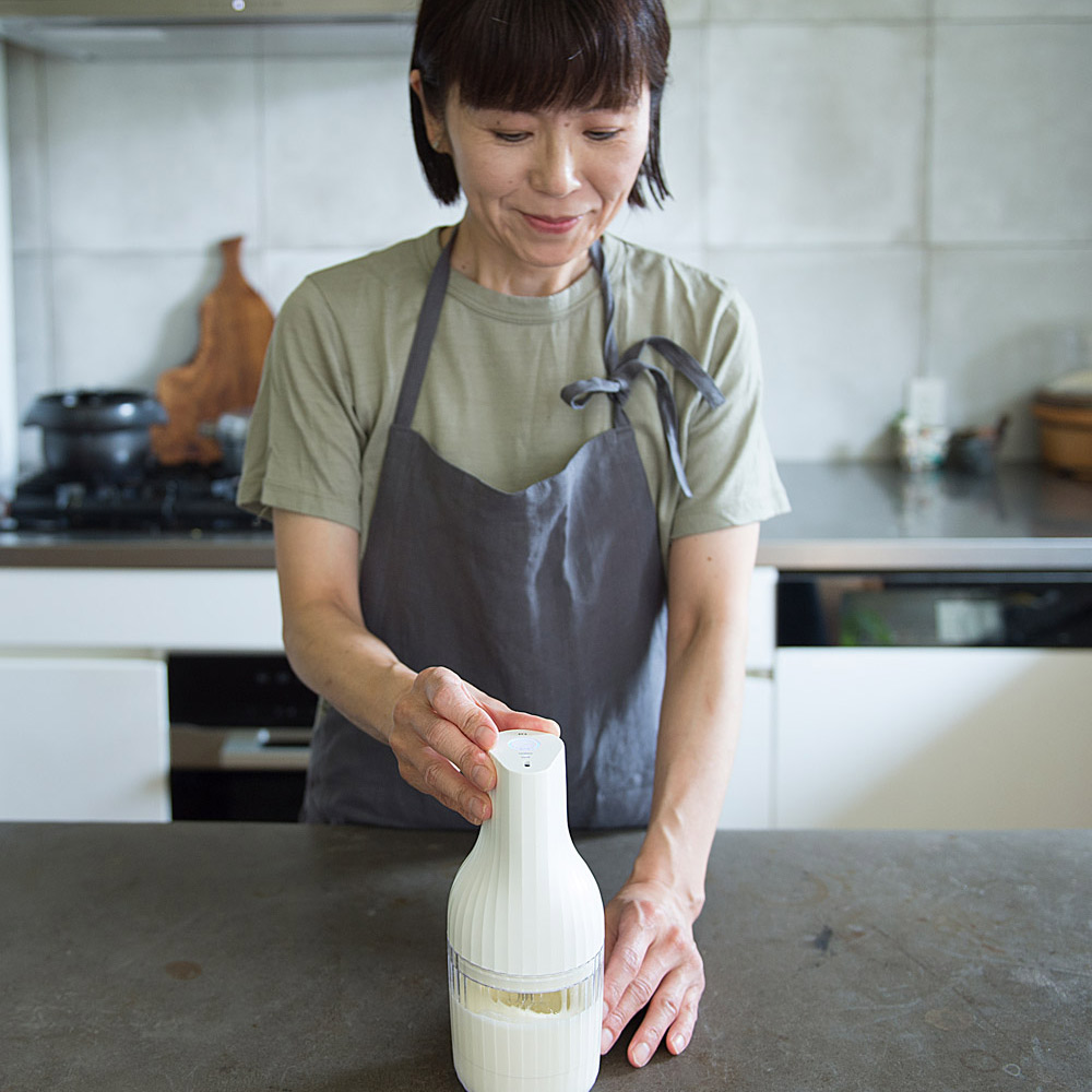 料理家ワタナベマキさんも愛用。生クリームをもっと身近に!という熱い想いから生まれた生クリッチがあれば、わざわざ泡立て器を出してくる面倒も、ボウルを洗う手間もなし。約2分でふわふわの生クリームが完成!生クリームをいつでも気軽に楽しめます。「生クリッチがあると、生クリーム作りが本当に手間なく気軽になります。今日はガトーショコラを生クリームとココアパウダーでおめかし。市販のスイーツも生クリームを添えるだけでぐんと豪華になりますね。」100mlの目盛り付だから計量いらず。「内側のラインに合わせて生クリーム100mlを注ぎ、お好みで砂糖を加えます。計量カップいらずで簡単!」スイッチひとつで、泡立つと自動でストップ。「オートモードのスイッチを押したら放っておけるところがすごい!ゆるめに泡立った時点で自動で止まるので、そこからはマニュアルモードでお好みの硬さに。」生クリームがちょこっと欲しいときに便利!「一度に100mlを泡立てられるから、欲しい時に使い切れる分だけを泡立てられてとても便利です。」用途に応じて好みの硬さに泡立てられます。「フルーツサンド用の生クリームは少し硬めに立てるのがコツ。生クリッチはマニュアルボタンもあるので、仕上がりの硬さを自由に調節できるところもいいですね。」フルーツサンドも気軽に作れます。「クリームたっぷりの贅沢なフルーツサンドもぐんと手軽に。泡立てた生クリームと水切りヨーグルトを半々に混ぜたクリームで作っても、さっぱりとしておすすめですよ。」ラムクリーム添えのフレンチトースト。「フレンチトーストに添える生クリームは、ラム酒で風味づけ。仕上げにメイプルシロップやココアパウダーをかけても美味しいです。」クロワッサンの抹茶クリームサンド。「抹茶とお砂糖を加えて泡立てた生クリームを、市販のクロワッサンにサンドして大人のおやつに。いろいろなフレーバーの生クリーム作りが楽しめます。」使う場所を選ばない、充電式コードレス仕様。充電式のコードレスなのでどこでも持ち運んで使えます。キャンプや持ち寄りパーティなどでも人気を集めること間違いなし。サッと使えるシンプルでコンパクトな設計。使うのが億劫にならない、シンプルでコンパクトな設計。お手入れもしやすく、収納にも場所を取りません。