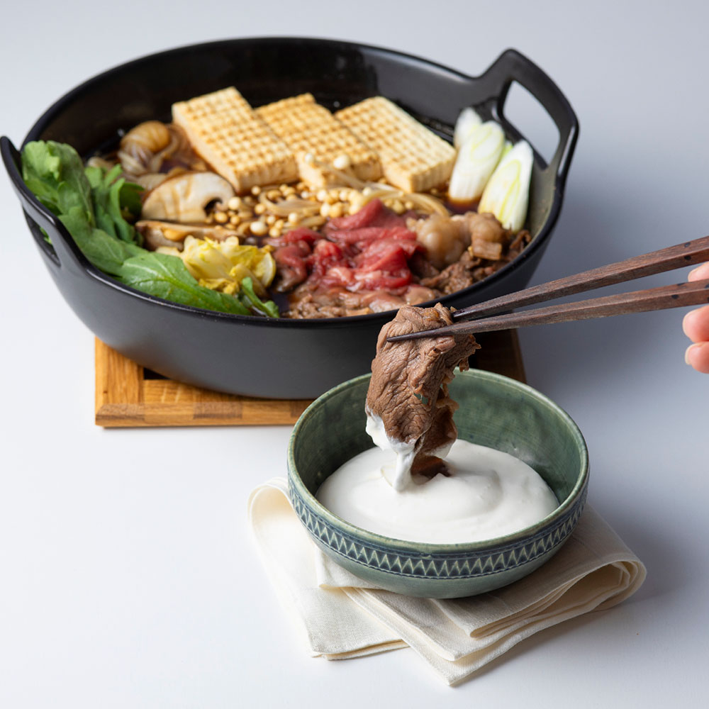 甘くないクリームを添えれば、いつもとはひと味違った新鮮なすき焼きが楽しめます。