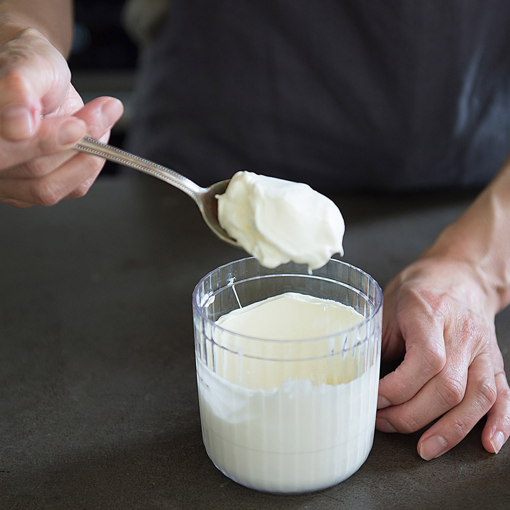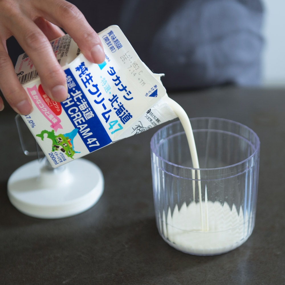 「内側のラインに合わせて生クリーム100mlを注ぎ、お好みで砂糖を入れます。」