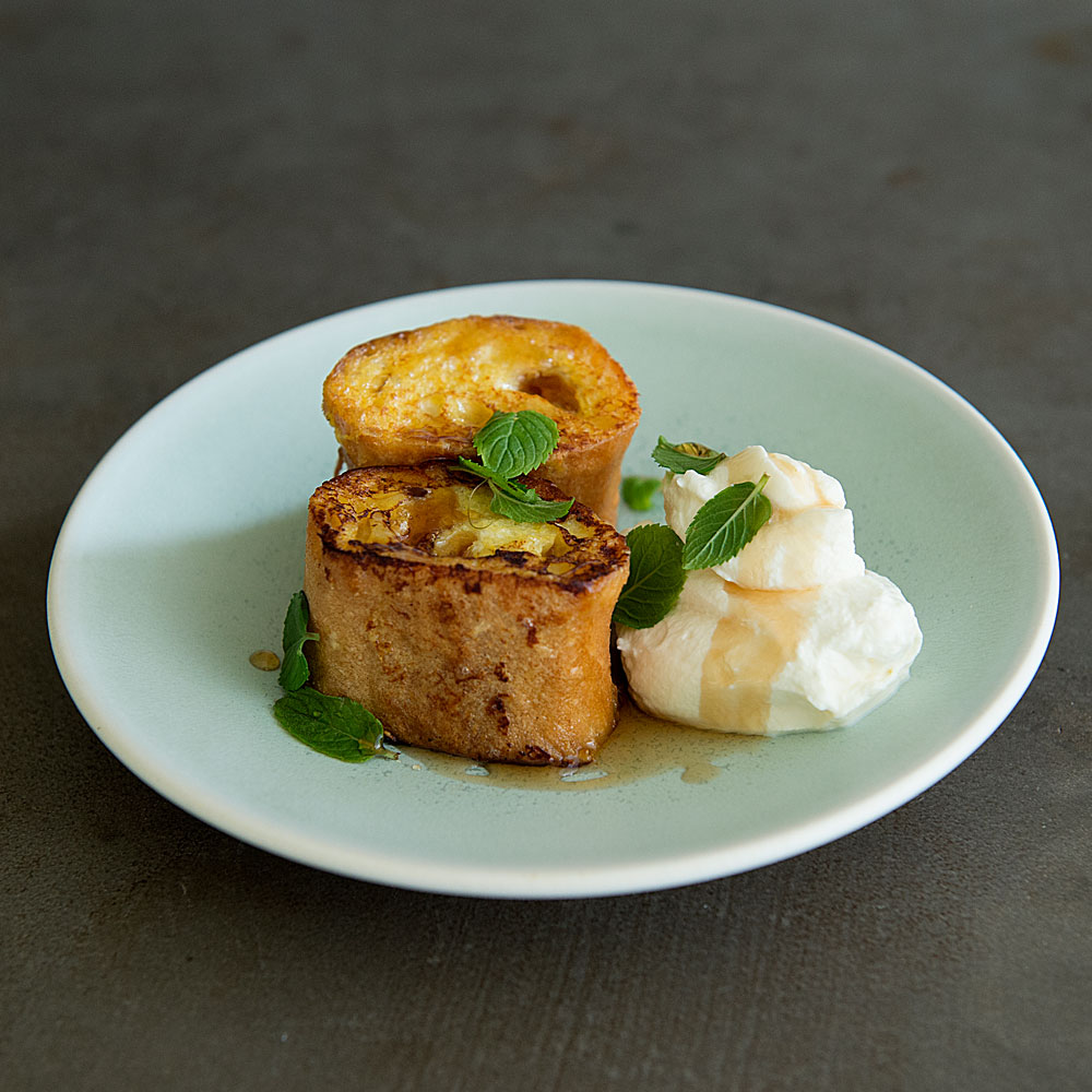 「フレンチトーストに添える生クリームにはラム酒を入れて、お好みでメイプルシロップを。」