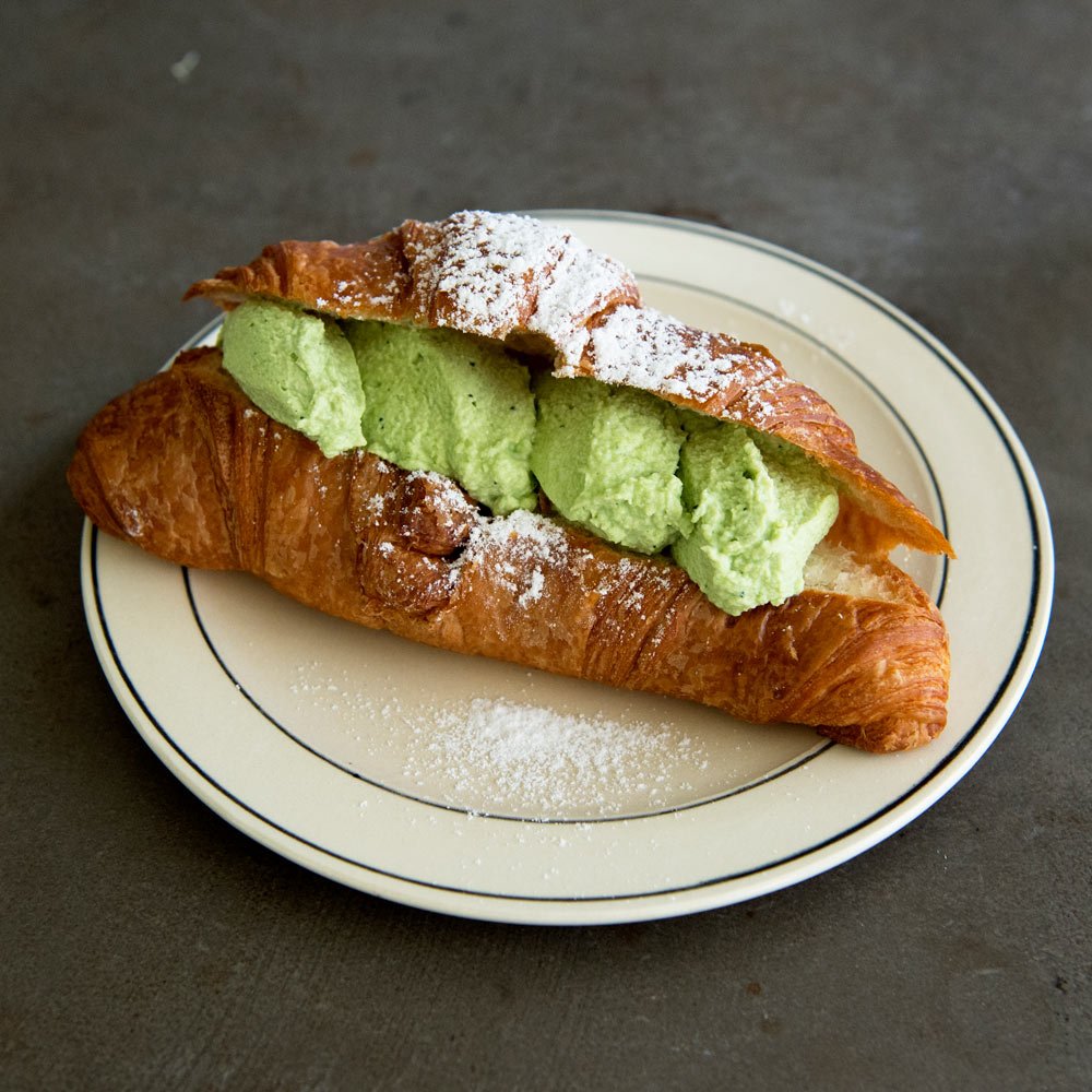 「抹茶を加えて泡立てた生クリームを、クロワッサンにサンドして大人のおやつに。」