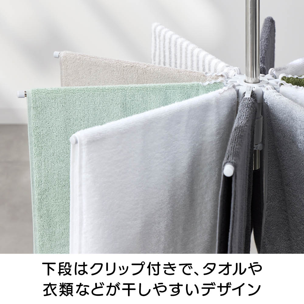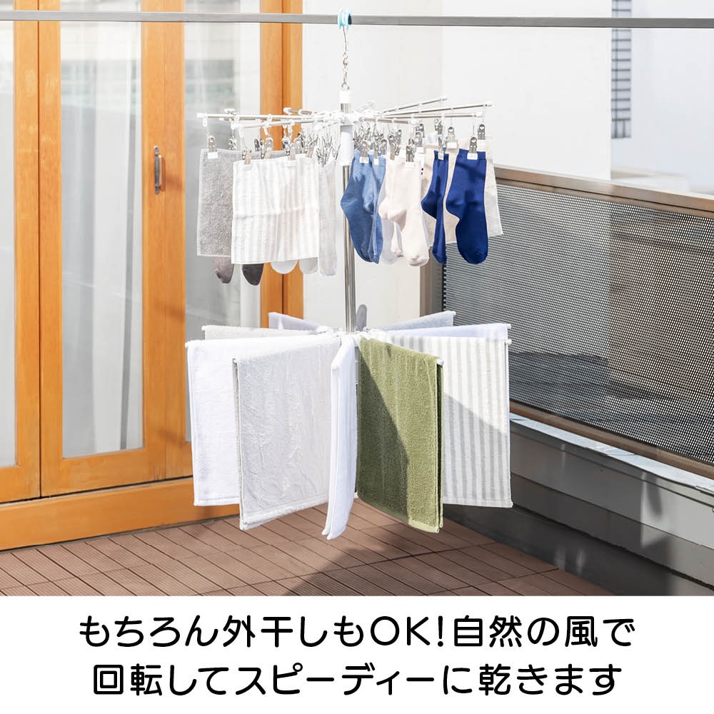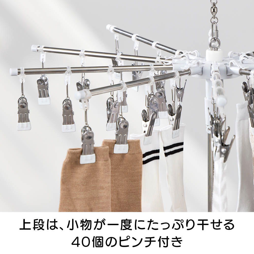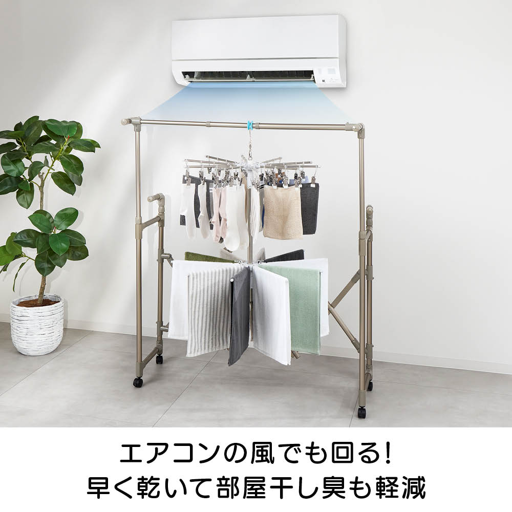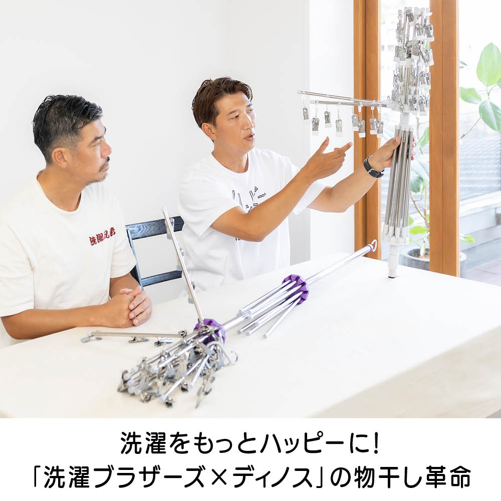 「室内干しだと洗濯物がなかなか乾かなくて邪魔…」「乾きが遅いからなんだか部屋干しのイヤなにおいがする…」などのお悩みを、くるくる回ってくるっと解決!エアコンやサーキュレーターの風で回転し、洗濯物全体に風が当たることで、乾きが早く、部屋干し臭も抑える新発想の「回る物干し」です。省スペース設計ながら、小物や衣類、タオルまできちんと干せる実力派。洗濯のプロ「洗濯ブラザーズ」と共同開発した特許出願中のディノス限定アイテムです。エアコンの風でも回る!早く乾いて部屋干し臭も軽減エアコンのゆるやかな送風でも本体がくるくる回転。洗濯物全体に風が行き渡り、スピーディーに乾かします。いやな部屋干し臭も抑えられ、毎日の洗濯が快適に。サーキュレーターなら、さらにパワフルに!風を活かしてスピード乾燥サーキュレーターの風で、よりパワフルに回転。空気が効率よく循環するので、乾きムラを防ぐことはもちろん、湿気もこもりにくく、室内環境まで快適に整います。上段は、小物が一度にたっぷり干せる40個のピンチ付き上段には、40個のピンチが付いており、ハンカチや靴下、下着などの小物を一度にたっぷり干すことができます。回転しながら効率よく乾くのでお洗濯の時短にもつながります。上段のピンチを外せば、上下段にタオルなどをたっぷり干せる!ピンチはすべて取り外し可能。上下段をポールだけの状態にすれば、タオルなどがたっぷり干せる大容量の物干しに。干したい衣類に合わせて、上段・下段の位置も簡単に調整可能ポールのジョイント部分を緩めたり、締めたりすることで、上下段ともお好きな位置に固定することができます。下段を外せば、ロング丈のアイテムもすっきり干せるワンピースやパンツ、厚手のパーカーなど、長さのある衣類も下段を外せばそのまま干すことができます。乾くスピード約20%アップ!公的機関で実証された時短効果風を受けてくるくる回ることで、従来の回転しない物干しと比べて乾燥スピードが大幅アップ。その実力は、公的機関での試験※でも証明済みです。※本商品と回転しないパラソルハンガーの比較試験。サーキュレーターの風を当て、2kgの洗濯物が乾くスピードを比較。※ユニチカガーメンテック(株)調べなぜ、微風でもくるくる回るの?ヒントは「釣り用ルアー」にありましたフック部分に、釣り用ルアーに使われるベアリングを採用。マグロなどの重い魚のつり上げにも耐える耐荷重の高いベアリングを採用することで、たくさんの洗濯物を干しても、わずかな風で回転するなめらかな動きを実現。たたんでしまえるコンパクト設計でスペースを取りませんポールを折りたためば、幅わずか約9cm程度に。使わないときは、洗面スペースの隙間などに立てかけて収納できます。洗濯をもっとハッピーに!「洗濯ブラザーズ×ディノス」の物干し革命アメリカのヴィンテージ物干しにヒントを得て開発した新発想の物干しです。最大の特長は、微風でもくるくる回って洗濯物に風が均一に当たるため、「早く乾く・ニオわない・自然乾燥で生地を傷めにくい」こと。その実力は、通常の物干しに比べ、厚手のタオルやデニムなどの乾く時間を約20%短縮という結果が証明しています※。さらに、たっぷり干せるデザインとコンパクトにたためる収納性にも徹底してこだわりました。毎日の“干す”が変われば、洗濯はもっと楽しくなる。そんな新しい洗濯体験を、ぜひあなたの毎日にどうぞ。※メーカー検証結果