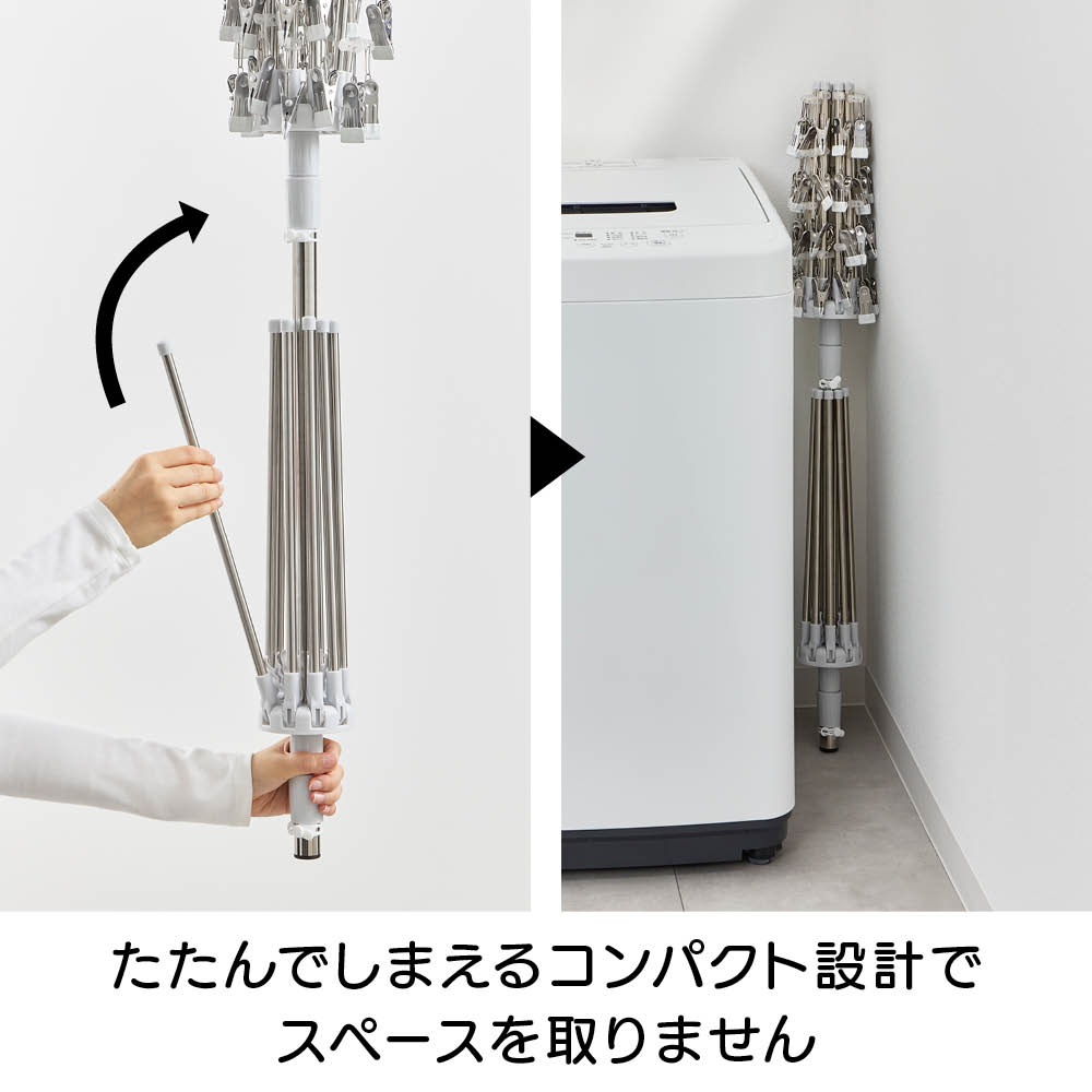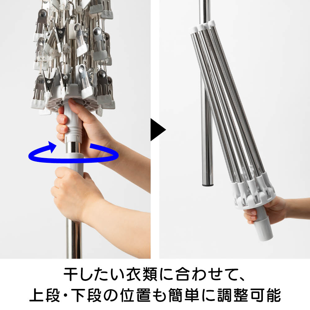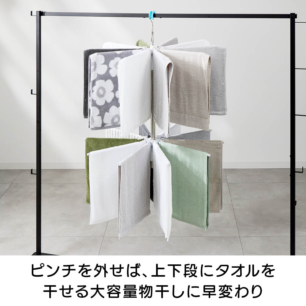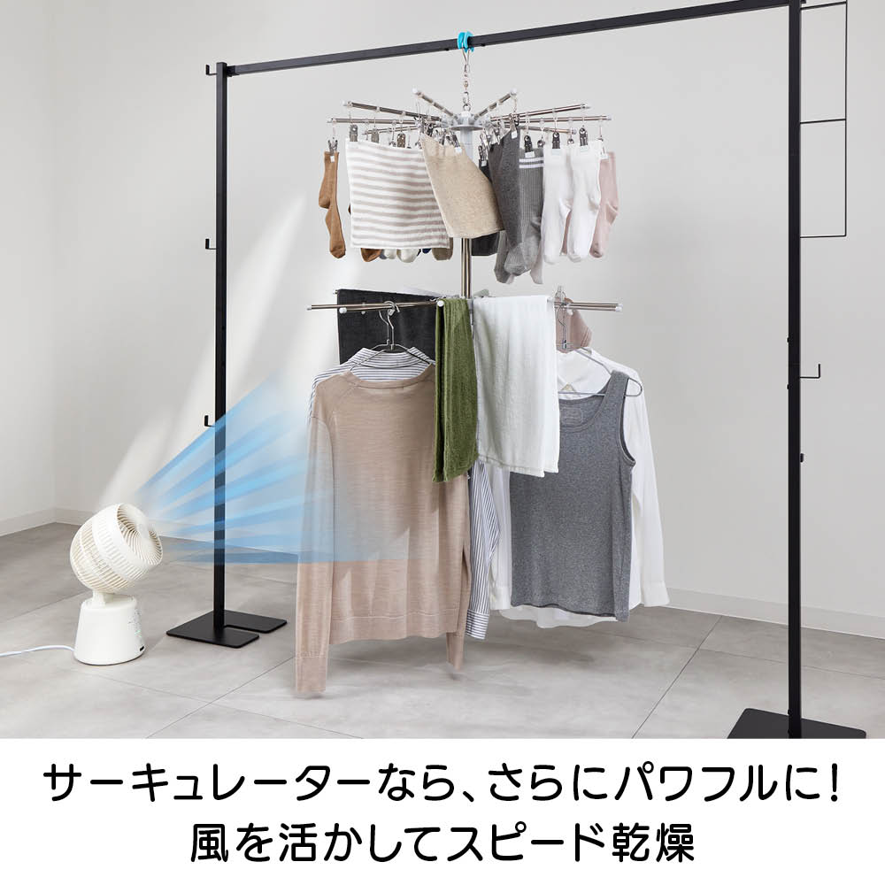 「室内干しだと洗濯物がなかなか乾かなくて邪魔…」「乾きが遅いからなんだか部屋干しのイヤなにおいがする…」などのお悩みを、くるくる回ってくるっと解決!エアコンやサーキュレーターの風で回転し、洗濯物全体に風が当たることで、乾きが早く、部屋干し臭も抑える新発想の「回る物干し」です。省スペース設計ながら、小物や衣類、タオルまできちんと干せる実力派。洗濯のプロ「洗濯ブラザーズ」と共同開発した特許出願中のディノス限定アイテムです。エアコンの風でも回る!早く乾いて部屋干し臭も軽減エアコンのゆるやかな送風でも本体がくるくる回転。洗濯物全体に風が行き渡り、スピーディーに乾かします。いやな部屋干し臭も抑えられ、毎日の洗濯が快適に。サーキュレーターなら、さらにパワフルに!風を活かしてスピード乾燥サーキュレーターの風で、よりパワフルに回転。空気が効率よく循環するので、乾きムラを防ぐことはもちろん、湿気もこもりにくく、室内環境まで快適に整います。上段は、小物が一度にたっぷり干せる40個のピンチ付き上段には、40個のピンチが付いており、ハンカチや靴下、下着などの小物を一度にたっぷり干すことができます。回転しながら効率よく乾くのでお洗濯の時短にもつながります。上段のピンチを外せば、上下段にタオルなどをたっぷり干せる!ピンチはすべて取り外し可能。上下段をポールだけの状態にすれば、タオルなどがたっぷり干せる大容量の物干しに。干したい衣類に合わせて、上段・下段の位置も簡単に調整可能ポールのジョイント部分を緩めたり、締めたりすることで、上下段ともお好きな位置に固定することができます。下段を外せば、ロング丈のアイテムもすっきり干せるワンピースやパンツ、厚手のパーカーなど、長さのある衣類も下段を外せばそのまま干すことができます。乾くスピード約20%アップ!公的機関で実証された時短効果風を受けてくるくる回ることで、従来の回転しない物干しと比べて乾燥スピードが大幅アップ。その実力は、公的機関での試験※でも証明済みです。※本商品と回転しないパラソルハンガーの比較試験。サーキュレーターの風を当て、2kgの洗濯物が乾くスピードを比較。※ユニチカガーメンテック(株)調べなぜ、微風でもくるくる回るの?ヒントは「釣り用ルアー」にありましたフック部分に、釣り用ルアーに使われるベアリングを採用。マグロなどの重い魚のつり上げにも耐える耐荷重の高いベアリングを採用することで、たくさんの洗濯物を干しても、わずかな風で回転するなめらかな動きを実現。たたんでしまえるコンパクト設計でスペースを取りませんポールを折りたためば、幅わずか約9cm程度に。使わないときは、洗面スペースの隙間などに立てかけて収納できます。洗濯をもっとハッピーに!「洗濯ブラザーズ×ディノス」の物干し革命アメリカのヴィンテージ物干しにヒントを得て開発した新発想の物干しです。最大の特長は、微風でもくるくる回って洗濯物に風が均一に当たるため、「早く乾く・ニオわない・自然乾燥で生地を傷めにくい」こと。その実力は、通常の物干しに比べ、厚手のタオルやデニムなどの乾く時間を約20%短縮という結果が証明しています※。さらに、たっぷり干せるデザインとコンパクトにたためる収納性にも徹底してこだわりました。毎日の“干す”が変われば、洗濯はもっと楽しくなる。そんな新しい洗濯体験を、ぜひあなたの毎日にどうぞ。※メーカー検証結果