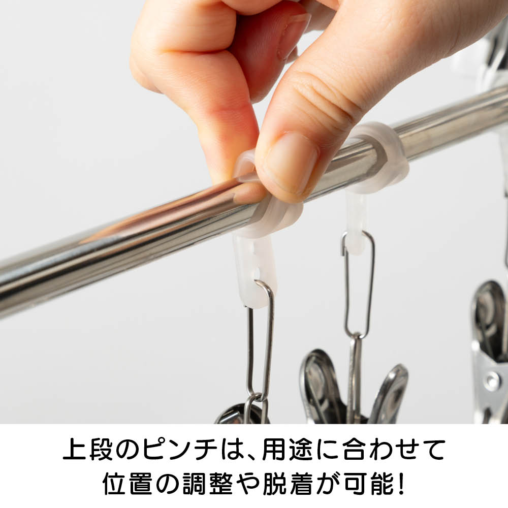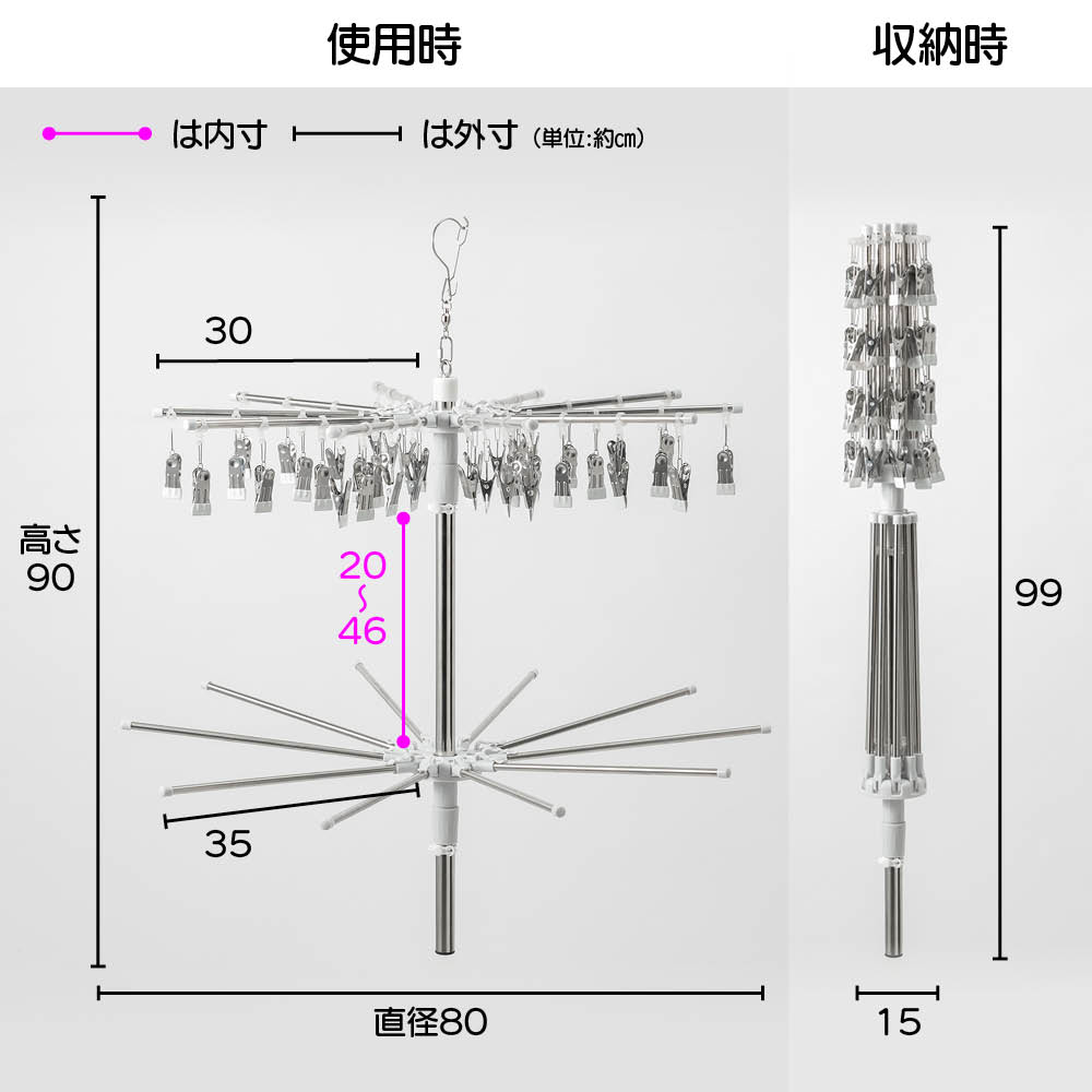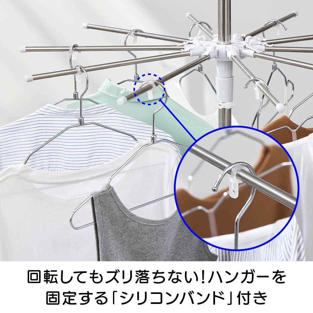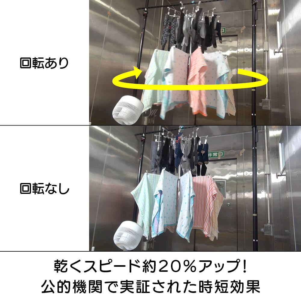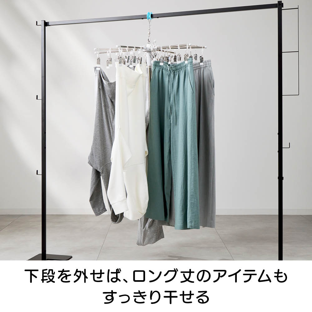 「室内干しだと洗濯物がなかなか乾かなくて邪魔…」「乾きが遅いからなんだか部屋干しのイヤなにおいがする…」などのお悩みを、くるくる回ってくるっと解決!エアコンやサーキュレーターの風で回転し、洗濯物全体に風が当たることで、乾きが早く、部屋干し臭も抑える新発想の「回る物干し」です。省スペース設計ながら、小物や衣類、タオルまできちんと干せる実力派。洗濯のプロ「洗濯ブラザーズ」と共同開発した特許出願中のディノス限定アイテムです。エアコンの風でも回る!早く乾いて部屋干し臭も軽減エアコンのゆるやかな送風でも本体がくるくる回転。洗濯物全体に風が行き渡り、スピーディーに乾かします。いやな部屋干し臭も抑えられ、毎日の洗濯が快適に。サーキュレーターなら、さらにパワフルに!風を活かしてスピード乾燥サーキュレーターの風で、よりパワフルに回転。空気が効率よく循環するので、乾きムラを防ぐことはもちろん、湿気もこもりにくく、室内環境まで快適に整います。上段は、小物が一度にたっぷり干せる40個のピンチ付き上段には、40個のピンチが付いており、ハンカチや靴下、下着などの小物を一度にたっぷり干すことができます。回転しながら効率よく乾くのでお洗濯の時短にもつながります。上段のピンチを外せば、上下段にタオルなどをたっぷり干せる!ピンチはすべて取り外し可能。上下段をポールだけの状態にすれば、タオルなどがたっぷり干せる大容量の物干しに。干したい衣類に合わせて、上段・下段の位置も簡単に調整可能ポールのジョイント部分を緩めたり、締めたりすることで、上下段ともお好きな位置に固定することができます。下段を外せば、ロング丈のアイテムもすっきり干せるワンピースやパンツ、厚手のパーカーなど、長さのある衣類も下段を外せばそのまま干すことができます。乾くスピード約20%アップ!公的機関で実証された時短効果風を受けてくるくる回ることで、従来の回転しない物干しと比べて乾燥スピードが大幅アップ。その実力は、公的機関での試験※でも証明済みです。※本商品と回転しないパラソルハンガーの比較試験。サーキュレーターの風を当て、2kgの洗濯物が乾くスピードを比較。※ユニチカガーメンテック(株)調べなぜ、微風でもくるくる回るの?ヒントは「釣り用ルアー」にありましたフック部分に、釣り用ルアーに使われるベアリングを採用。マグロなどの重い魚のつり上げにも耐える耐荷重の高いベアリングを採用することで、たくさんの洗濯物を干しても、わずかな風で回転するなめらかな動きを実現。たたんでしまえるコンパクト設計でスペースを取りませんポールを折りたためば、幅わずか約9cm程度に。使わないときは、洗面スペースの隙間などに立てかけて収納できます。洗濯をもっとハッピーに!「洗濯ブラザーズ×ディノス」の物干し革命アメリカのヴィンテージ物干しにヒントを得て開発した新発想の物干しです。最大の特長は、微風でもくるくる回って洗濯物に風が均一に当たるため、「早く乾く・ニオわない・自然乾燥で生地を傷めにくい」こと。その実力は、通常の物干しに比べ、厚手のタオルやデニムなどの乾く時間を約20%短縮という結果が証明しています※。さらに、たっぷり干せるデザインとコンパクトにたためる収納性にも徹底してこだわりました。毎日の“干す”が変われば、洗濯はもっと楽しくなる。そんな新しい洗濯体験を、ぜひあなたの毎日にどうぞ。※メーカー検証結果
