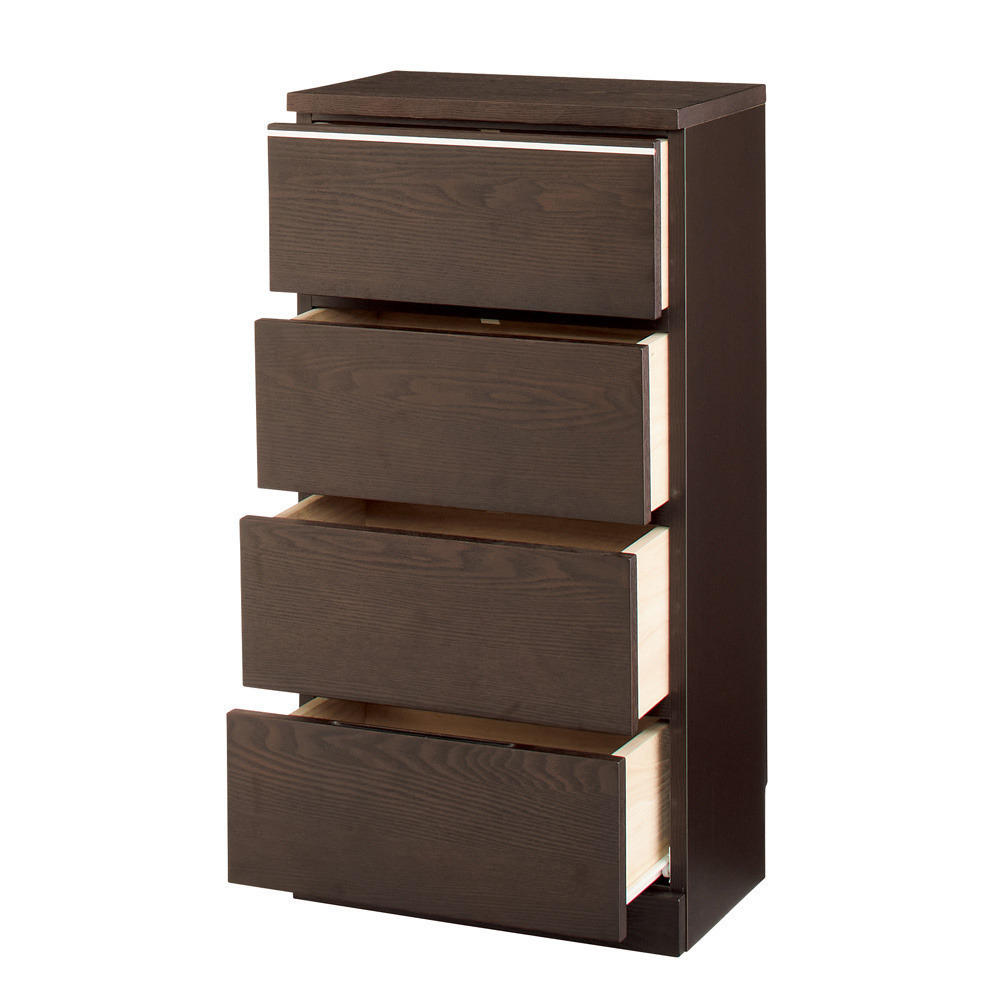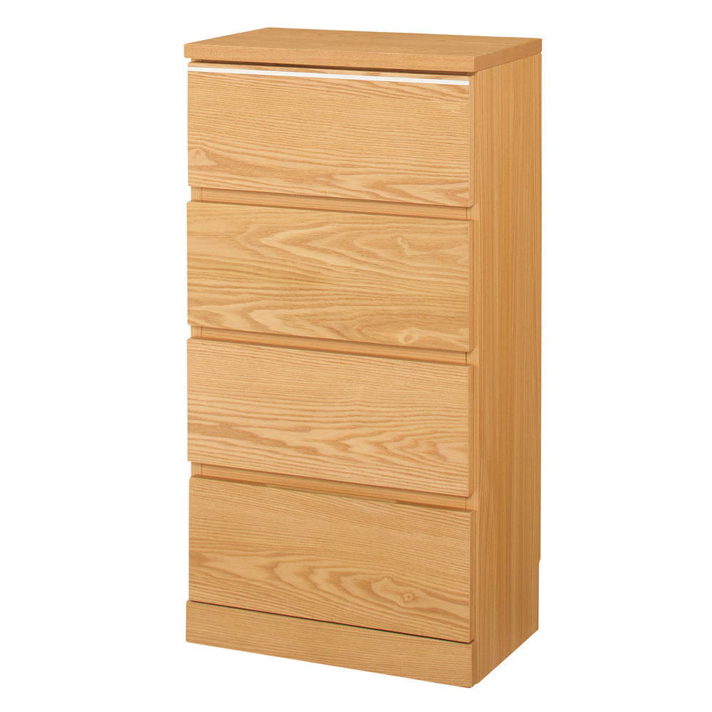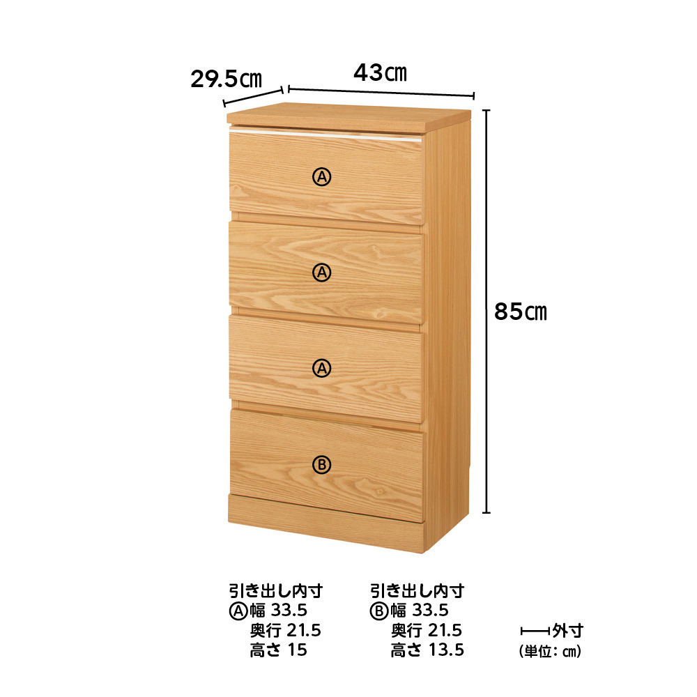 タモ天然木の美しい木目にアルミラインがアクセントになり、ご自宅に洗練された機能的なワークスペースが誕生します。細かいものがまとめて片付く引き出し4段のチェストは、整然としたワークスペースづくりの必需品。シンプルながら細部まで配慮された仕様で、テレワークを効率アップします。ダークブラウン 写真はデスク幅150cmタイプ、デスクワゴン、チェスト、キャビネット4枚扉タイプの組み合わせです ※チェアは商品に含まれません。天然木×アルミラインがスタイリッシュ。ご自宅に本格的なワークスペースをテレワークの時間が多くなり、落ち着いて集中できる自分専用の執務スペースがほしい。そんな方におすすめのシリーズです。シンプルでスタンダードなデザイン、天然木にアルミラインがクールな各種アイテムが揃い、統一感のあるトータルコーディネートが可能。空間に落ち着きと洗練を演出します。※シリーズ商品には、デスク3サイズ、デスクワゴン、チェスト、キャビネット2サイズがございます。ナチュラル 写真はキャビネット2枚扉、キャビネット4枚扉との組み合わせです。オフィス家具の機能性を、天然木のぬくもり感でテレワークで使う事務用品やパソコン周辺機器などは意外に多く、収納場所に困るもの。そこで、自宅オフィスに欠かせない機能的な収納を、天然木の美しさで実現しました。引き出し4段のチェストは、さまざまな小物類を用途別などに仕分けでき、”隠す収納”でお部屋がすっきり。オフィス家具の定番、扉付きキャビネット(別売り)と組み合わせれば、さらに便利に!ナチュラルシンプルながら、使いやすさの工夫が充実木目の美しさが際立つ、引き手のないデザイン。奥行29.5cmの省スペース設計に加え、幅木よけカットがあり、壁ぴったりに設置できるのも狭いお部屋にはうれしいポイント。背面も化粧仕上げなので、多彩なレイアウトが可能です。組立不要ですぐ使える完成品でお届けします。写真左:ナチュラル 写真右:ダークブラウン天然木の風合いを生かした上質感あふれる2カラーカラーは明るい雰囲気の(ア)ナチュラル、重厚感のある(イ)ブラウンの2色展開で、天板・前板はタモ天然木(突板)の木目を生かした美しい仕上がり。表面には傷に強いウレタン塗装を施しています。贅沢に使用した天然木とアクセントのアルミラインのデザインが魅力天板だけでなく、引き出し前板や脚部にも天然木をたっぷりと使用。はっきりとした木目で、1点1点異なる表情が楽しめます。アクセントに施されたアルミラインは、表面に溝を彫って埋め込むという手間ひまかかった職人仕事です。ダークブラウン整理整頓に役立つ引き出しが4段。最下段はスライドレール付きで開閉もスムーズ書類の仕分けや予備の文具、ケーブル類の整理などにも活躍。また、奥行29.5cmとスリムな設計だから、寝室やリビングで衣類や生活用品を整頓する収納としても便利です。最下段にはスライドレール付きなので、重たいものを入れても開閉がスムーズです。引き出し内寸:上から1〜3段目…幅36cm奥行21.5cm高さ15cm、4段目…幅33.5cm奥行21.5cm高さ13.5cm ※ストッパーはついていません。