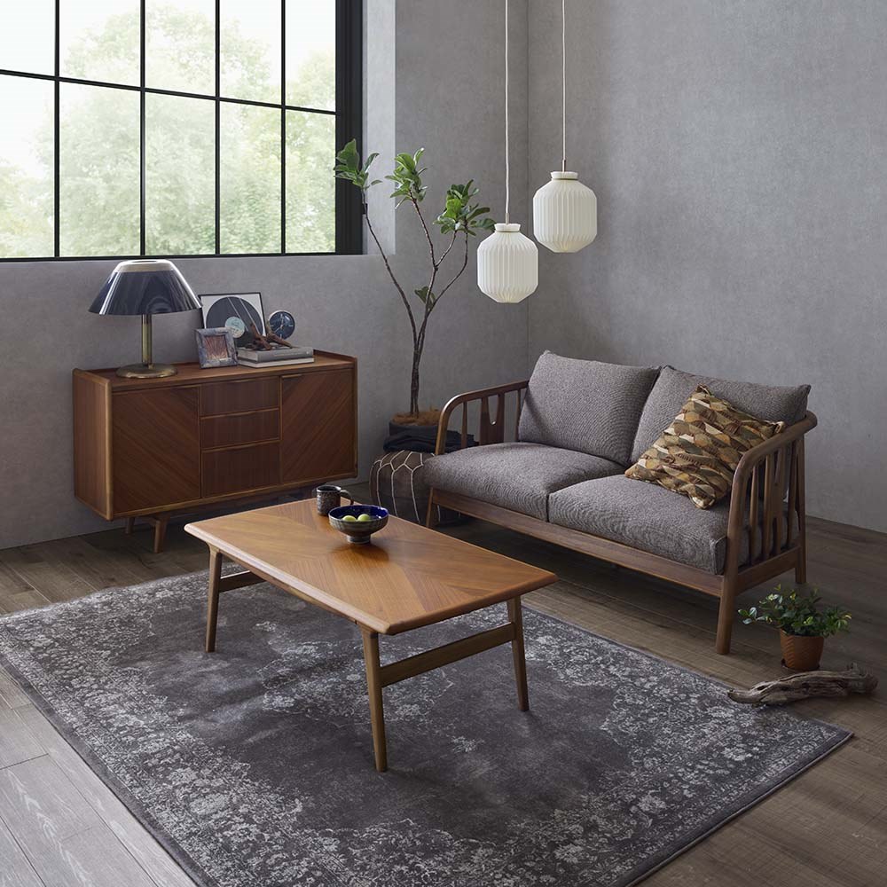 風合いと愛着深まる北欧ヴィンテージの世界。北欧デンマークに惹かれたヴィンテージの世界1940〜1960年代に黄金期を迎えた、今に語り継がれる北欧家具のスタイル「デンマーク・モダン」。矢羽根模様など、どこか懐かしさを感じさせる家具に木の風合いを添えたソファ。そこに、長きにわたって愛されたシェードデザインに、新たな魅力を与えたデンマークの名品ライトをあわせ、過ごすほどに愛着の湧く空間をしつらえました。細部にこだわる、テーブルのディテールテーブルはウォルナットの化粧板を矢張りで合わせた仕様。見る向きや角度によって表情を変える姿には、細部に渡るこだわりが映えます。天然木にこだわった、商品づくりテーブルのフレームにはアカシアの天然木をふんだんにつかい、デザインにこだわりました。ソファ、キャビネットにも同じ「アカシア」が使われており、シリーズで揃えて愉しめるデザインになっています。【D-modern】デンマーク・モダンが息づくHOUSE STYLINGの新ブランド。味わい深いアカシア材をはじめ、長く愛せるヴィンテージデザインにこだわりました。