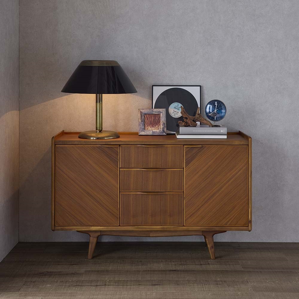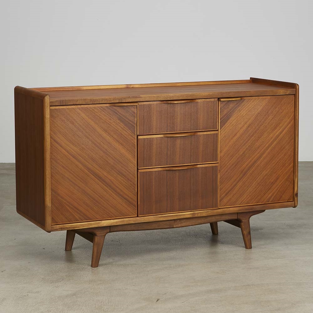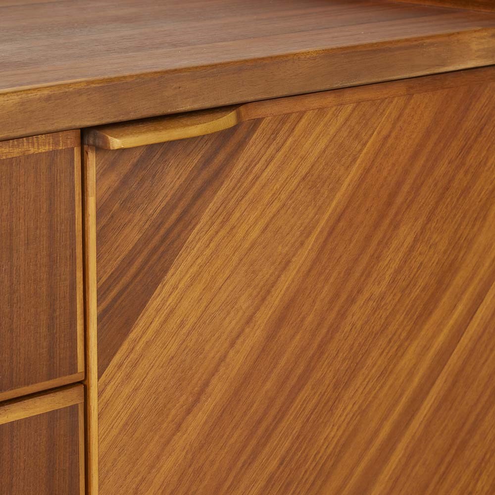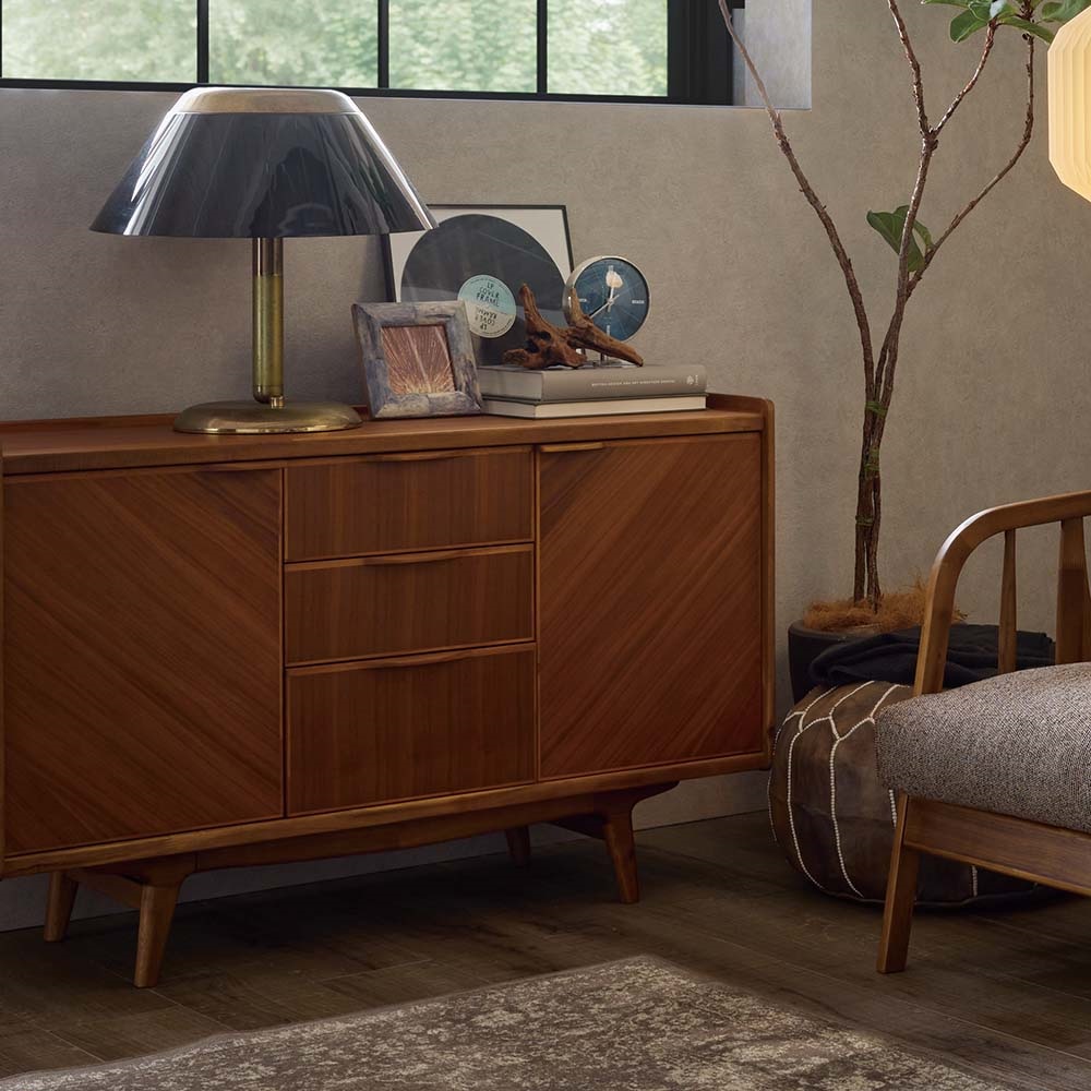 風合いと愛着深まる北欧ヴィンテージの世界。ハイタイプのテレビ台としても使える、リビングに置けるサイドキャビネット。北欧デンマークに惹かれたヴィンテージの世界1940〜1960年代に黄金期を迎えた、今に語り継がれる北欧家具のスタイル「デンマーク・モダン」。矢羽根模様など、どこか懐かしさを感じさせる家具に木の風合いを添えたソファ。そこに、長きにわたって愛されたシェードデザインに、新たな魅力を与えたデンマークの名品ライトをあわせ、過ごすほどに愛着の湧く空間をしつらえました。細部にこだわる、キャビネットのディテールキャビネットの前板にはウォルナットの化粧板を矢張りの様に合わせた仕様。見る向きや角度によって表情を変える姿には、細部に渡るこだわりが映えます。中央の引き出しとサイドの開き扉でリビング回りの収納物をしっかりと収納できます。天然木にこだわった、商品づくりテーブルのフレームにはアカシアの天然木をふんだんにつかい、デザインにこだわりました。ソファ、ローテーブルにも同じ「アカシア」が使われており、シリーズで揃えて愉しめるデザインになっています。【D-modern】デンマーク・モダンが息づくHOUSE STYLINGの新ブランド。味わい深いアカシア材をはじめ、長く愛せるヴィンテージデザインにこだわりました。
