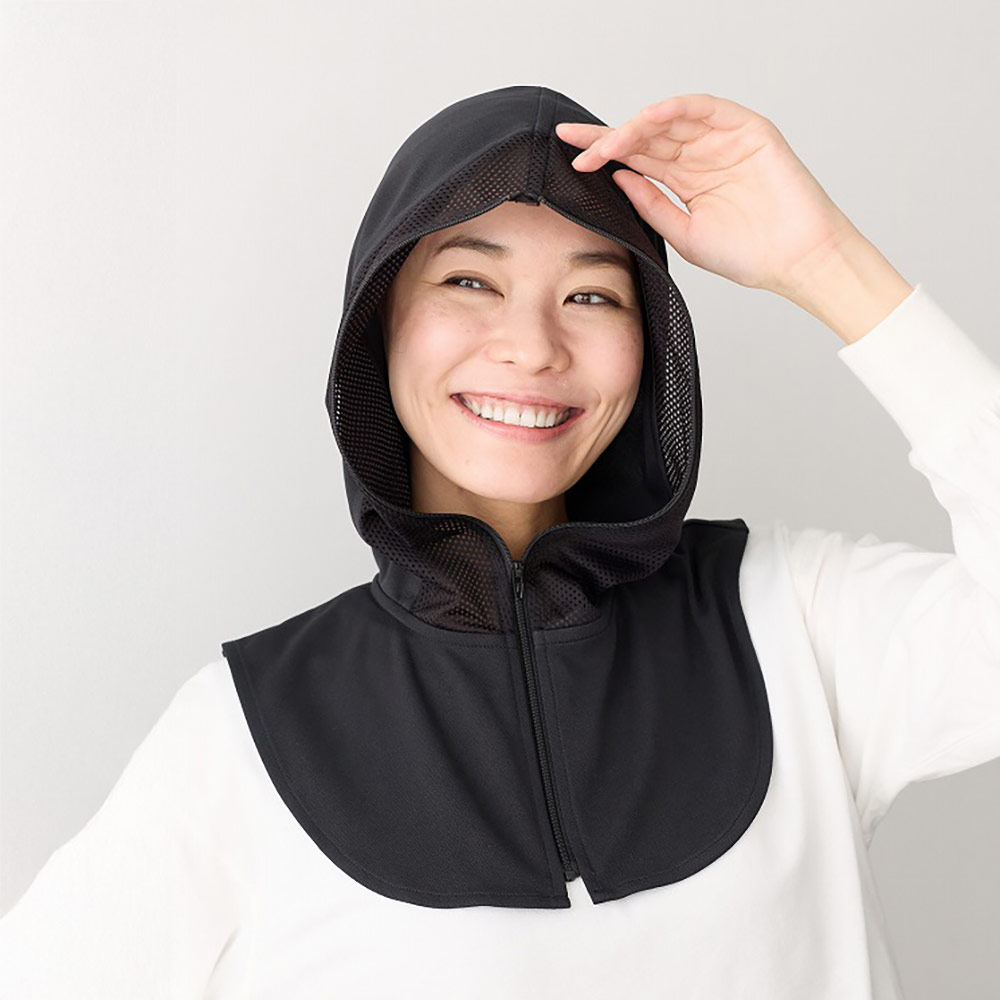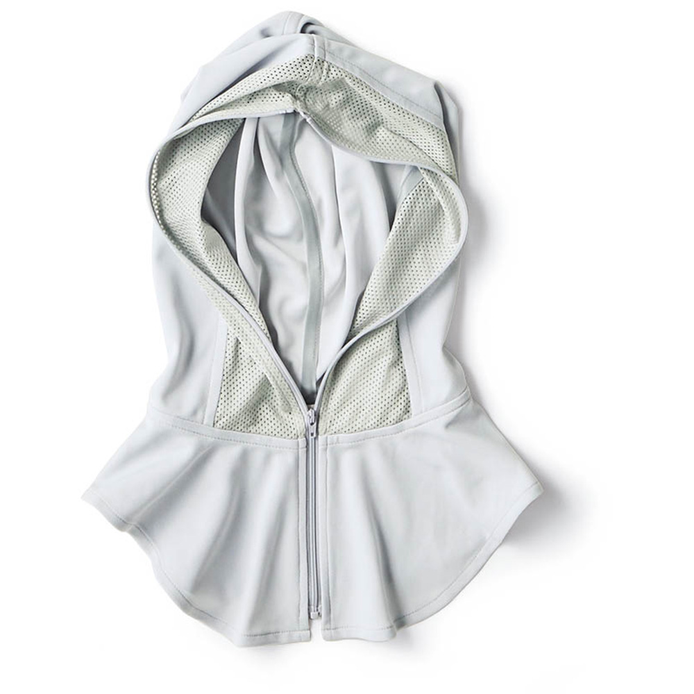 すっぽり覆える、顔まわりの紫外線対策に便利なパーフェクトガード。顔までメッシュですっぽり覆えるパーフェクトガード(実用新案登録 登録第3253186号)フード付きウェアのフード部分を切り取ったようなデザインで、顔まわりの紫外線対策に便利なパーフェクトガード。フード先までファスナーを閉めると顔まわりを全て覆うことも可能。降り注ぐ紫外線から頭や首、顔まわりをしっかりガードし、帽子や日傘も必要ありません。素材には吸水速乾性・通気性に優れるCOOLMAX(R)を使用しており、汗をかいてもベタつかずドライで快適な着用感です。サッと着けられ、ガーデニングや散歩、屋外での観戦やレジャーシーンなど幅広く重宝します。※フード先までファスナーを閉じても、メッシュを通してある程度の視界が確保されます。上空からの紫外線を防いでも、紫外線は地面からも反射して襲ってきます。パーフェクトガードなら下からの紫外線も防御可能で、あらゆる角度から紫外線をカットします。(紫外線はアスファルトだけでなく地面や水辺でも反射します)顔まわりの紫外線対策に便利なパーフェクトガード薄くて柔らかい生地は紫外線カットや吸水速乾機能、通気性も兼ね備えた暑い時期にぴったりの素材で、メッシュ部分は風を通すので長時間の着用も快適です。・紫外線遮蔽率 本体身生地:COOLMAXブラック約97% COOLMAXグレー約90%※COOLMAX(R)はThe LYCRA Companyの商標です。・【本体生地機能】紫外線遮蔽/吸水速乾/通気性・シワになりにくく、持ち運びに便利グレー