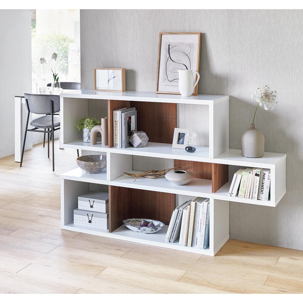 斬新でモダンなツートーンカラーがスタイリッシュなシェルフ。オブジェのように置くだけでリビングのアクセントに。カラーはホワイト・ウォルナット・オークの3色。5段シェルフもあります。日本国内ではディノスだけの取り扱い商品です。斬新でモダンな感覚が印象的なオープンタイプのブックシェルフ●2010年のミラノサローネで発表されたTEMAHOMEの商品です。●アンシンメトリーなデザインシェルフは天然木の杢目が奏でる個性が演出しお部屋にモダンな華やかさをプラス。●本棚としてはもちろんインテリア雑貨の飾り棚として収納力もたっぷり。●ヨーロッパではダイニングテーブル横に設置して食器棚としても使われています。●本体とパネル式のバックボードのカラーが、ツートーンでデザインのアクセントになっています。●リビングルームに微妙なニュアンスを加える、個性的なアイテムを選んでみませんか。●上下左右は組立時に選ぶことができます。●シンプルでありながら細部まで丁寧に仕上げられたポルトガル製家具をお楽しみください。デザイナー、リカルド・マルサルのコメントあわただしいロンドンの街をモチーフにしたこのシェルフ。カリスマ的であり機能的でもあります。異なる色と素材の組み合わせにより、どんなインテリアにも合わせられます。片側から押し出されたかのようなジグザグのデザインの面白みもあります。単体でももちろん、複数で並べても面白いでしょう。このシェルフの使い方は、お客様の自由です。どんなお部屋でもきっと満足のゆく空間になるでしょう。It is a quite different shelving from what we are used to see. Inspired by the hectic life of London、 this modular bookshelf presents a charismatic、 yet truly functional product. The variety of finishes makes it versatile for every sort of interior.Aesthetically it is very interesting、 as if the sides were separated and pushed away to create a zigzag.Goes well individually or joined with other modules、 more than one unit gets a better effect in the room.The user can set its imagination free and adapt this piece to create the desired ambiance.by Richard Marcal【TEMAHOME】テマホームTEMAHOMEはポルトガル最大の輸出量を誇る家具メーカー。世界40ヶ国1300以上の店舗に商品を供給しています。「使う人の思い思いのライフスタイルを実現してほしい」という願いを込めた「Living your Dreams」というスローガンのもと、自社デザイナー、そして外部の著名デザイナーと開発したプロダクトを次々と発表。ケルン(ドイツ)、ミラノ(イタリア)、ラスベガスとハイ・ポイント(アメリカ)の世界4大家具展示会にて新作を発表しています。シンプルながら、ヨーロッパの香りあふれる「日常のモダン」を感じられる家具として、世界中にファンを増やし続けています。