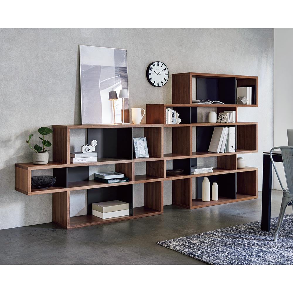 ワークスペースにも映えるアンシンメトリーなデザインシェルフ。左が3段、右が5段のコーディネート例(イ)ウォルナット
