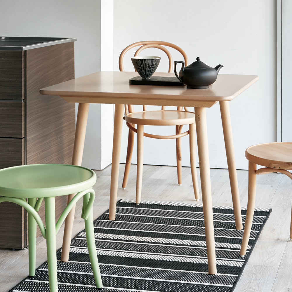 100年以上の歴史あるチェコTON社からベーシックなテーパー脚のダイニングテーブル。シンプルなデザインだからこそ、どんなチェアともセットできます。ダイニングルームの色は食欲と結びついているので、家具の色選びもとても大事。テーブルとチェアを違う色の組み合わせに挑戦するのも、楽しいダイニングルーム作りのポイントです。長く使えるベーシックなデザインだから、どんなスタイルのインテリアにも合わせやすいのも嬉しい。世界中から愛さ続ける曲げ木細工の老舗「TON(トン)社」1858年、世界的家具メーカー「トーネット社」の源流となる曲げ木工場をスタートさせた、ドイツ生まれの家具職人「ミヒャエル・トーネット」。ミヒャエルが発明した、硬い天然木を蒸して柔らかくしカーブをつけるという画期的な「曲げ木技法」により、椅子デザインの美しさと量産化が大幅に進化し、バウハウスをはじめとした後世のデザインと家具の工業化に大きな影響を与えました。チェコのビストリッチェ工場は1953年には社名を現在の「TON(曲げ木家具工場の略語)」にあらため、150年以上変わらない伝統的で上質な曲げ木家具メーカーとして、年間50万台以上の家具を製造。「TON」の製品は、軽く丈夫で値段も手頃なため、世界中のカフェやレストランなどで愛用されています。ハウススタイリングは、TON(トン)の正規販売店ですディノス・ハウススタイリングは、チェコのTON(トン)社の製品の正規販売店です。並行輸入品やリプロダクト、ジェネリックと称するコピー商品は販売しておりません。